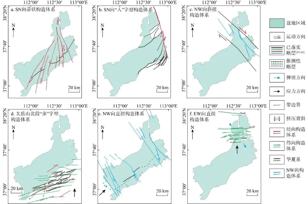 (3)盆地拉张方向上表现为山西−陕西的整体右旋导致的NW-SE向拉张模式为主,NNE向的拉分在盆地内没表现出明显的效应。