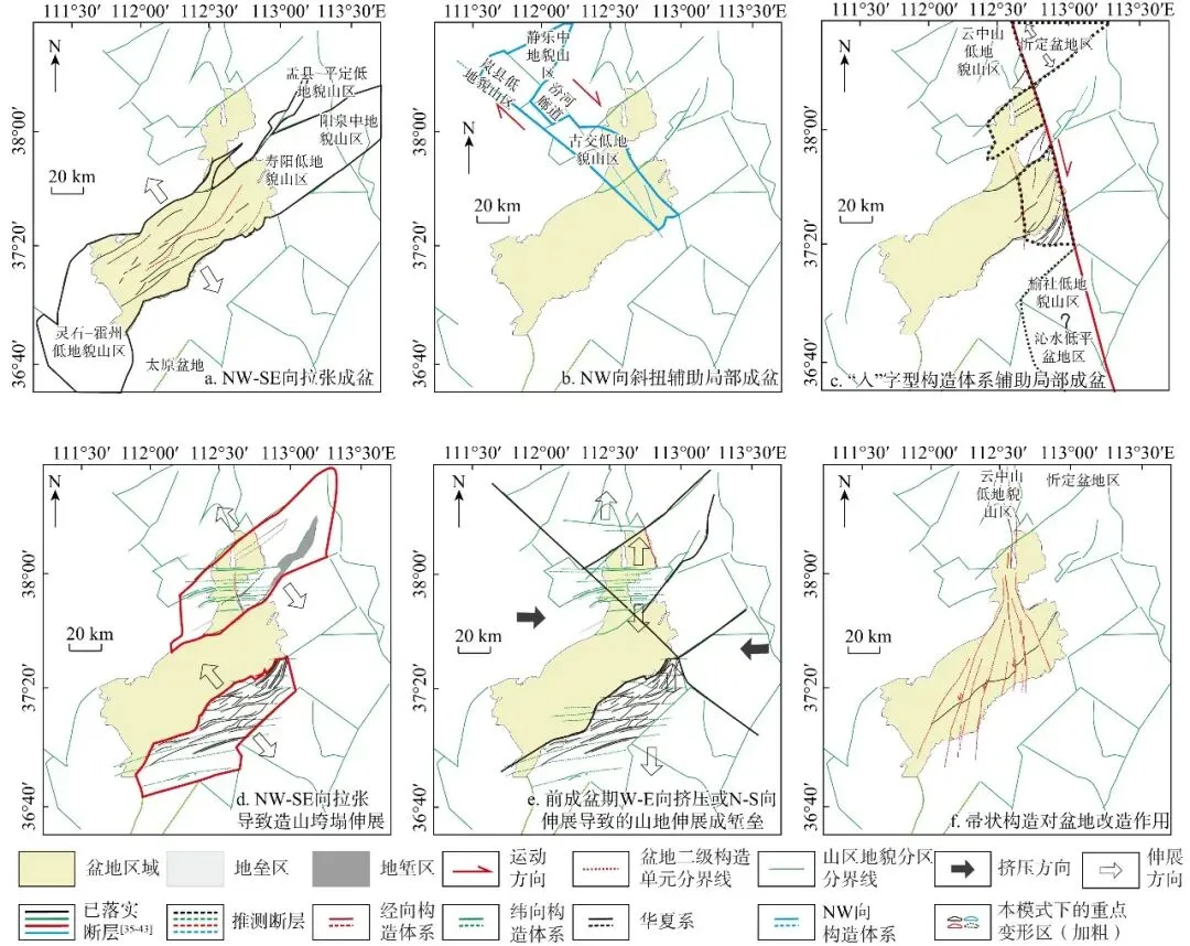 (2)推断出了6种成盆或者对成盆活动有贡献的区域活动模式,体现了盆地形成和围区山地地貌区的形成具有联动性和机制统一性,山西地堑系的伸展是阶段性的含围区造山带的伸展垮塌的全地域伸展垮塌,这种全地域的伸展垮塌在地貌上有超越盆地范畴的更大区域的宏观地貌表现。