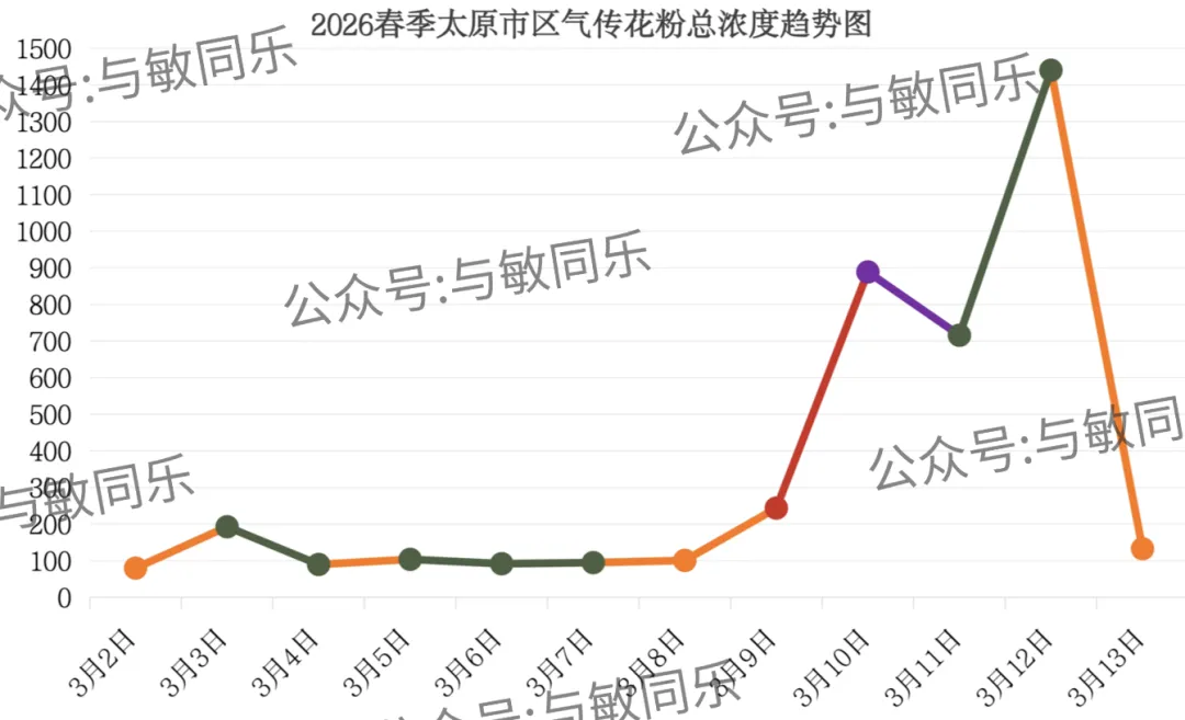 3月13日早8点至3月14日早8点:花粉总数在101~300(粒/1000mm²)之间,花粉总浓度为三级(花粉浓度偏高)。
