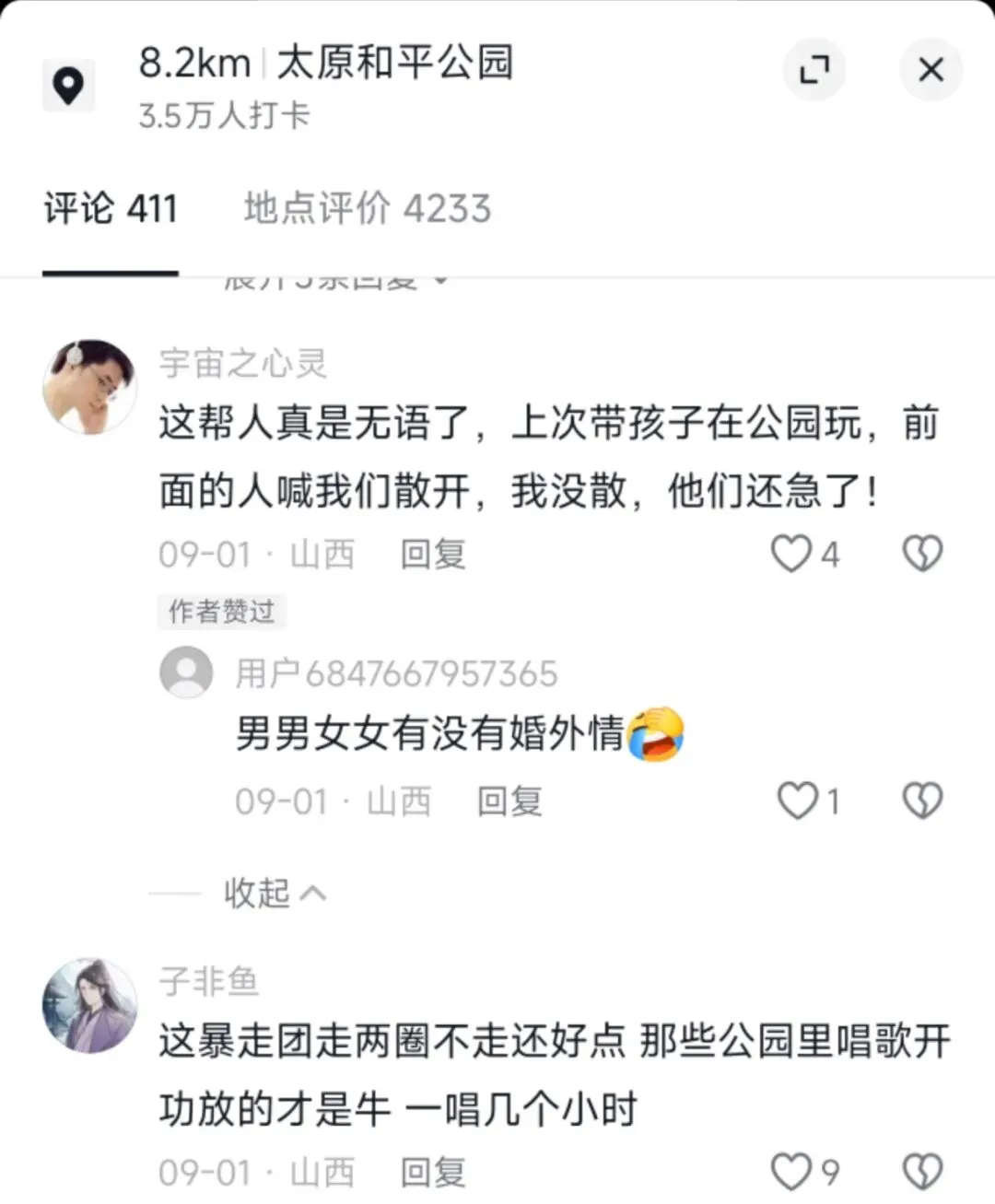 我挺好奇的,便去抖音上查了查,发现吐槽和平公园暴走团的太原网友还真不少。大家都是不堪其扰。