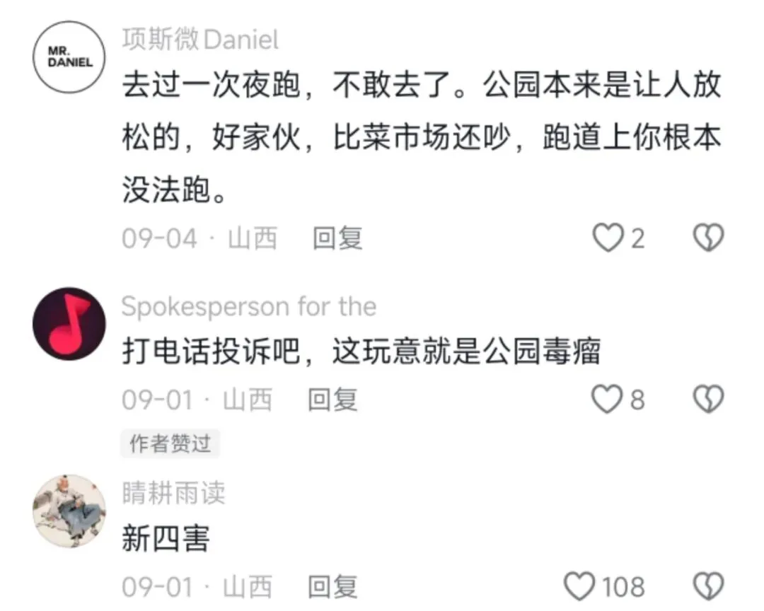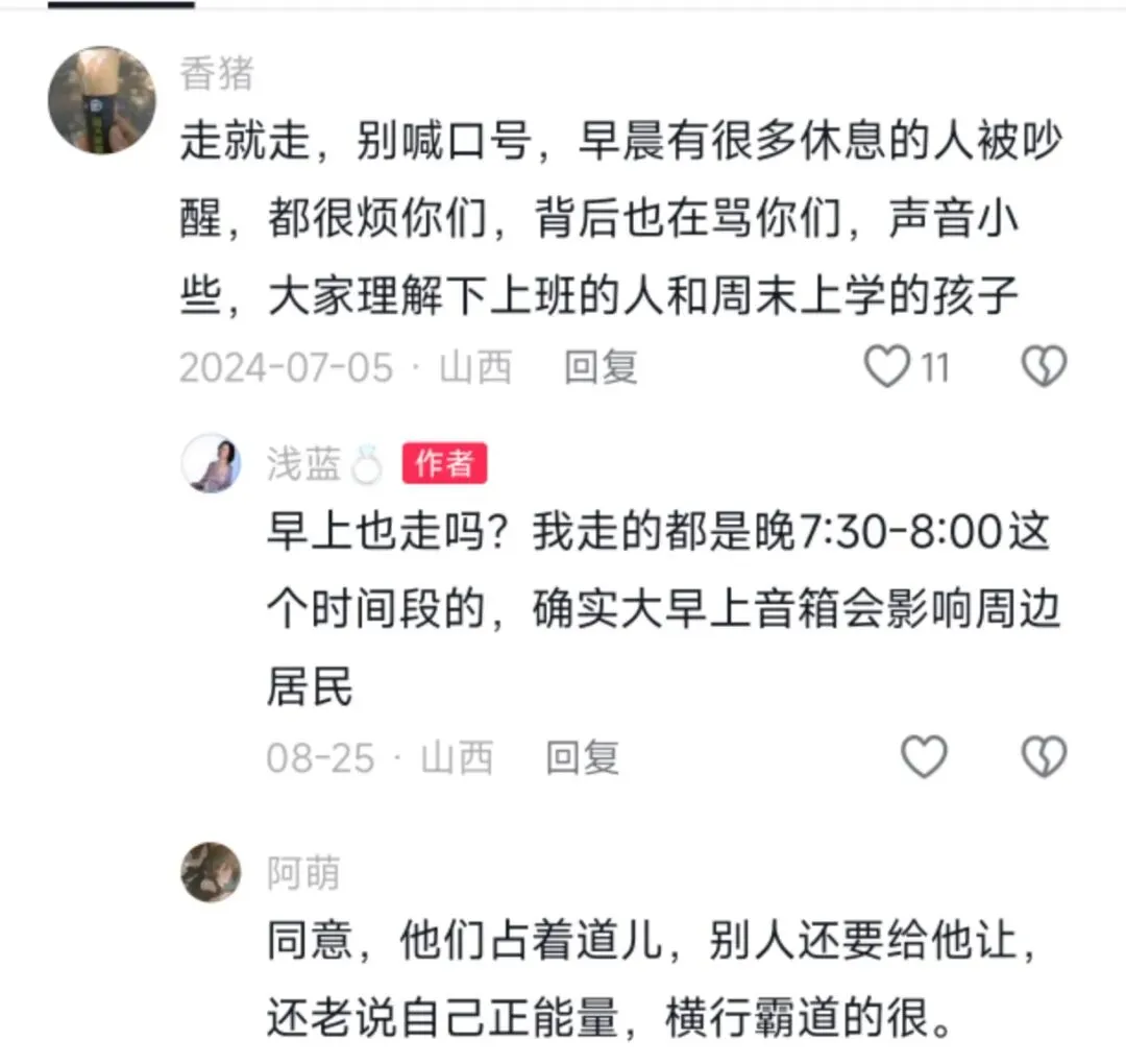 晚上还好,主要是一大早的,谁能受得了呢。明明是打着“健身”的旗号,怎么就变了味呢?