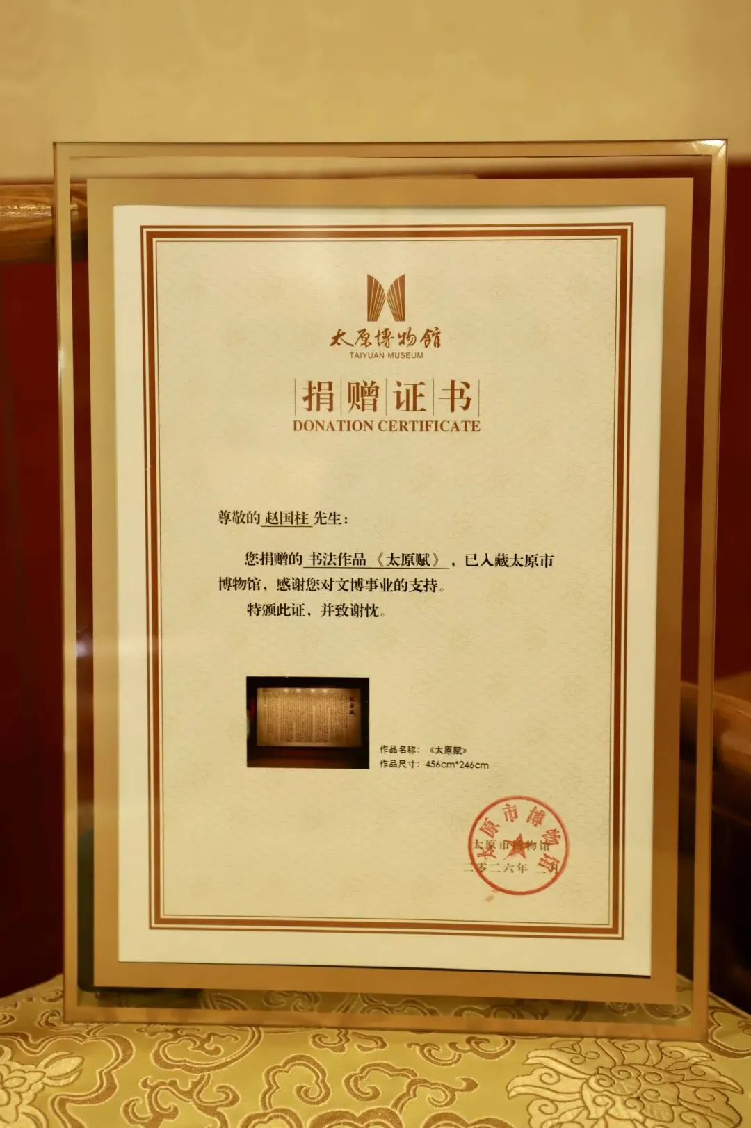 此次捐赠,不仅丰富了太原市博物馆的现当代艺术收藏,也为公众提供了一个欣赏精湛书法艺术、感悟太原历史文脉的宝贵窗口。太原市博物馆将对这件作品进行妥善保存、深入研究与常态展示,使其承载的文化记忆与艺术价值得以长久传承,持续滋养城市的文化生活。