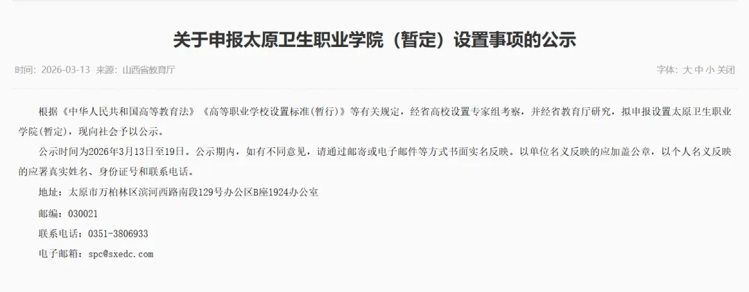 近日,山西省教育厅发布《关于申报太原卫生职业学院(暂定)设置事项的公示》。