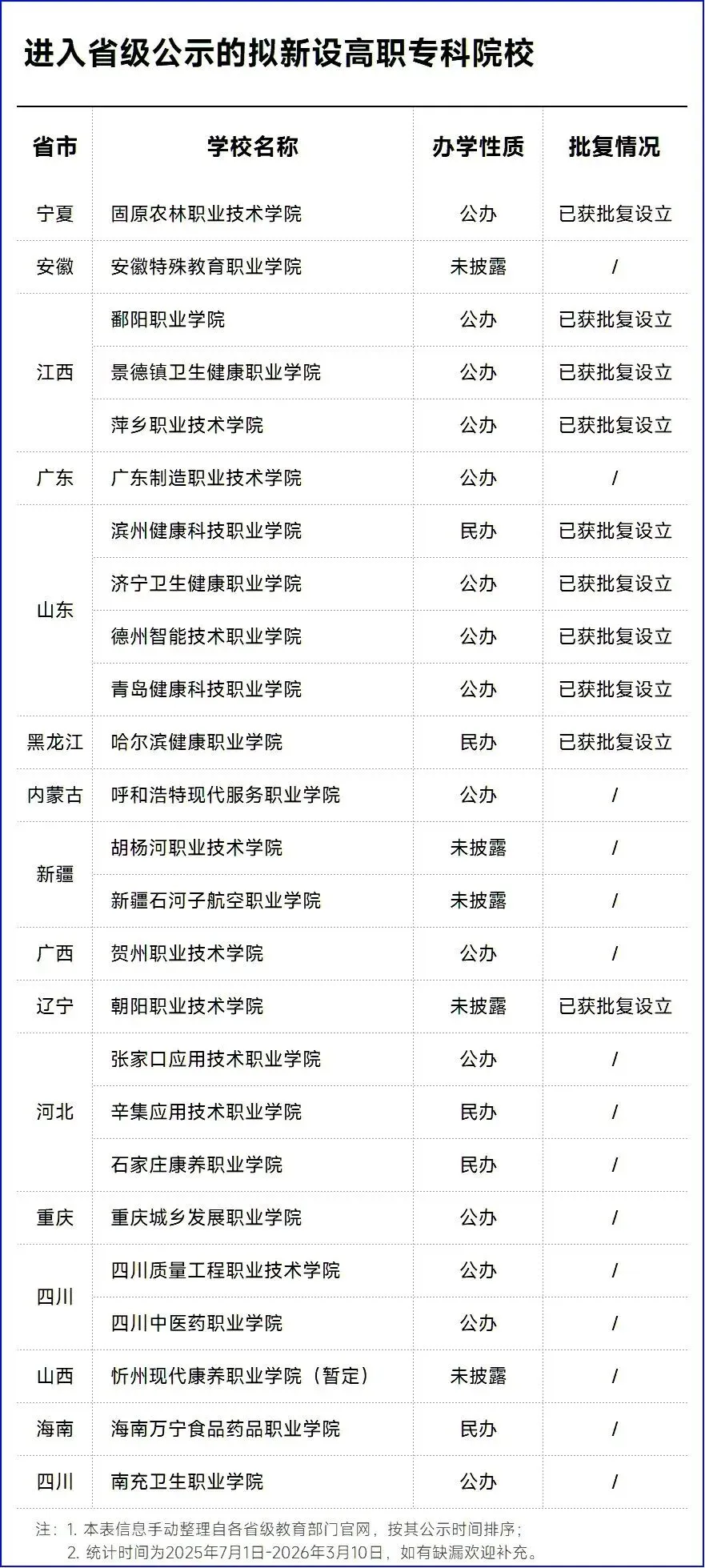 截至发文,据不完全统计,2025年7月以来共26所拟新设专科层次高职院校进入省级教育部门公示,其中已有10所获得省级人民政府批复设立。