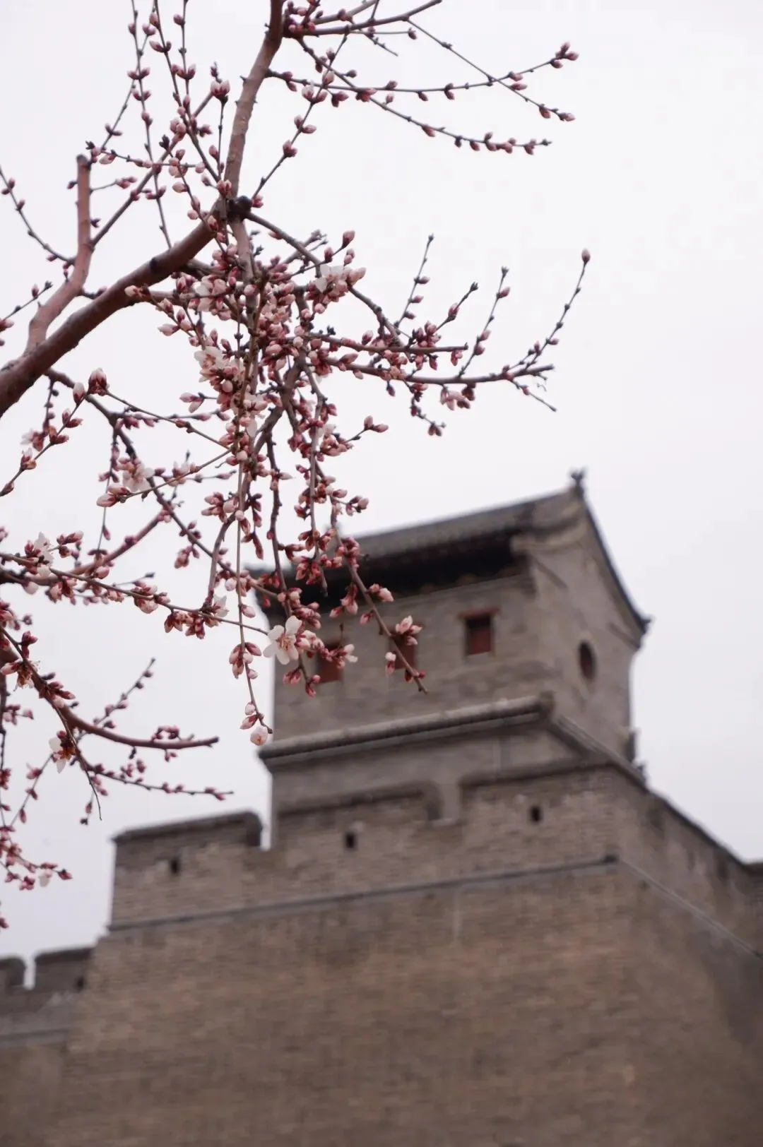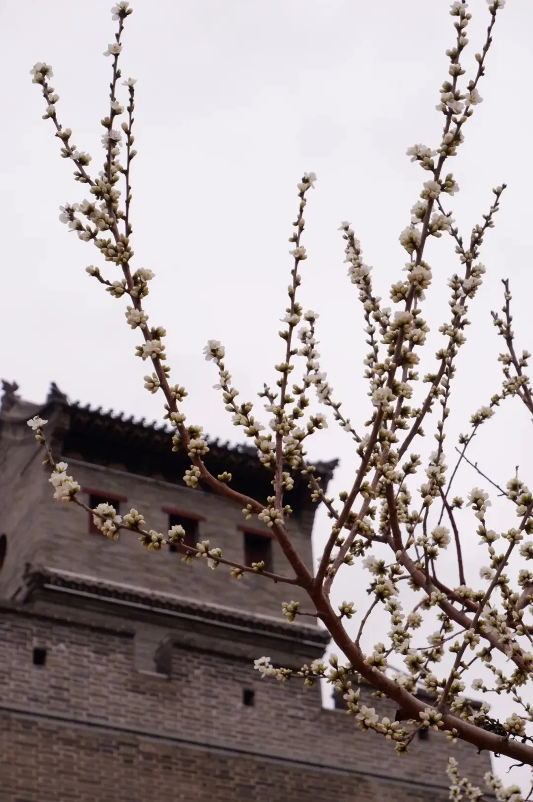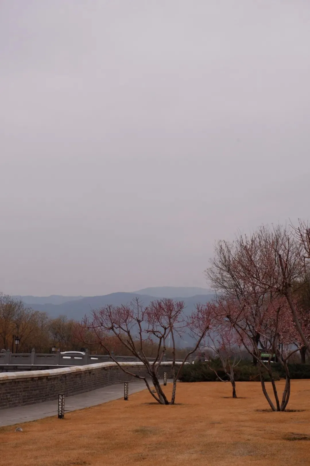 护城河静静地流着,我跟着它走。远远地,朦朦胧胧看到隐约的花树,在阴雨天灰色的背景里有点好看,这恐怕是任何艺术家都画不出来的色彩。浅浅淡淡的、柔柔润润的,好像春天真的是一阵风似的,不小心给它们吹出了一点色彩。再加上周围的城墙、护城河、树在水中的倒影,局部竟有点烟柳画桥的错觉。走近发现,有那么几朵花认真地开着,花瓣舒展着,完全不因为天色阴沉就敷衍了事。它们在灰色的背景里显得格外夺目,几乎是在发光。这样的景致,实在相配,实在让人愉悦。
