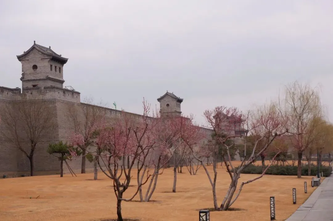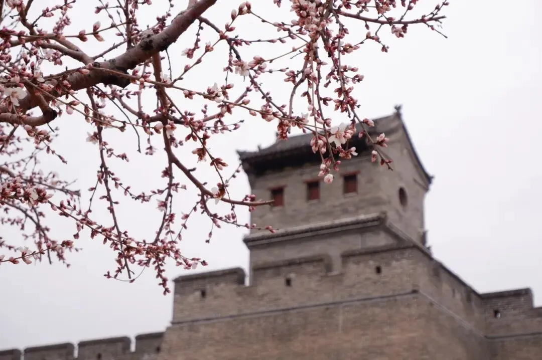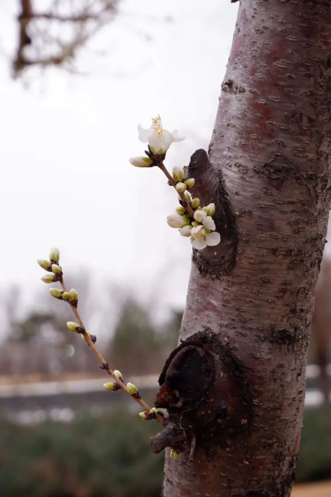护城河静静地流着,我跟着它走。远远地,朦朦胧胧看到隐约的花树,在阴雨天灰色的背景里有点好看,这恐怕是任何艺术家都画不出来的色彩。浅浅淡淡的、柔柔润润的,好像春天真的是一阵风似的,不小心给它们吹出了一点色彩。再加上周围的城墙、护城河、树在水中的倒影,局部竟有点烟柳画桥的错觉。走近发现,有那么几朵花认真地开着,花瓣舒展着,完全不因为天色阴沉就敷衍了事。它们在灰色的背景里显得格外夺目,几乎是在发光。这样的景致,实在相配,实在让人愉悦。
