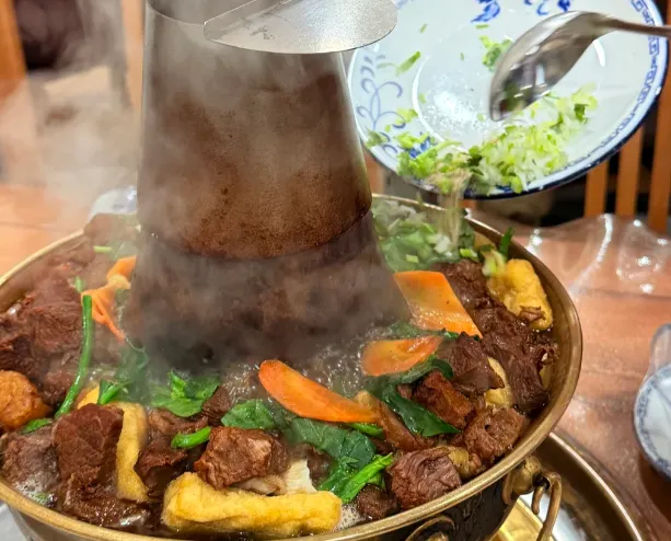 如果只选一道代表菜,我会选大同铜火锅。做法不复杂:筒骨先熬底汤,铜锅里铺白菜、冻豆腐、粉条和丸子,再下羊肉片,小火慢炖。关键不是猛火快煮,而是让汤把食材一点点“带熟”。最后撒蒜苗,汤一喝,人就醒了。
