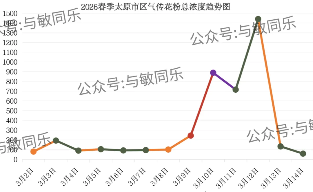 3月14日早8点至3月15日早8点:花粉总数在51~100(粒/1000mm²)之间,花粉总浓度为二级(花粉浓度较低)。