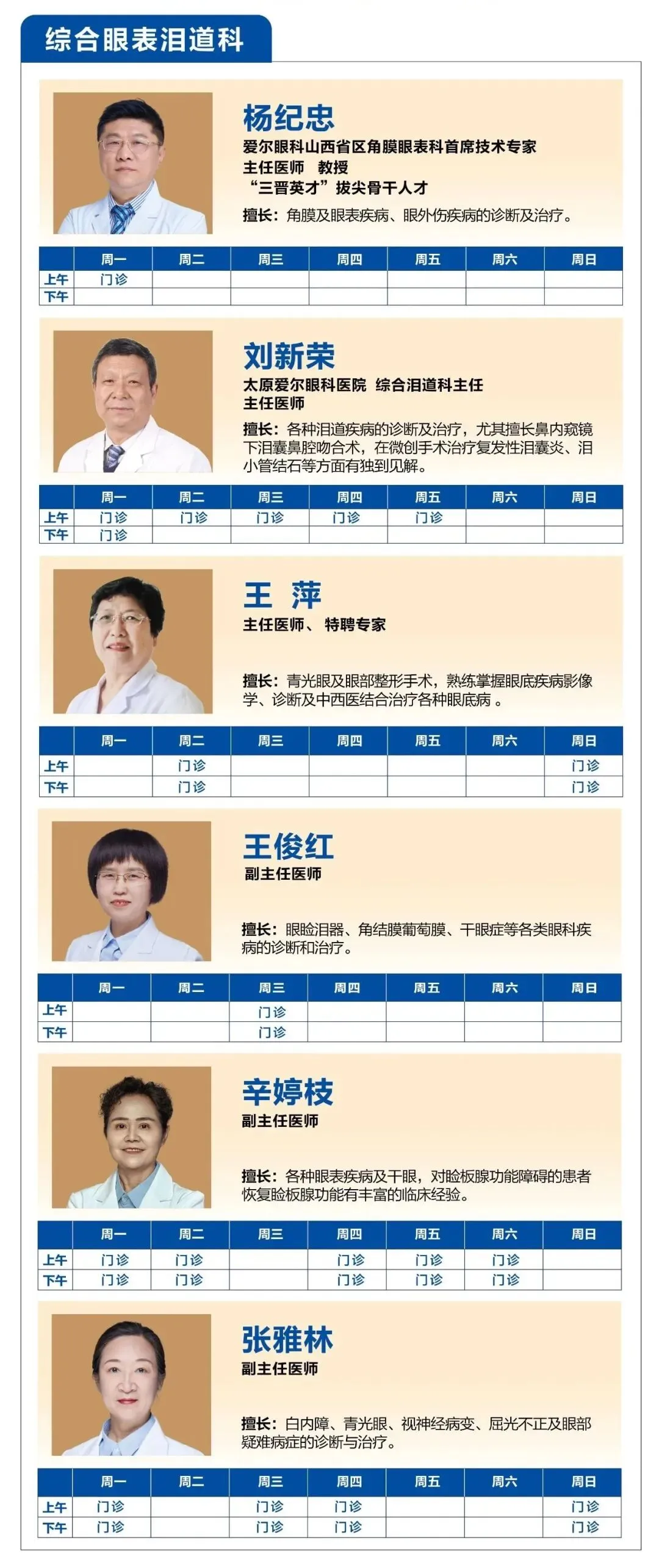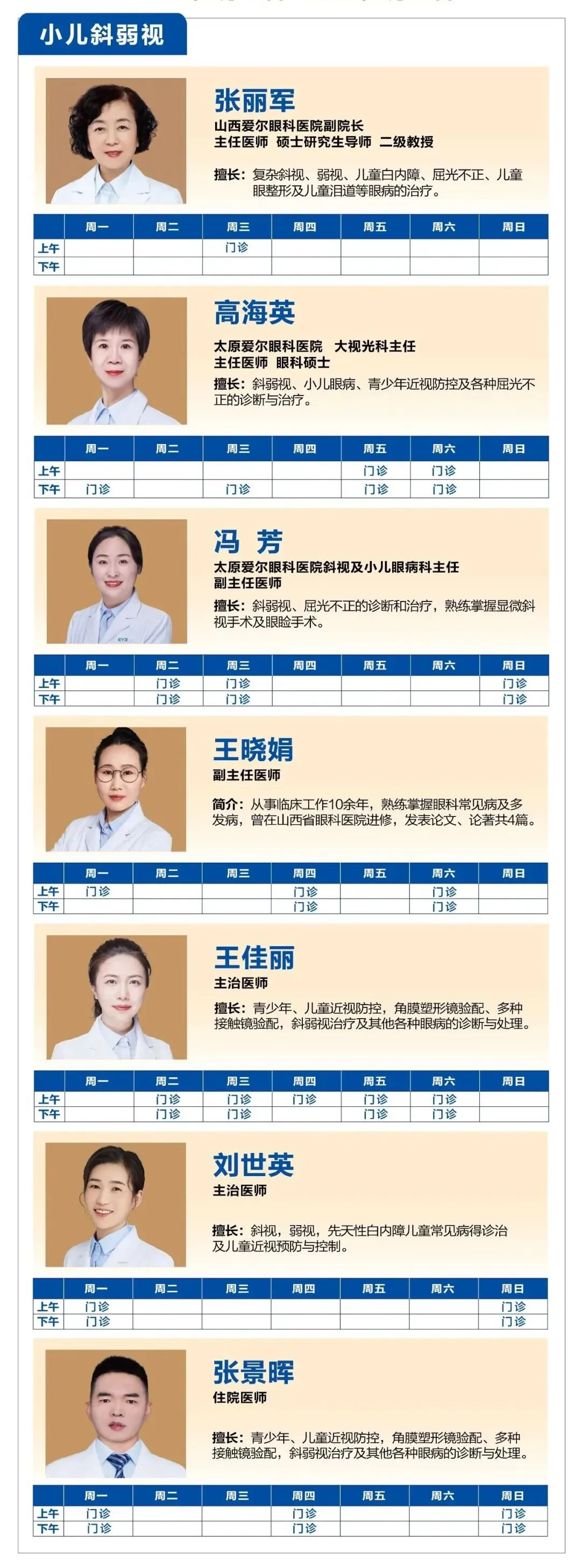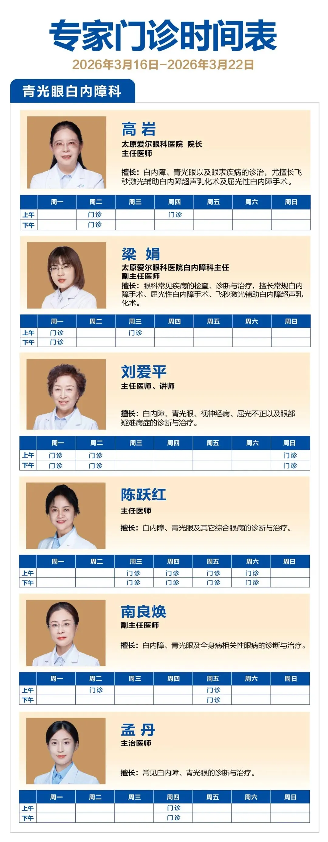 太原爱尔眼科医院2026年3月16日—2026年3月22日门诊排班表
