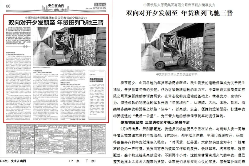 《山西晚报》刊发《双向对开夕发朝至 年货班列飞驰三晋》文章