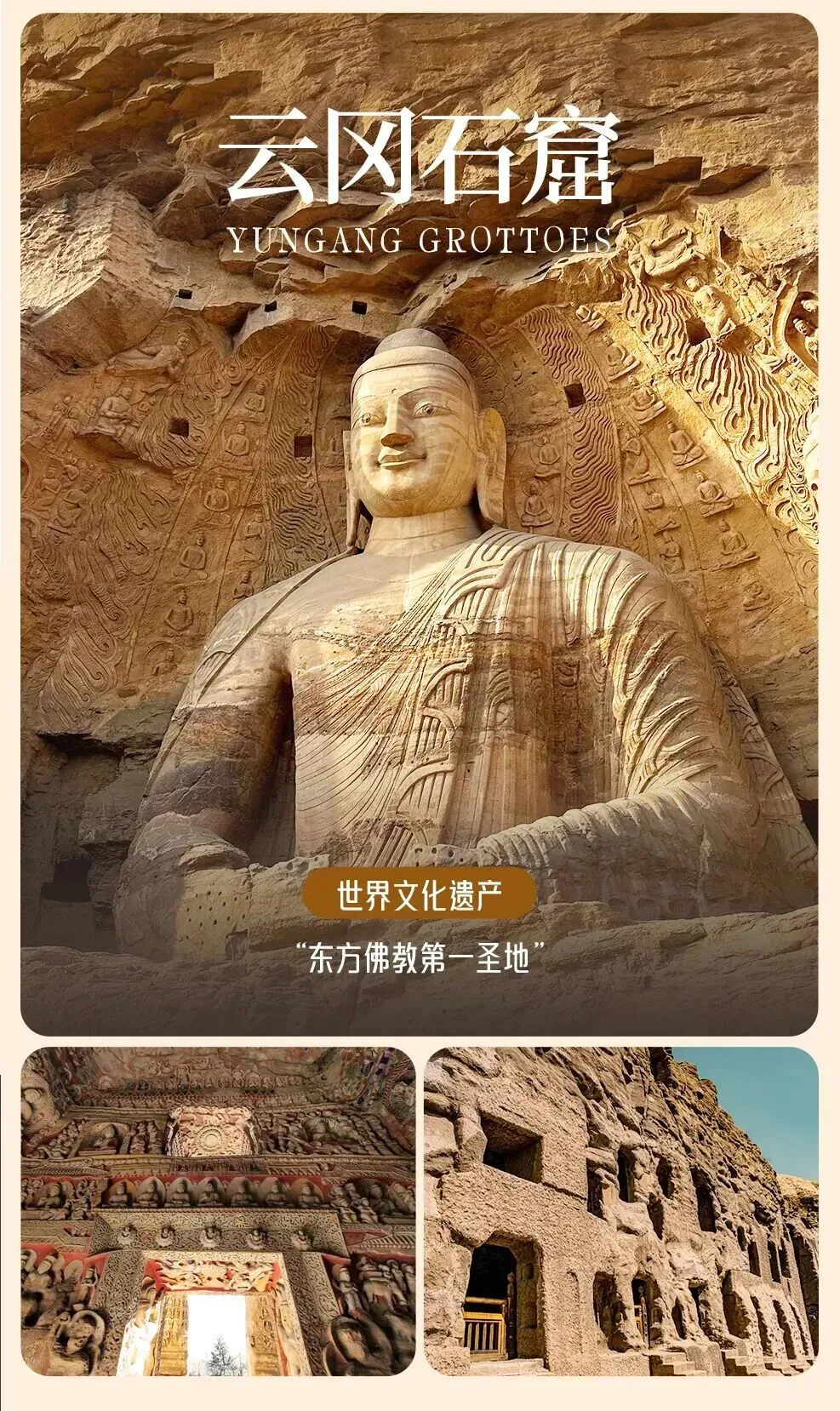 【云冈石窟】武州山麓的风,吹过 1500 年的时光,将北魏王朝的佛国传奇镌刻在石壁之上,这里便是云冈石窟,与敦煌莫高窟、洛阳龙门石窟和麦积山石窟并称为中国四大石窟。一部刻在山石上的北魏史诗。石窟规模宏大、窟内壁画精美绝伦、造像内容丰富,堪称中国佛教艺术的巅峰之作。