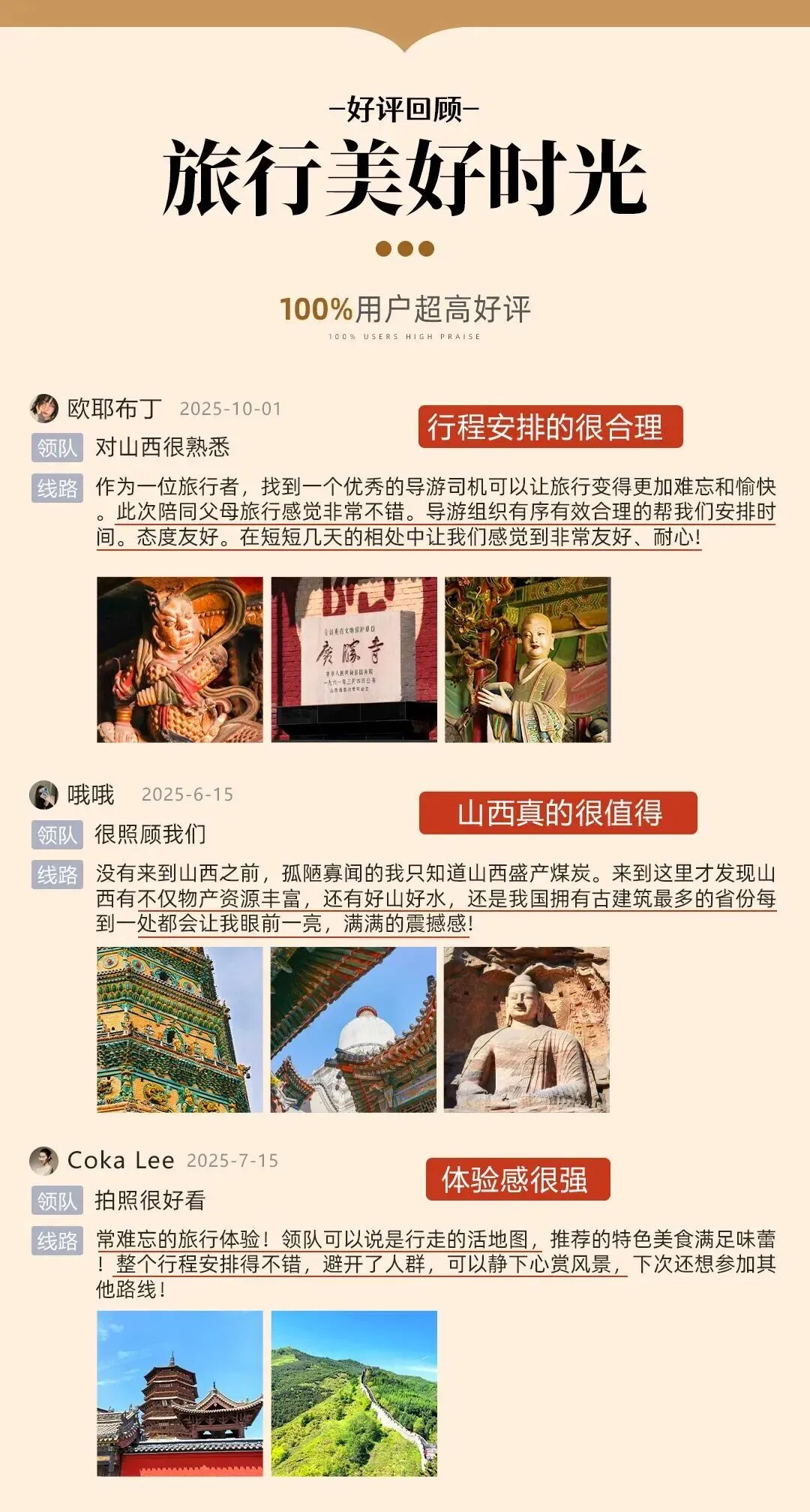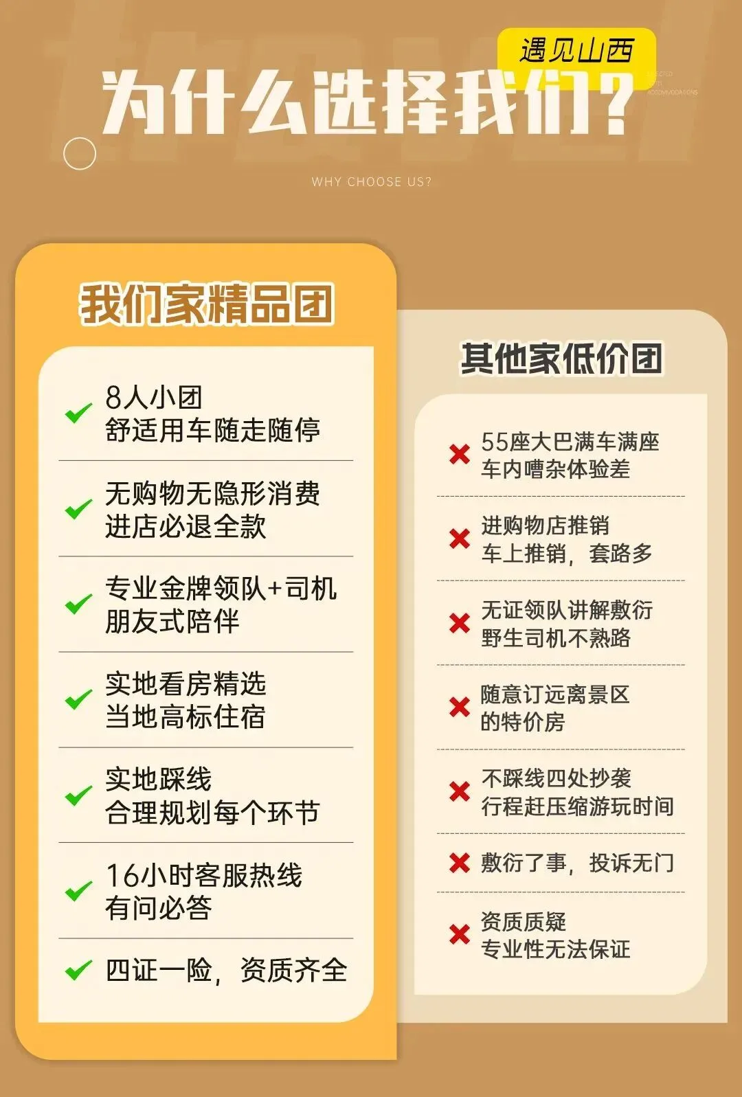 3、非必要景区门票自愿自理:平遥古城登城楼+小景点门票125元/人(进城免费)、平遥古城电瓶车单程10元/人,往返20元/人、悬空寺登临费100元/人、云冈石窟电瓶车10元/人、五台山寺庙小门票(菩萨顶10元/人,显通寺10元/人,塔院寺10元/人,黛螺顶10元/人);