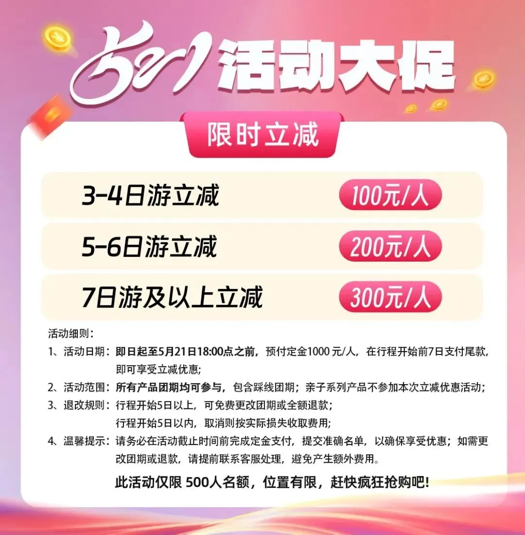 备注:跨五一和国庆、含五一和国庆的团期,报名成功不支持退团,订金不退,可自行找人替换。
