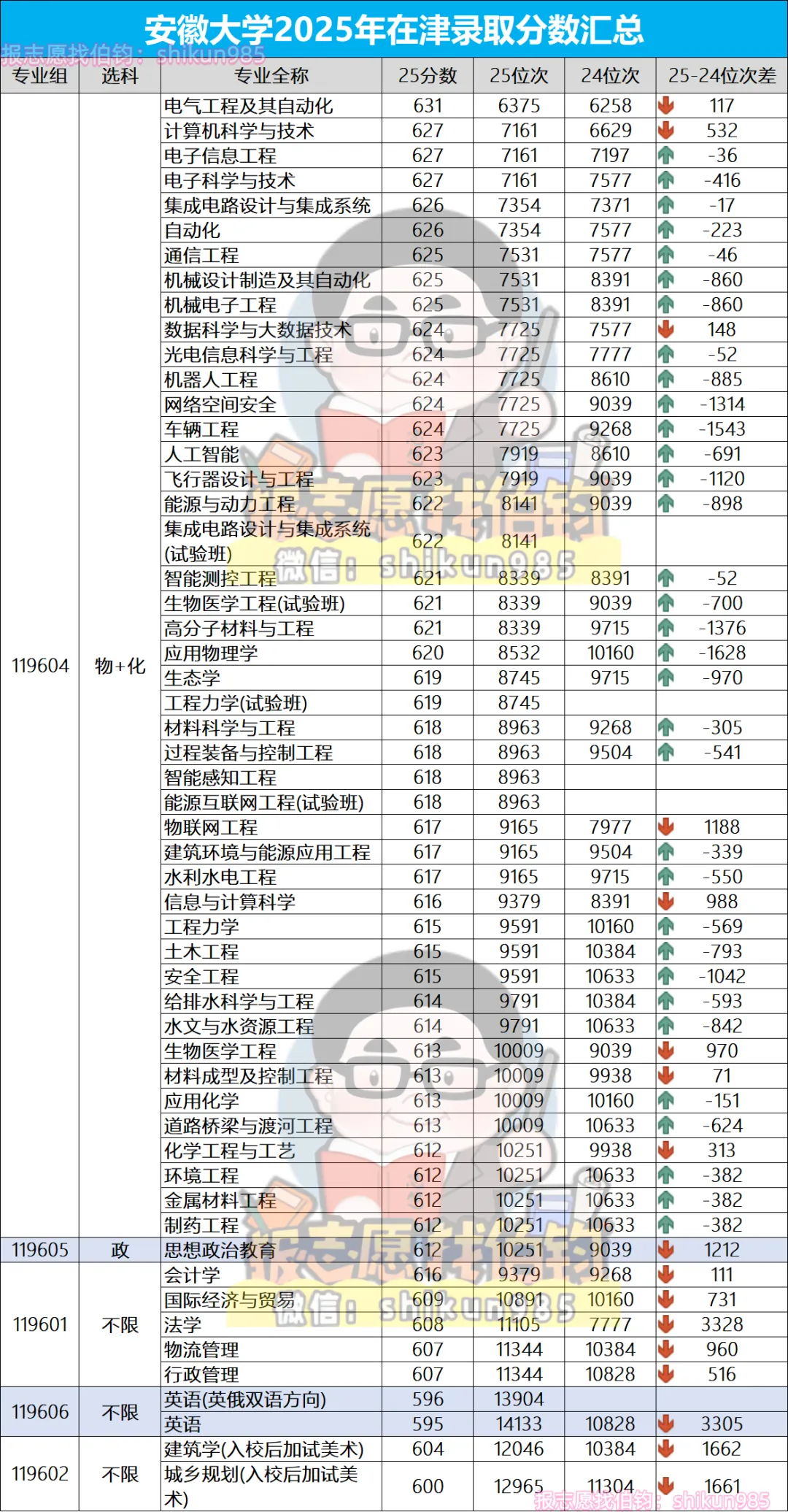 2025年在津录取位次集中在6000—14000名之间,在专业组分组情况和录取分数方面,与河北工业大学形成直接的竞争关系。相比24年,25年录取位次理工类专业整体趋势是上涨的;文科类专业,整体趋势是下降的。