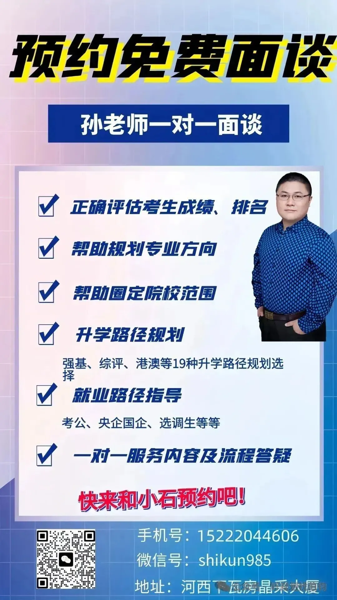 声明:本文部分内容、图片来源于网络,尊重版权,如有侵权问题,请及时与管理员联系处理。⏰面谈时间:孙老师一对一面谈,60分钟免费咨询;