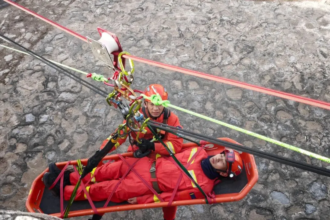 绳索救援训练中,大队坚持理论授课与实战实训相结合,全面夯实指战员基础理论,提升实战技能。聚焦地震、山岳及狭小空间等复杂环境,按照“真、难、实、严”要求,模拟困难条件下的救援场景,扎实开展现场安全评估、锚点制作与倍力系统搭建、担架固定与提拉、T型及V型救援等课目训练,在实战化训练中查漏补缺,持续磨砺队伍应对重特大灾害事故的专业救援能力。