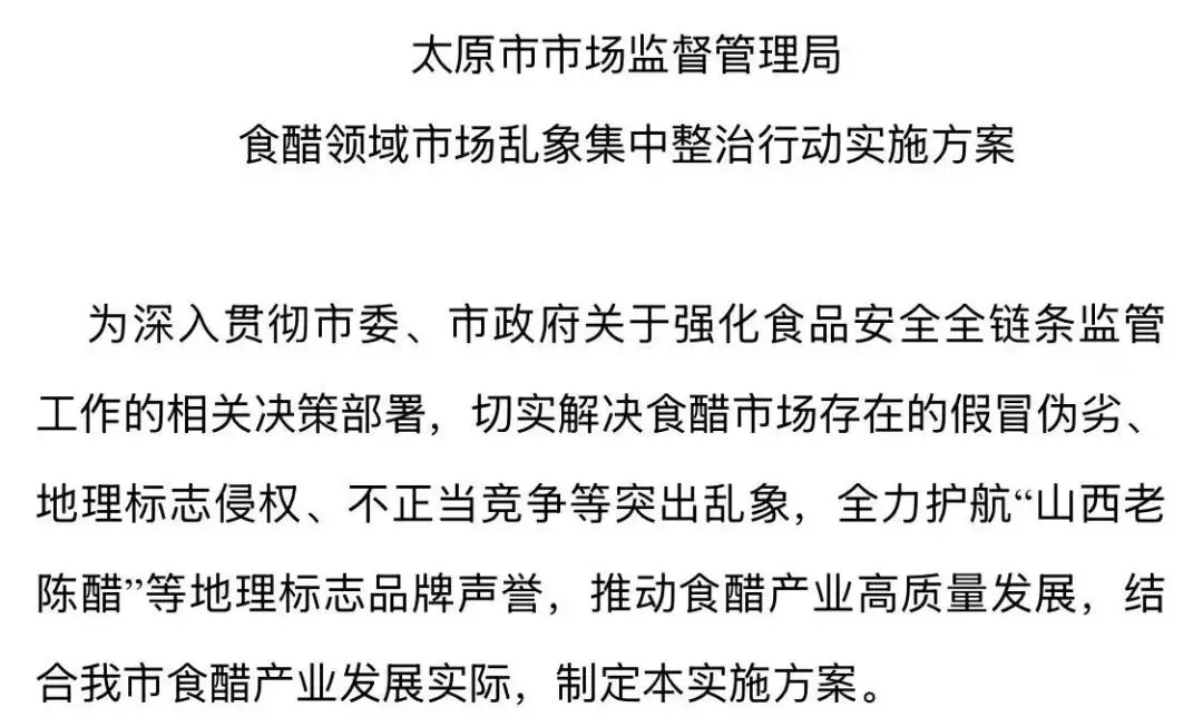 《太原市市场监督管理局食醋领域市场乱象集中整治行动实施方案》公开发布(成文日期3月4日)。
