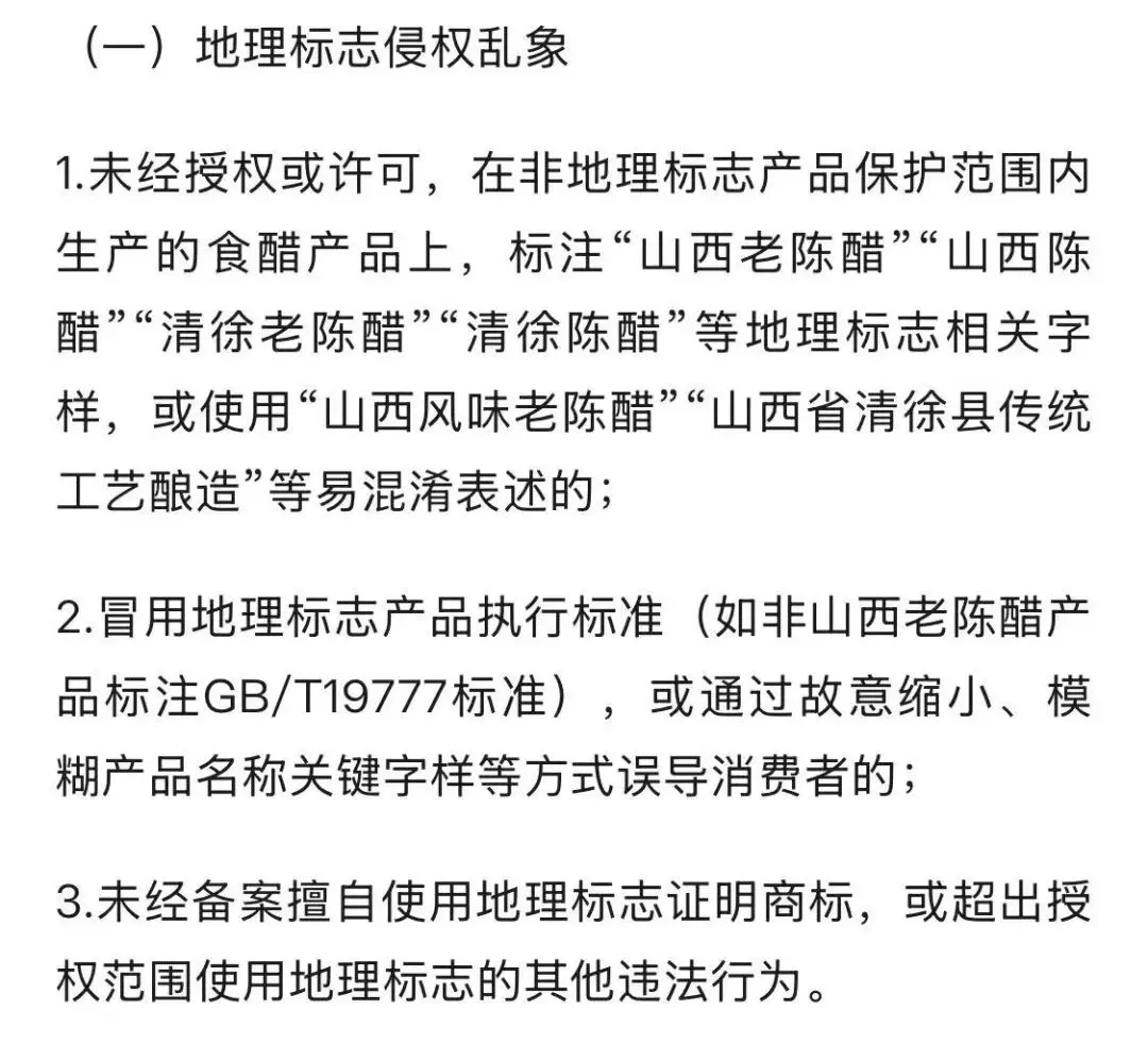 构建跨区域协同监管机制:报请省市场监管局在全省范围组织开展食醋地理标志保护集中整治行动,全面净化省内食醋市场环境;建议省市场监管局报请国家市场监管总局联合河北、河南、山东、湖北等省份市场监管部门建立食醋地理标志保护跨区域执法联动机制,加强信息共享、线索移送、联合执法,打破地域执法壁垒。
