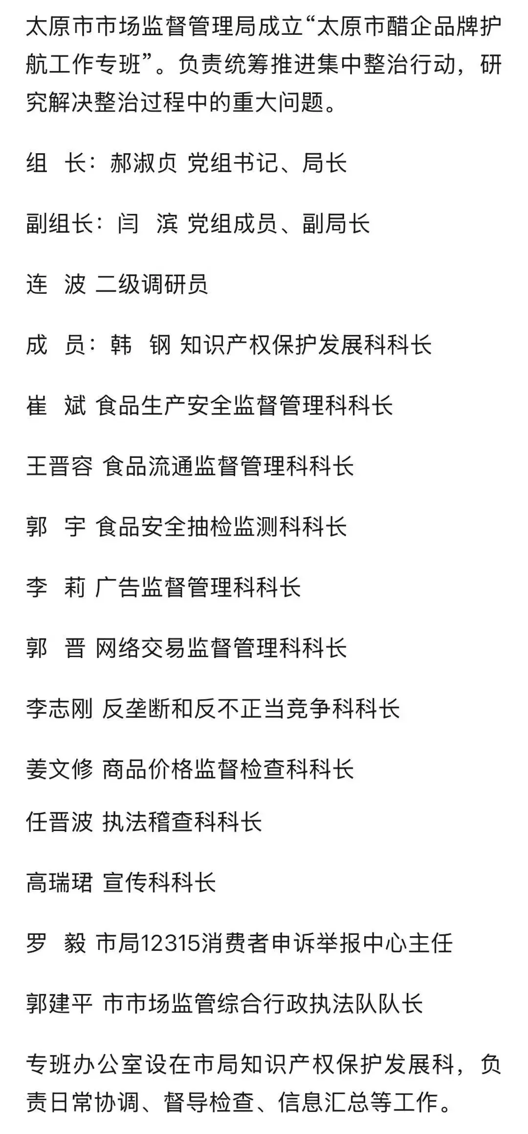 太原市市场监管局成立“太原市醋企品牌护航工作专班”。