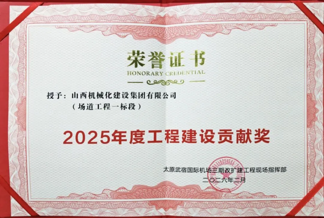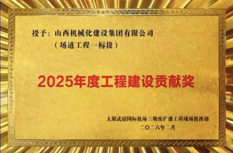 2026年3月13日,太原武宿国际机场三期改扩建工程现场指挥部对2025年度在工程建设领域安全质量管理成效显著、工程建设贡献突出的单位进行集中表彰。集团公司承建的场道工程一标段项目,荣获"2025年度工程建设贡献奖"。