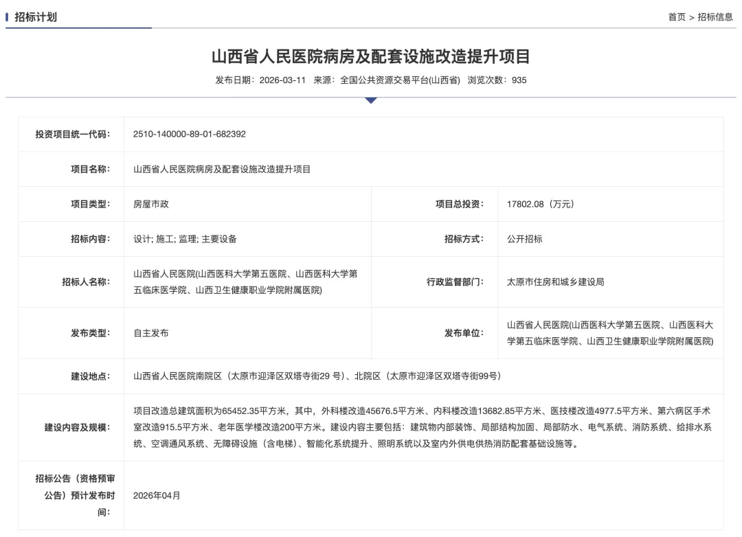 为解决这些问题,全面提升医疗服务质量,山西省人民医院于2026年3月11日正式发布了“病房及配套设施改造提升项目”的招标计划。