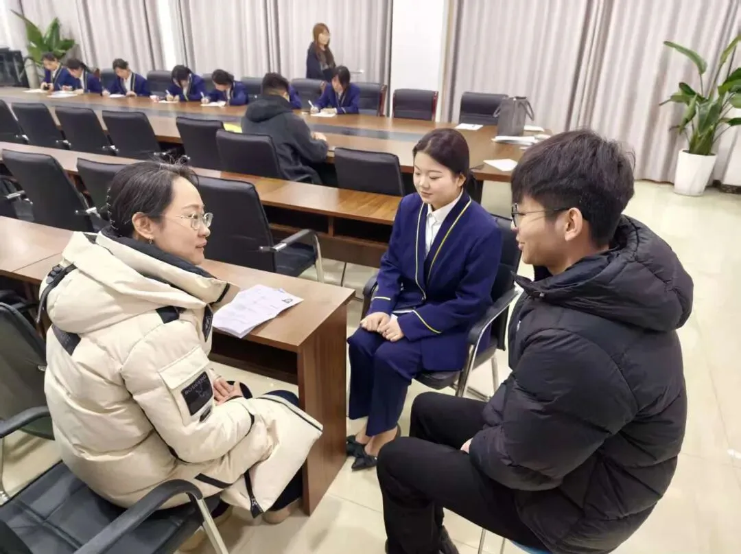 紧接着,现场面试环节正式展开。负责人与同学们进行面对面交流,从专业知识、沟通能力、服务意识等方面进行综合考察。同学们沉着应对,自信表达,充分展示了我校学子的专业素养和青春风采。经过紧张而有序的面试,多名学生与企业初步达成就业意向,现场确定了入职意向,为即将开始的职业生涯迈出了坚实的一步。