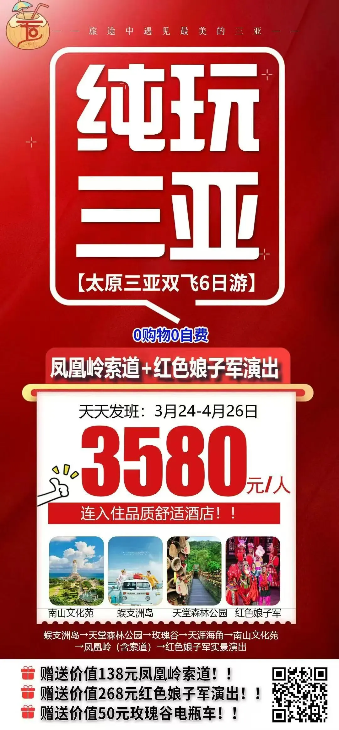 >太原三亚双飞6日游特惠3000+,太原直飞三亚纯玩0购物0自费,赠送凤凰岭索道+红色娘子军演出