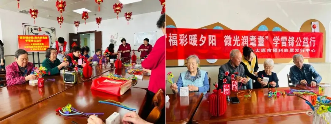 3月12日,携手太原市民政局、太原市福利彩票发行中心开展“福彩暖夕阳微光润耄耋”学雷锋公益行活动。太原市福利彩票发行中心为老人们捐赠小夜灯,并与老人们共同制作扭扭棒手工作品,用点滴爱心温暖桑榆晚景。