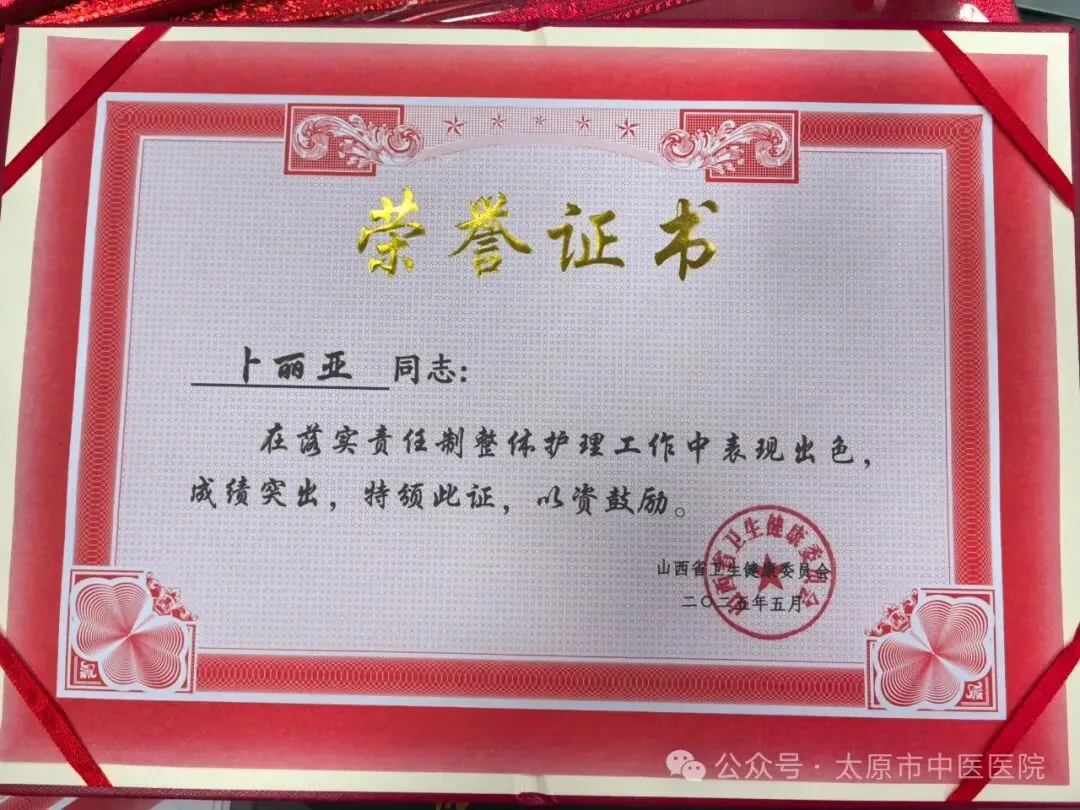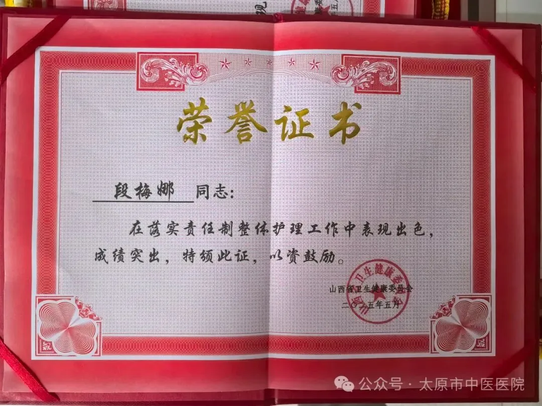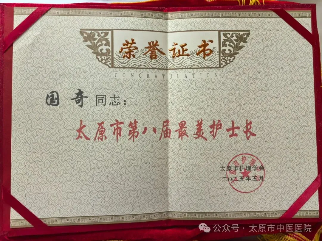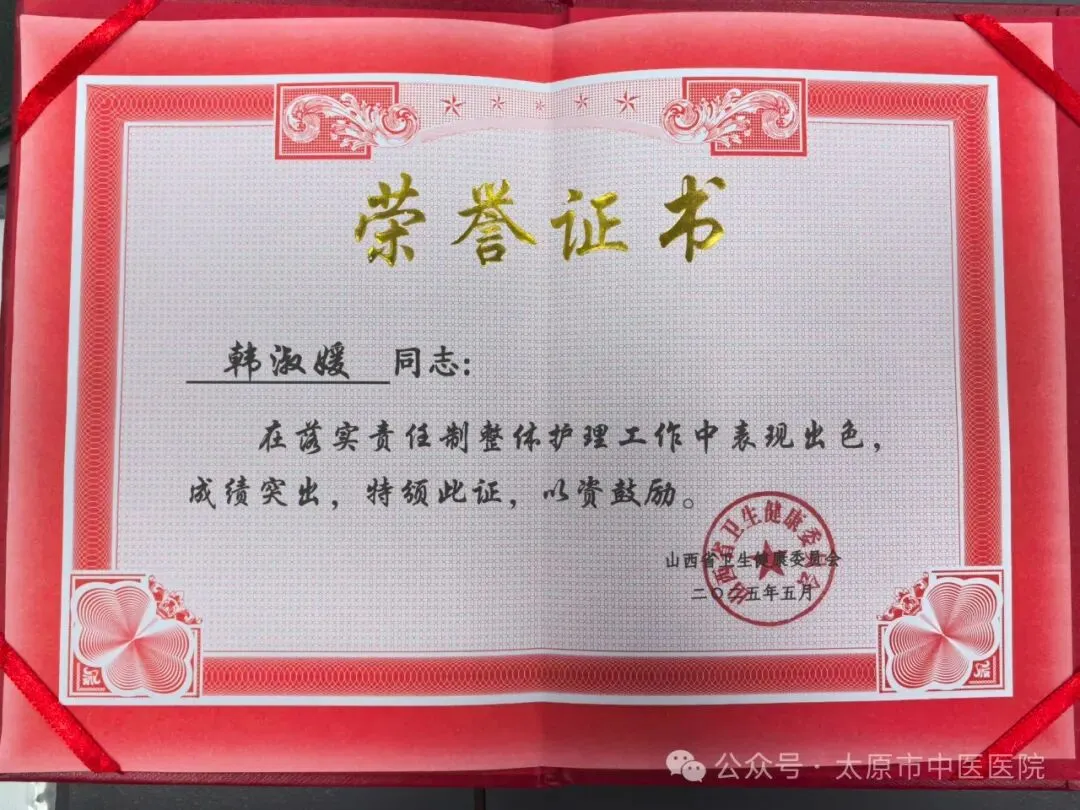 山西省卫生健康委员会授予落实责任制整体护理表现突出护理人员段梅娜,女,36岁,主管护师,太原市中医医院针灸二科护士,从事临床护理工作已有十年。在工作中,始终秉持“以患者为中心”的理念,将中医理论与现代护理技术相结合,致力于为患者提供全面、细致的护理服务。注重发挥中医特色,运用艾灸、推拿、拔罐等传统疗法,帮助患者缓解病痛,促进康复。积极参与科室的护理质量改进工作,提出并实施了多项优化护理流程的措施,有效提升了护理效率和患者满意度。凭借扎实的专业知识和丰富的临床经验,她多次在院内的护理技能竞赛中获奖,并被评为“优秀护士”和“护理服务标兵”。卜丽亚,女,38岁,主管护师,太原市中医医院肺病科护士,从事护理工作17年。始终秉持“以患者为中心”的服务理念,熟练掌握重症监护、急救护理等专业技能,带领团队优化护理流程、中医护理方案等。多次荣获医院“优秀护士”“技能标兵”等称号。2023年在太原市护理岗位技能竞赛暨首届中医护理竞赛应积极救治组第四名,展现了扎实的专业素养。面对突发公共卫生事件,主动请缨投身抗疫一线,参加救治护理工作。工作之余,发表著作一本,论文一篇。韩淑媛,女,34岁,本科,主管护师,太原市中医医院针灸一科护士。毕业于山西中医药大学,从事护理临床工作已近十余年。曾多次被评为“优秀护理工作者”“优秀共产党员”“青年岗位能手”。2022年,在疫情防控形势紧张、科室人手紧缺的情况下,主动放弃产假,提前回归工作岗位,把集体的利益放在第一位。日常责护工作中,注重细节管理,创新思路,创造良好的治疗护理环境。运用中医护理思维,以整体观念与辨证施护理念为基础,采用中医适宜护理技术,减轻患者疼痛。始终坚持以患者为中心,急病人之所急,想患者之所想,得当了患者的一致好评。注重理论与实践结合,不断学习和探索新知识新技能。主要参与了市级课题的立项与科研工作。2024年,成为山西省首届中医专科护士。任继媛,女,30岁,护师,太原市中医医院内科护士,从事护理工作十余年。工作中,始终践行“以患者为中心”的理念,凭借扎实专业和热忱态度荣获优秀护士、“首届中医护理技能竞赛”三等奖等荣誉。遇到对中医治疗存疑的患者,会耐心分享康复故事,细讲中医治疗优势,助其消除顾虑、积极治疗。为发挥中医药在护理中的作用,不断钻研,将艾灸、穴位按摩、耳穴压豆等中医技术融入日常,帮助患者缓解病痛。疫情期间,她主动投身防控一线,参与到方舱医院护理工作中。面对未知的风险,她未曾退缩,精心照料每一位患者,给予他们温暖与希望。魏艳,女,52岁,本科,副主任护师,太原市中医医院科护士长。从事临床护理工作33年,现任太原市护理学会理事、太原市中医学会理事、太原市中医学会肛肠分会理事、山西省护理学会护理管理专委会委员、中华护理学会委员。多次参与举办了太原市护理学会学术会议,在山西省护理学会举办的培训班中进行中医特色护理授课。2011年11月进行了国家中医药管理局“十二五”重点专科建设项目申报,2012年2月获得了国家中医药管理局“十二五”重点专科建设“中医护理学”培育项目,担任学科带头人。并成功申报了2013年国家级中医药继续教育项目——中医护理技术改良的临床应用研讨班。多次被评为医院优秀护士长、护理质量管理先进工作者。发表国家级论文4篇。国奇,女,42岁,本科,副主任护师,共产党员,太原市中医医院针灸一科护士长。自2002年加入护理队伍以来,始终坚守在临床一线,以病人为中心,以服务为宗旨,将自己的爱心和耐心倾注在每一位患者身上。她深知,作为一名护士,不仅要有扎实的专业知识,更要有高尚的医德医风。因此,她始终坚持以“一切为了人民健康” 为工作准则,用真诚和热情对待每一位患者,用专业和细致做好每一项护理工作。作为病区的护士长,她深知每个护理人员都是宝贵的资源。因此,她鼓励团队成员积极参与科室管理,根据每个人的特长和性格合理分配工作,最大限度地发挥他们的潜能。在20多年的护士职业生涯中,她始终坚守初心,把党和人民群众的利益放在首位。她以认真负责的工作态度,不断提升自己的专业技术水平,致力于为患者提供有温度的护理服务。耿洁,女,34岁,护师,太原市中医医院康复二科护士。自2013年投身护理事业以来,她始终坚守“以己微光,护佑生命曙光”的信念,用心对待每一个护理环节。在日常工作中,她严于律己,将规范操作融入日常,急患者所急,忧患者所忧。她积极参与各类护理活动,曾在“千名医师下基层”活动中,深入曲沃县中医院,毫无保留地分享先进护理理念与规范操作,使该院护理工作得到显著提升。此外,耿洁还荣获优秀护士、抗疫天使等荣誉,并在2025年太原市中医医院护士岗位技能竞赛中荣获初级组第一名。她用扎实的专业技能和热忱的服务,诠释了白衣天使的神圣使命。未来,耿洁将继续以爱为羽翼,以专业为基石,在护理岗位上笃定前行,为患者健康贡献自己的力量。姜娇娇,女,33岁,主管护师,太原市中医医院心脑科护士。自2016年参加工作以来,秉持着“大医精诚”的理念,在岗位上默默耕耘,用中医护理的智慧与温情,为患者驱散病痛阴霾。努力钻研中医典籍与现代心脑医学知识,熟练掌握艾灸、耳穴压豆、穴位贴敷等中医特色