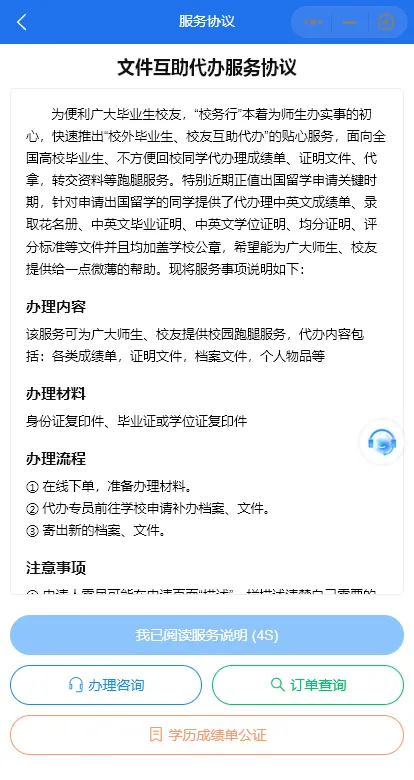 关注【校务行 | 互助代办翻译】官方公众号,底部菜单栏“我要下单-成绩单文件代办”即可进入办理。