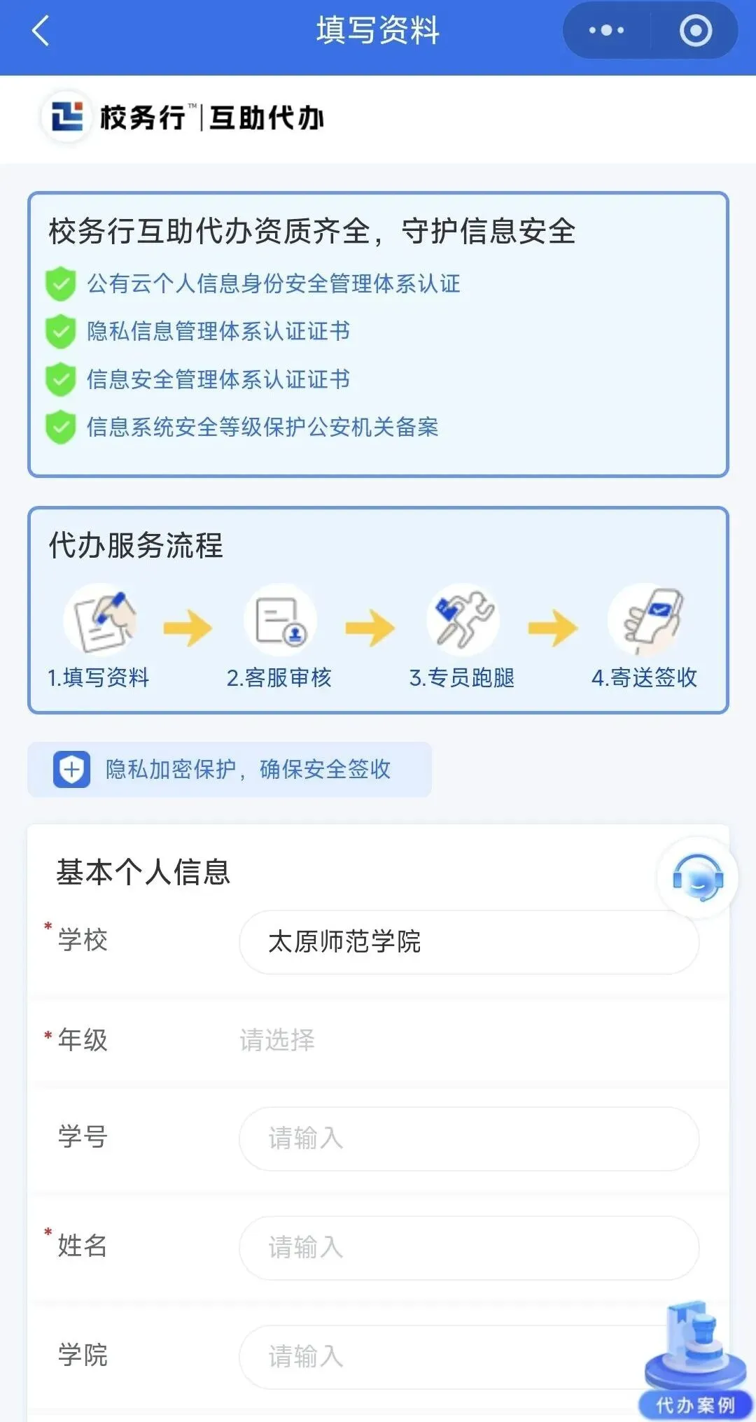 2. 填写个人信息并上传身份证复印件、毕业证或学位证复印件等相关资料后,点击提交;后台将会在收到申请后进行审核,审核通过后即可为您提供代办服务。