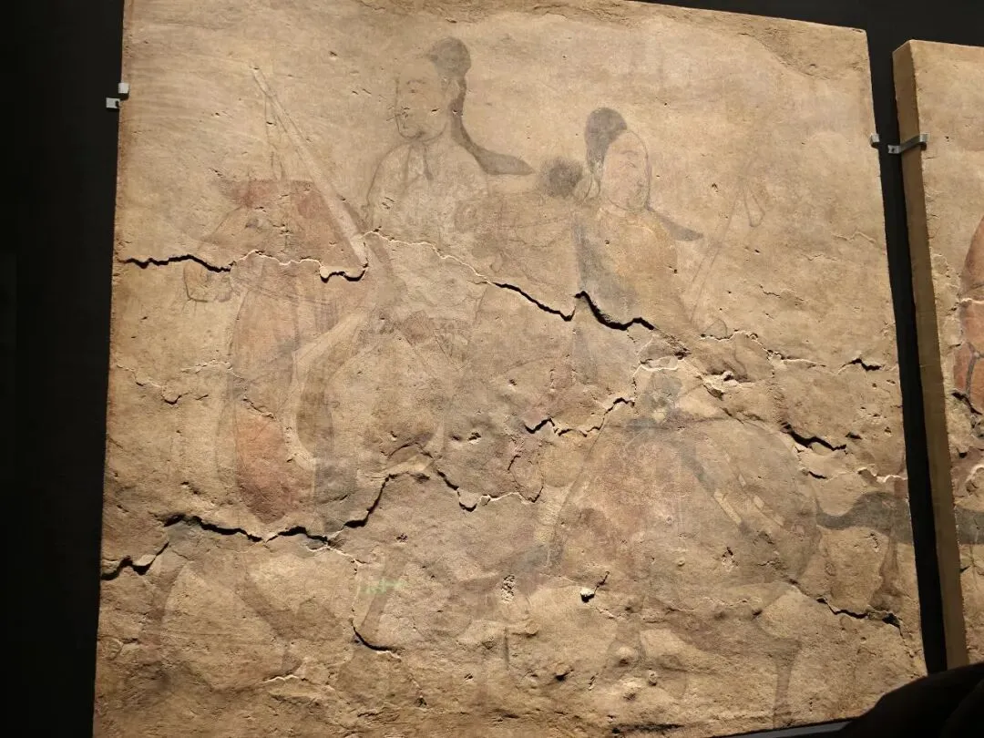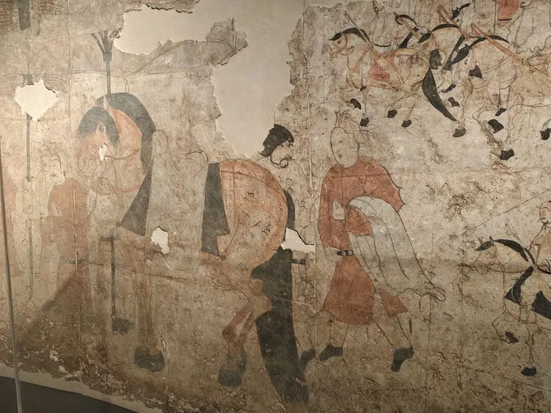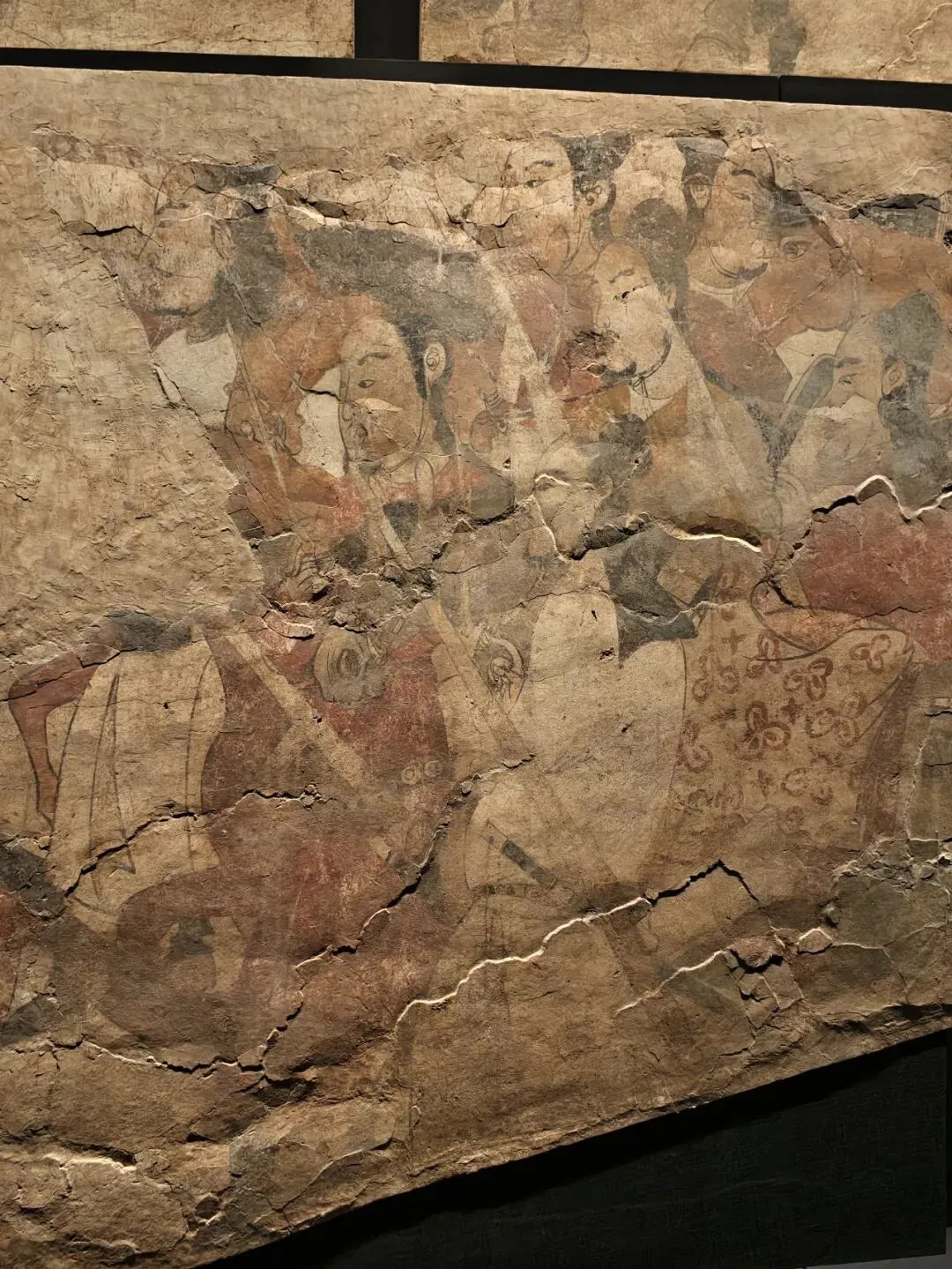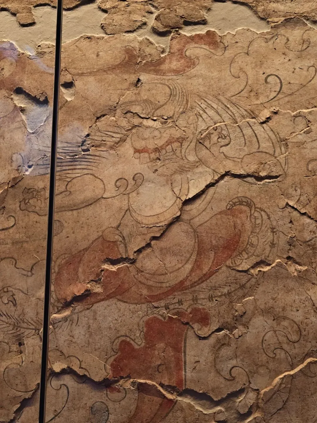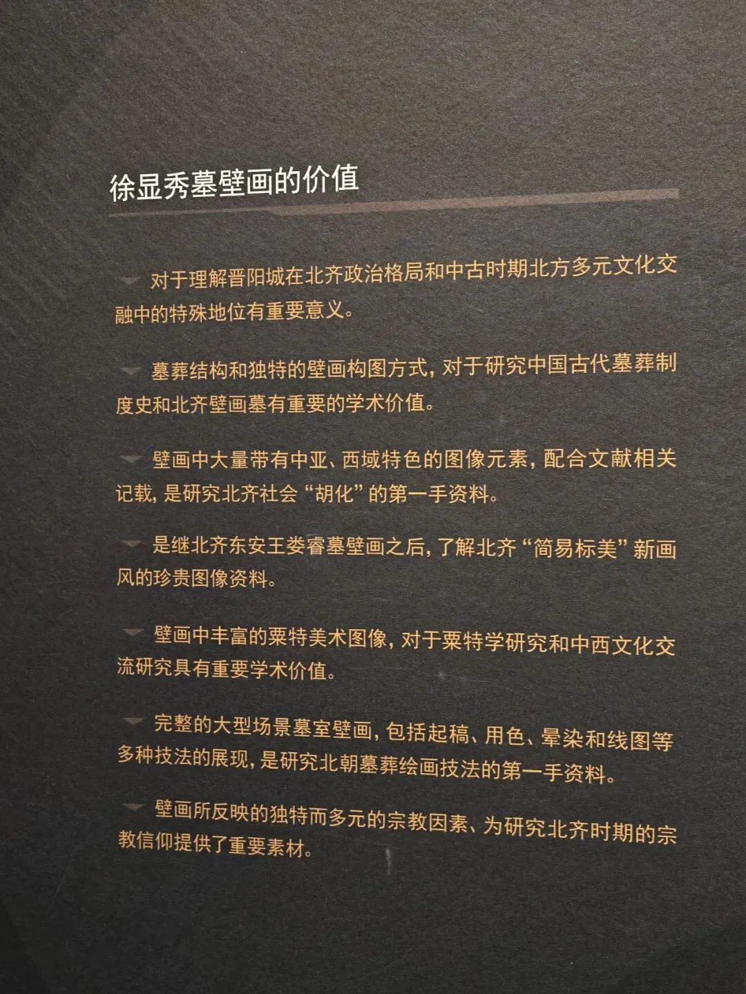 一进去就能看到这幅北齐太尉、武安王徐显秀墓门楼图,这是博物馆的唯一复制品,真品在山西博物院,在博物院的时候已经看到过这幅门楼图。总的来说这幅画还是有很多纰漏,技艺与现代相比也差别很大,比如门开的方向,透视比例不对,人物全部闭眼、手都在袖子里(眼睛、手不好画)。这只神鸟是《门楼图》的核心元素,它长着狮子的头、鸟的喙、龙的颈、白鹭的腿、鹰的爪和凤凰的尾羽,是多种瑞兽形象的融合体,昂首守护在门楼之上,象征着守护与祥瑞。上面这个网状的东西叫罘罳(fú sī),设在屋檐或窗上以防鸟雀的金属网或丝网。可见当时的画师是严格按照北齐建筑刻画出来的,这么细节的东西都画上了。娄睿是北齐东安王、鲜卑贵族,其姑母为北齐奠基人高欢的正妻,地位显赫。这幅画主体为鲜卑贵族骑队,具体位置是在墓道东西两壁,分上下两层,上层为骑队,下层为步行仪仗,展现贵族出行的盛大场面,分成了三块。特色之一:马拉粑粑,几个圆球从马屁股里掉下来,很少有人画图会把这么细节的地方画出来。特色之二:中间这幅图中间这匹马,双目炯炯,无论从哪个角度看都似在注视观者,被称为 “马娜丽莎”。这可是1450年前的画,比蒙娜丽莎早了不少。特色之三:这幅图马背上的披巾是不是挺像LV的花纹的。现场看已经有点不清楚了,也是因为娄睿墓1979年发现出土的,过去这么多年颜色都退化了很多。而后面展厅要看的徐显秀墓是2000年发现的,直接原址保护,我们只能看VR和图片,墓还在脚下,这座博物馆也是为它所建。娄睿墓《门吏图》,作为墓葬仪卫体系的重要组成,与另一幅对称门吏图成对出现,象征守护墓门、驱邪镇墓。北齐狩猎图,直观反映北齐贵族 “尚武狩猎” 的生活习俗,印证鲜卑民族的游牧传统与北齐的贵族娱乐制度。出现在壁画里的人物形象,最下面有胡人,那个时期胡汉融合也是文化的融合。出土于九原岗墓葬的《升天图》,穿丁字裤的 “风伯”,右手攥着一个口袋,即传说中的 “风袋”,打开袋口即可吹出飓风。形象源自《山海经》,风伯是中国古代神话中的风神,负责兴风作雨。畏兽,是北朝墓葬中驱邪镇墓、引导升仙的核心符号,形象融合了中国传统瑞兽与西域神兽特征,是胡汉文化交融在神话艺术中的具体呈现。风伯与雷公、畏兽、骑龙仙人等形象共同构成了引导墓主灵魂升仙的宏大场景,反映了北朝贵族对死后世界的想象。听累了的小朋友又开始了在博物馆找不挡人的角落边休息边听的模式。在真实的徐显秀墓中,石门下部原本雕刻着青龙、白虎,后来被用颜料改绘成祆教神鸟,这扇铜门就将这一 “改绘” 的历史细节以浮雕的形式凝固下来,成为解读北齐文化交融的绝佳入口。2000年被盗墓贼发现,后来原址保护在这里建起了博物馆。墓主徐显秀,这一生还是跟随了高家几代君主,60多岁迁太尉,执掌全国军事大权,70岁就去世了。墓道边上看到有个像窗户的东西,问老师才知道这是后面其他人的坟墓,看来这一块地方风水确实好。他的墓志,详细记录了他的家族世系、完整的官职迁转与重大战功。镇墓武士陶俑,呈现出鲜明的胡族特征,是北朝民族融合的生动体现。墓葬就在这下面。他的墓比娄睿墓晚了很多年,技术更先进了,所以直接原址保护,恒温恒湿,最大限度保护千年前的墓葬壁画。所以这个展厅温度会比其他两个低一点,而且公益讲解不会进来,避免大量人群集中在这里,影响整体的空气。其他就只能看图画了,还有个VR眼镜可以戴着体验一下,还能看到当时的盗墓洞。壁画中的场景,反映徐显秀出行前备马场景,中间这个人拿着的是胡床,相当于我们现在的马扎。墓主夫妇宴饮图。他身上这个皮衣一看就是当年的喜好,才会画在墓葬里。北齐画风好写实,跟前面画了马粑粑一样,这里还画出了牛的生殖器。比如上面男主人在右边,但是马在左边,而应该乘牛车的女主人在左边,对应的确实马。这里右边红色衣服的男子应该是在吹笛子,笛子忘了画。出现这些原因大概率是因为徐显秀封王较晚,还没来得及好好修自己的陵墓就死了,画师得赶工赶紧画完才能下葬,所以才有这么多问题。再加上那时候的画师也不知道多年后会考古打开,既然是墓葬里面的壁画,那随意画画就好了,反正也没人会看。如果真要看古代的各种精美艺术,应该是看各种书法真迹、寺庙建筑这些,墓葬里面的水平是最低的。而娄睿墓的水平要比徐显秀墓的水平高,是因为他早就是贵族了,早就开始修自己的陵墓,不像徐显秀这样匆匆忙忙。而且正常的墓道有四层,徐显秀墓也少了一层,也说明了当时修建的时候太过于匆忙,因为一层一层等干都要等很久,他已经死了急着下葬。出土的龙柄鸡首壶。这边的文物不多,很多都在太原市博物馆里能看到。第三个展厅叫“简易标美”,这是北齐绘画的典型风格,线条简练流畅,人物面部刻画生动,衣纹褶皱一笔带过,没有多余修饰,具有强烈的写实感和现代速写的韵味。这个展厅主要展示了娄叡墓壁画、九原岗墓壁画、水泉梁墓壁画。运用了从西域传入的凹凸晕染法,通过淡红晕染人物面部和衣袍,塑造出立体感,这种技法直接影响了唐代绘画的发展。忻州九原岗北朝墓《升天图》,雷公这种画法在中国古代大同小异。仙人乘龙。里面的很多元素需要读读《山海经》才知道。看下图这壁画上有一些笔直的蓝色线条,是盗墓贼进去