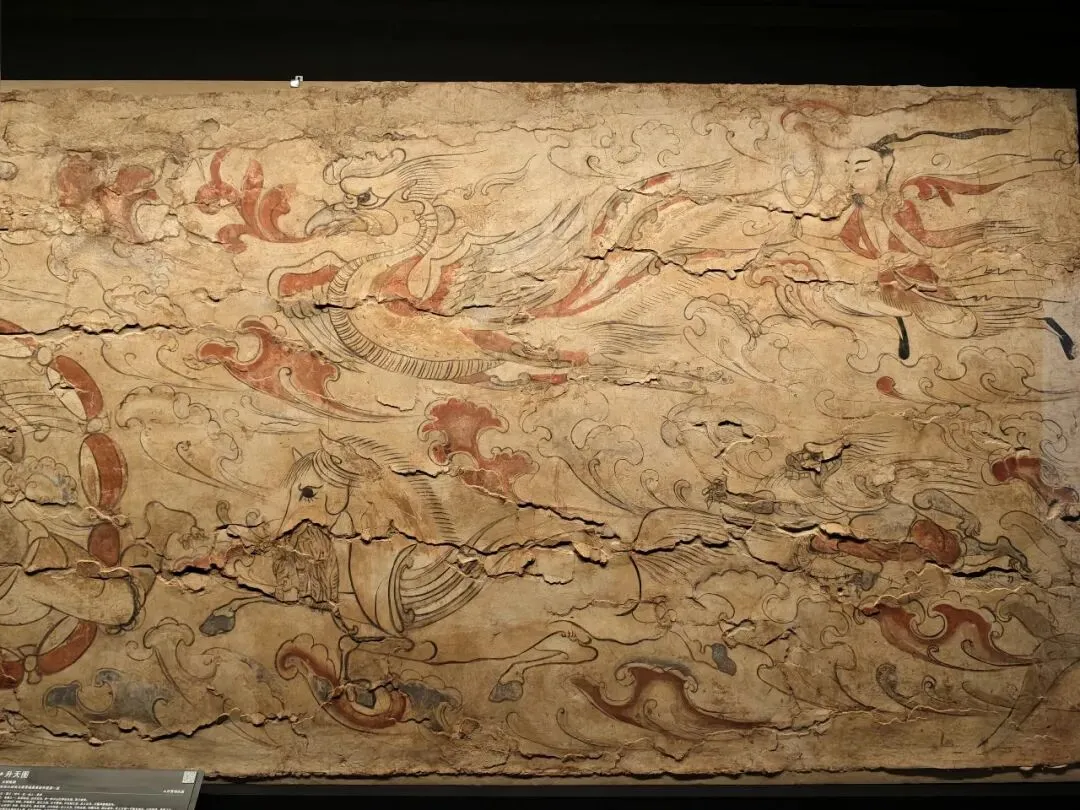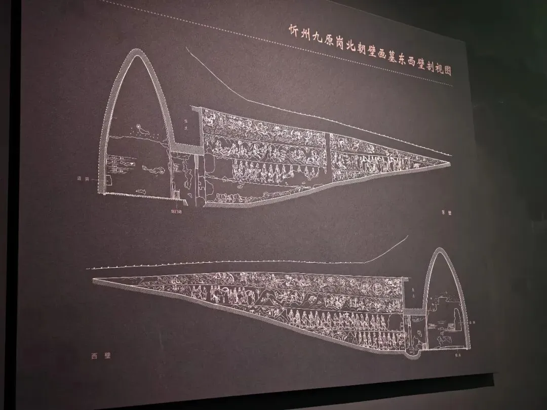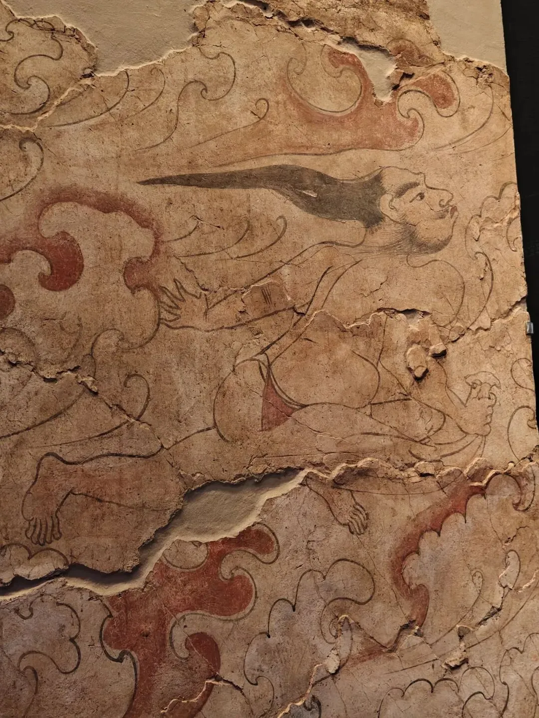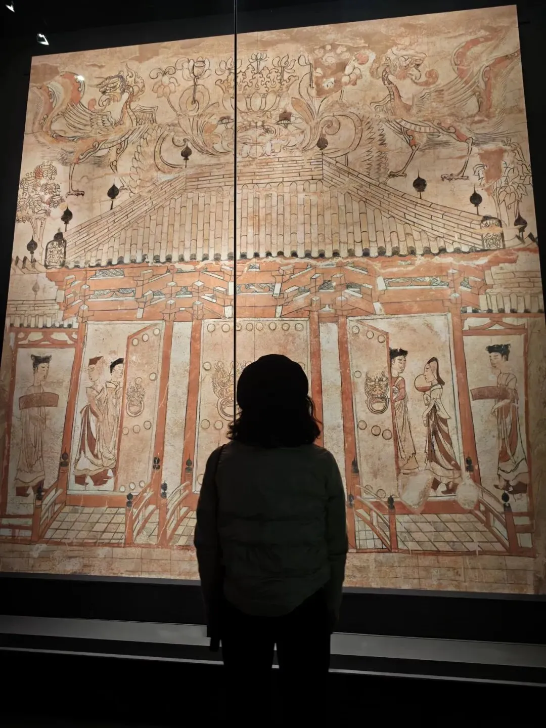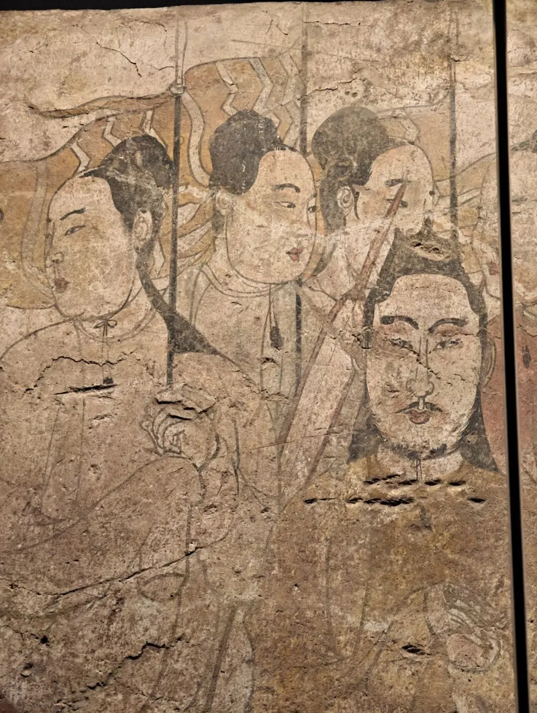 一进去就能看到这幅北齐太尉、武安王徐显秀墓门楼图,这是博物馆的唯一复制品,真品在山西博物院,在博物院的时候已经看到过这幅门楼图。总的来说这幅画还是有很多纰漏,技艺与现代相比也差别很大,比如门开的方向,透视比例不对,人物全部闭眼、手都在袖子里(眼睛、手不好画)。这只神鸟是《门楼图》的核心元素,它长着狮子的头、鸟的喙、龙的颈、白鹭的腿、鹰的爪和凤凰的尾羽,是多种瑞兽形象的融合体,昂首守护在门楼之上,象征着守护与祥瑞。上面这个网状的东西叫罘罳(fú sī),设在屋檐或窗上以防鸟雀的金属网或丝网。可见当时的画师是严格按照北齐建筑刻画出来的,这么细节的东西都画上了。娄睿是北齐东安王、鲜卑贵族,其姑母为北齐奠基人高欢的正妻,地位显赫。这幅画主体为鲜卑贵族骑队,具体位置是在墓道东西两壁,分上下两层,上层为骑队,下层为步行仪仗,展现贵族出行的盛大场面,分成了三块。特色之一:马拉粑粑,几个圆球从马屁股里掉下来,很少有人画图会把这么细节的地方画出来。特色之二:中间这幅图中间这匹马,双目炯炯,无论从哪个角度看都似在注视观者,被称为 “马娜丽莎”。这可是1450年前的画,比蒙娜丽莎早了不少。特色之三:这幅图马背上的披巾是不是挺像LV的花纹的。现场看已经有点不清楚了,也是因为娄睿墓1979年发现出土的,过去这么多年颜色都退化了很多。而后面展厅要看的徐显秀墓是2000年发现的,直接原址保护,我们只能看VR和图片,墓还在脚下,这座博物馆也是为它所建。娄睿墓《门吏图》,作为墓葬仪卫体系的重要组成,与另一幅对称门吏图成对出现,象征守护墓门、驱邪镇墓。北齐狩猎图,直观反映北齐贵族 “尚武狩猎” 的生活习俗,印证鲜卑民族的游牧传统与北齐的贵族娱乐制度。出现在壁画里的人物形象,最下面有胡人,那个时期胡汉融合也是文化的融合。出土于九原岗墓葬的《升天图》,穿丁字裤的 “风伯”,右手攥着一个口袋,即传说中的 “风袋”,打开袋口即可吹出飓风。形象源自《山海经》,风伯是中国古代神话中的风神,负责兴风作雨。畏兽,是北朝墓葬中驱邪镇墓、引导升仙的核心符号,形象融合了中国传统瑞兽与西域神兽特征,是胡汉文化交融在神话艺术中的具体呈现。风伯与雷公、畏兽、骑龙仙人等形象共同构成了引导墓主灵魂升仙的宏大场景,反映了北朝贵族对死后世界的想象。听累了的小朋友又开始了在博物馆找不挡人的角落边休息边听的模式。在真实的徐显秀墓中,石门下部原本雕刻着青龙、白虎,后来被用颜料改绘成祆教神鸟,这扇铜门就将这一 “改绘” 的历史细节以浮雕的形式凝固下来,成为解读北齐文化交融的绝佳入口。2000年被盗墓贼发现,后来原址保护在这里建起了博物馆。墓主徐显秀,这一生还是跟随了高家几代君主,60多岁迁太尉,执掌全国军事大权,70岁就去世了。墓道边上看到有个像窗户的东西,问老师才知道这是后面其他人的坟墓,看来这一块地方风水确实好。他的墓志,详细记录了他的家族世系、完整的官职迁转与重大战功。镇墓武士陶俑,呈现出鲜明的胡族特征,是北朝民族融合的生动体现。墓葬就在这下面。他的墓比娄睿墓晚了很多年,技术更先进了,所以直接原址保护,恒温恒湿,最大限度保护千年前的墓葬壁画。所以这个展厅温度会比其他两个低一点,而且公益讲解不会进来,避免大量人群集中在这里,影响整体的空气。其他就只能看图画了,还有个VR眼镜可以戴着体验一下,还能看到当时的盗墓洞。壁画中的场景,反映徐显秀出行前备马场景,中间这个人拿着的是胡床,相当于我们现在的马扎。墓主夫妇宴饮图。他身上这个皮衣一看就是当年的喜好,才会画在墓葬里。北齐画风好写实,跟前面画了马粑粑一样,这里还画出了牛的生殖器。比如上面男主人在右边,但是马在左边,而应该乘牛车的女主人在左边,对应的确实马。这里右边红色衣服的男子应该是在吹笛子,笛子忘了画。出现这些原因大概率是因为徐显秀封王较晚,还没来得及好好修自己的陵墓就死了,画师得赶工赶紧画完才能下葬,所以才有这么多问题。再加上那时候的画师也不知道多年后会考古打开,既然是墓葬里面的壁画,那随意画画就好了,反正也没人会看。如果真要看古代的各种精美艺术,应该是看各种书法真迹、寺庙建筑这些,墓葬里面的水平是最低的。而娄睿墓的水平要比徐显秀墓的水平高,是因为他早就是贵族了,早就开始修自己的陵墓,不像徐显秀这样匆匆忙忙。而且正常的墓道有四层,徐显秀墓也少了一层,也说明了当时修建的时候太过于匆忙,因为一层一层等干都要等很久,他已经死了急着下葬。出土的龙柄鸡首壶。这边的文物不多,很多都在太原市博物馆里能看到。第三个展厅叫“简易标美”,这是北齐绘画的典型风格,线条简练流畅,人物面部刻画生动,衣纹褶皱一笔带过,没有多余修饰,具有强烈的写实感和现代速写的韵味。这个展厅主要展示了娄叡墓壁画、九原岗墓壁画、水泉梁墓壁画。运用了从西域传入的凹凸晕染法,通过淡红晕染人物面部和衣袍,塑造出立体感,这种技法直接影响了唐代绘画的发展。忻州九原岗北朝墓《升天图》,雷公这种画法在中国古代大同小异。仙人乘龙。里面的很多元素需要读读《山海经》才知道。看下图这壁画上有一些笔直的蓝色线条,是盗墓贼进去