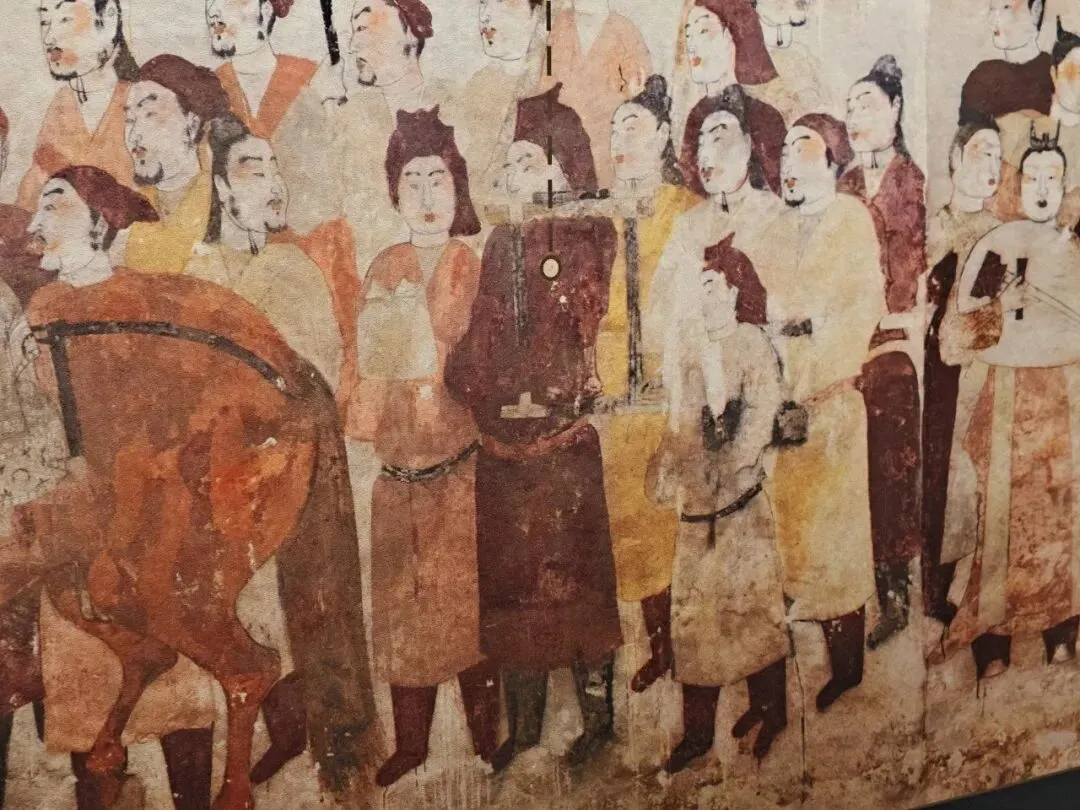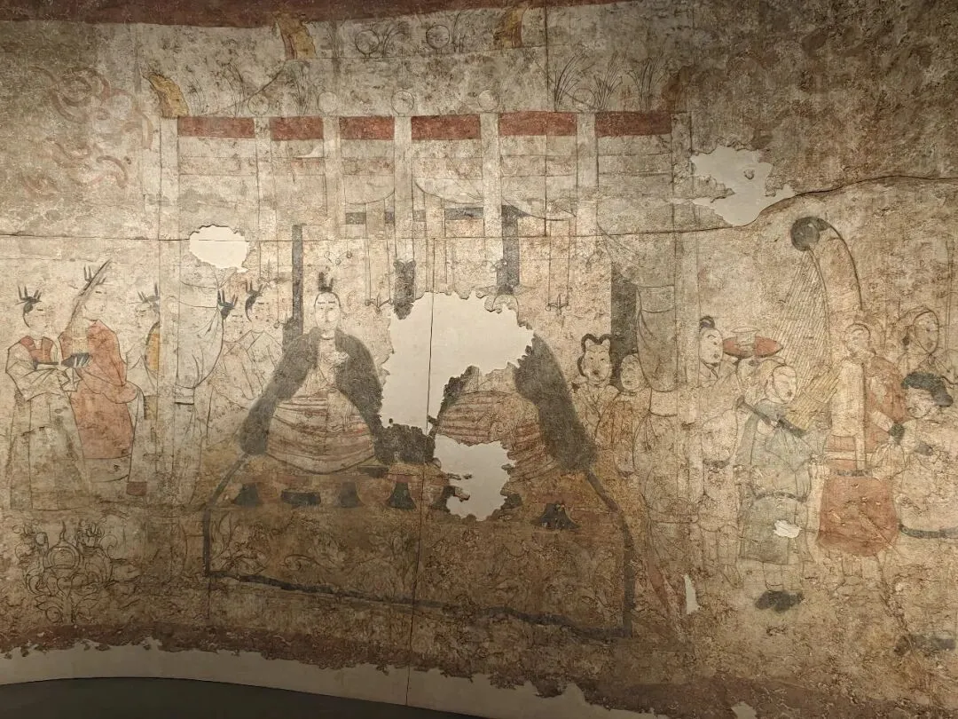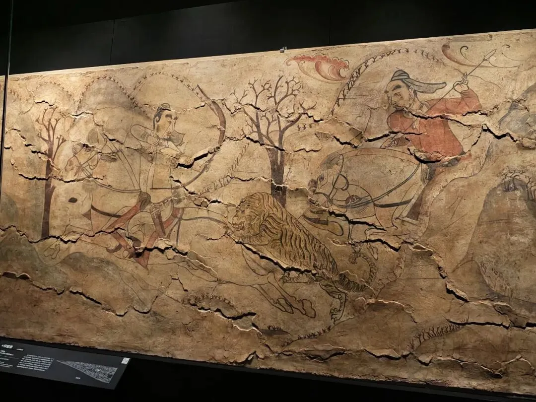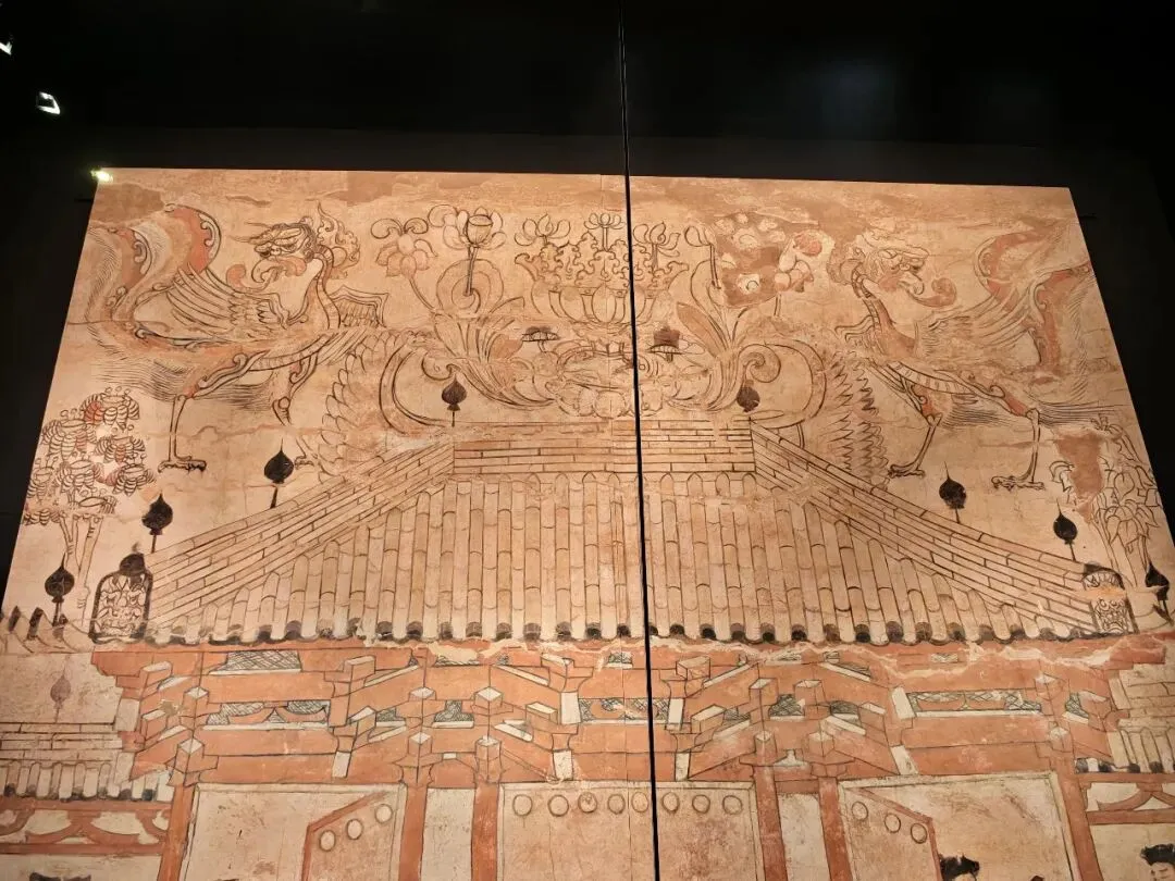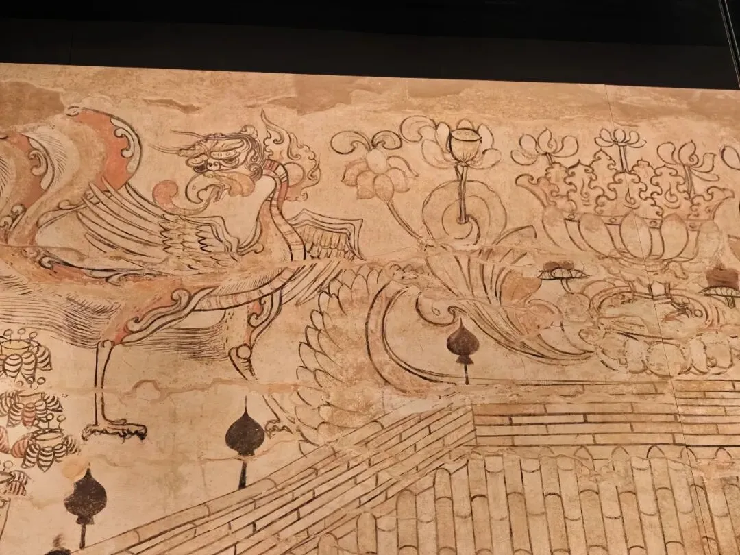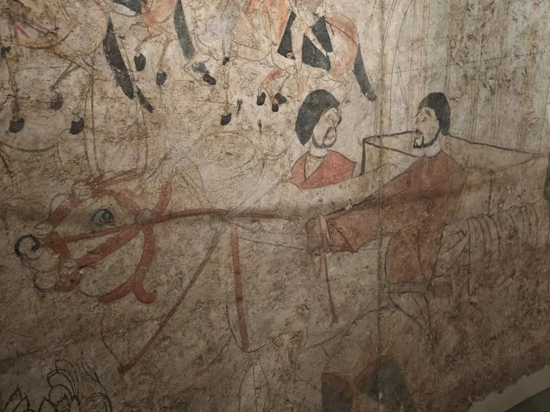 一进去就能看到这幅北齐太尉、武安王徐显秀墓门楼图,这是博物馆的唯一复制品,真品在山西博物院,在博物院的时候已经看到过这幅门楼图。总的来说这幅画还是有很多纰漏,技艺与现代相比也差别很大,比如门开的方向,透视比例不对,人物全部闭眼、手都在袖子里(眼睛、手不好画)。这只神鸟是《门楼图》的核心元素,它长着狮子的头、鸟的喙、龙的颈、白鹭的腿、鹰的爪和凤凰的尾羽,是多种瑞兽形象的融合体,昂首守护在门楼之上,象征着守护与祥瑞。上面这个网状的东西叫罘罳(fú sī),设在屋檐或窗上以防鸟雀的金属网或丝网。可见当时的画师是严格按照北齐建筑刻画出来的,这么细节的东西都画上了。娄睿是北齐东安王、鲜卑贵族,其姑母为北齐奠基人高欢的正妻,地位显赫。这幅画主体为鲜卑贵族骑队,具体位置是在墓道东西两壁,分上下两层,上层为骑队,下层为步行仪仗,展现贵族出行的盛大场面,分成了三块。特色之一:马拉粑粑,几个圆球从马屁股里掉下来,很少有人画图会把这么细节的地方画出来。特色之二:中间这幅图中间这匹马,双目炯炯,无论从哪个角度看都似在注视观者,被称为 “马娜丽莎”。这可是1450年前的画,比蒙娜丽莎早了不少。特色之三:这幅图马背上的披巾是不是挺像LV的花纹的。现场看已经有点不清楚了,也是因为娄睿墓1979年发现出土的,过去这么多年颜色都退化了很多。而后面展厅要看的徐显秀墓是2000年发现的,直接原址保护,我们只能看VR和图片,墓还在脚下,这座博物馆也是为它所建。娄睿墓《门吏图》,作为墓葬仪卫体系的重要组成,与另一幅对称门吏图成对出现,象征守护墓门、驱邪镇墓。北齐狩猎图,直观反映北齐贵族 “尚武狩猎” 的生活习俗,印证鲜卑民族的游牧传统与北齐的贵族娱乐制度。出现在壁画里的人物形象,最下面有胡人,那个时期胡汉融合也是文化的融合。出土于九原岗墓葬的《升天图》,穿丁字裤的 “风伯”,右手攥着一个口袋,即传说中的 “风袋”,打开袋口即可吹出飓风。形象源自《山海经》,风伯是中国古代神话中的风神,负责兴风作雨。畏兽,是北朝墓葬中驱邪镇墓、引导升仙的核心符号,形象融合了中国传统瑞兽与西域神兽特征,是胡汉文化交融在神话艺术中的具体呈现。风伯与雷公、畏兽、骑龙仙人等形象共同构成了引导墓主灵魂升仙的宏大场景,反映了北朝贵族对死后世界的想象。听累了的小朋友又开始了在博物馆找不挡人的角落边休息边听的模式。在真实的徐显秀墓中,石门下部原本雕刻着青龙、白虎,后来被用颜料改绘成祆教神鸟,这扇铜门就将这一 “改绘” 的历史细节以浮雕的形式凝固下来,成为解读北齐文化交融的绝佳入口。2000年被盗墓贼发现,后来原址保护在这里建起了博物馆。墓主徐显秀,这一生还是跟随了高家几代君主,60多岁迁太尉,执掌全国军事大权,70岁就去世了。墓道边上看到有个像窗户的东西,问老师才知道这是后面其他人的坟墓,看来这一块地方风水确实好。他的墓志,详细记录了他的家族世系、完整的官职迁转与重大战功。镇墓武士陶俑,呈现出鲜明的胡族特征,是北朝民族融合的生动体现。墓葬就在这下面。他的墓比娄睿墓晚了很多年,技术更先进了,所以直接原址保护,恒温恒湿,最大限度保护千年前的墓葬壁画。所以这个展厅温度会比其他两个低一点,而且公益讲解不会进来,避免大量人群集中在这里,影响整体的空气。其他就只能看图画了,还有个VR眼镜可以戴着体验一下,还能看到当时的盗墓洞。壁画中的场景,反映徐显秀出行前备马场景,中间这个人拿着的是胡床,相当于我们现在的马扎。墓主夫妇宴饮图。他身上这个皮衣一看就是当年的喜好,才会画在墓葬里。北齐画风好写实,跟前面画了马粑粑一样,这里还画出了牛的生殖器。比如上面男主人在右边,但是马在左边,而应该乘牛车的女主人在左边,对应的确实马。这里右边红色衣服的男子应该是在吹笛子,笛子忘了画。出现这些原因大概率是因为徐显秀封王较晚,还没来得及好好修自己的陵墓就死了,画师得赶工赶紧画完才能下葬,所以才有这么多问题。再加上那时候的画师也不知道多年后会考古打开,既然是墓葬里面的壁画,那随意画画就好了,反正也没人会看。如果真要看古代的各种精美艺术,应该是看各种书法真迹、寺庙建筑这些,墓葬里面的水平是最低的。而娄睿墓的水平要比徐显秀墓的水平高,是因为他早就是贵族了,早就开始修自己的陵墓,不像徐显秀这样匆匆忙忙。而且正常的墓道有四层,徐显秀墓也少了一层,也说明了当时修建的时候太过于匆忙,因为一层一层等干都要等很久,他已经死了急着下葬。出土的龙柄鸡首壶。这边的文物不多,很多都在太原市博物馆里能看到。第三个展厅叫“简易标美”,这是北齐绘画的典型风格,线条简练流畅,人物面部刻画生动,衣纹褶皱一笔带过,没有多余修饰,具有强烈的写实感和现代速写的韵味。这个展厅主要展示了娄叡墓壁画、九原岗墓壁画、水泉梁墓壁画。运用了从西域传入的凹凸晕染法,通过淡红晕染人物面部和衣袍,塑造出立体感,这种技法直接影响了唐代绘画的发展。忻州九原岗北朝墓《升天图》,雷公这种画法在中国古代大同小异。仙人乘龙。里面的很多元素需要读读《山海经》才知道。看下图这壁画上有一些笔直的蓝色线条,是盗墓贼进去