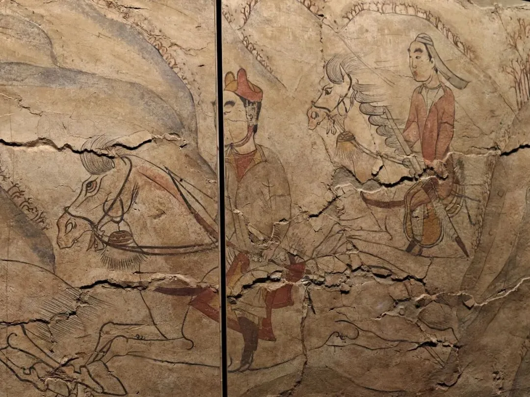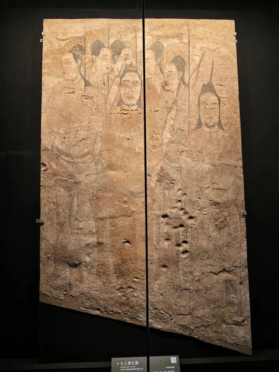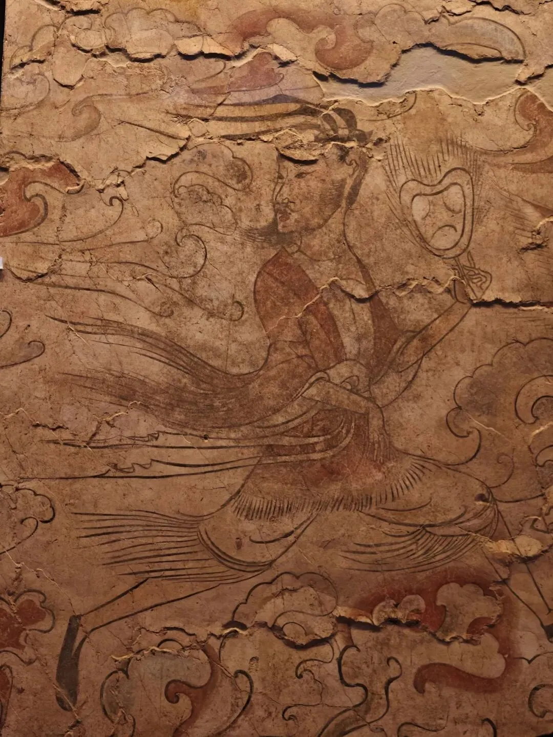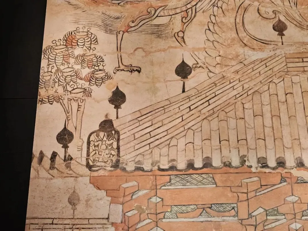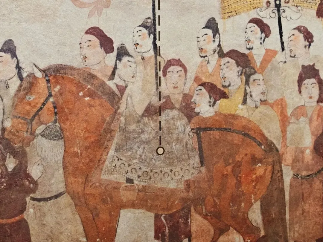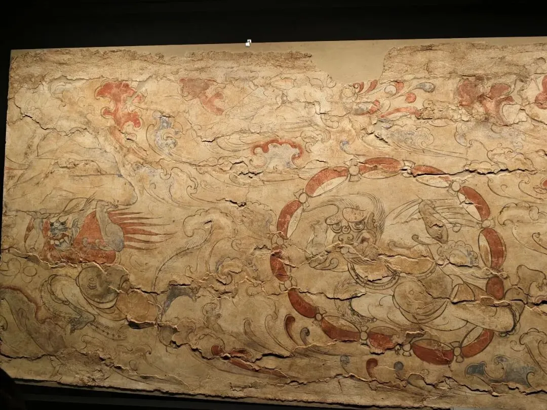 一进去就能看到这幅北齐太尉、武安王徐显秀墓门楼图,这是博物馆的唯一复制品,真品在山西博物院,在博物院的时候已经看到过这幅门楼图。总的来说这幅画还是有很多纰漏,技艺与现代相比也差别很大,比如门开的方向,透视比例不对,人物全部闭眼、手都在袖子里(眼睛、手不好画)。这只神鸟是《门楼图》的核心元素,它长着狮子的头、鸟的喙、龙的颈、白鹭的腿、鹰的爪和凤凰的尾羽,是多种瑞兽形象的融合体,昂首守护在门楼之上,象征着守护与祥瑞。上面这个网状的东西叫罘罳(fú sī),设在屋檐或窗上以防鸟雀的金属网或丝网。可见当时的画师是严格按照北齐建筑刻画出来的,这么细节的东西都画上了。娄睿是北齐东安王、鲜卑贵族,其姑母为北齐奠基人高欢的正妻,地位显赫。这幅画主体为鲜卑贵族骑队,具体位置是在墓道东西两壁,分上下两层,上层为骑队,下层为步行仪仗,展现贵族出行的盛大场面,分成了三块。特色之一:马拉粑粑,几个圆球从马屁股里掉下来,很少有人画图会把这么细节的地方画出来。特色之二:中间这幅图中间这匹马,双目炯炯,无论从哪个角度看都似在注视观者,被称为 “马娜丽莎”。这可是1450年前的画,比蒙娜丽莎早了不少。特色之三:这幅图马背上的披巾是不是挺像LV的花纹的。现场看已经有点不清楚了,也是因为娄睿墓1979年发现出土的,过去这么多年颜色都退化了很多。而后面展厅要看的徐显秀墓是2000年发现的,直接原址保护,我们只能看VR和图片,墓还在脚下,这座博物馆也是为它所建。娄睿墓《门吏图》,作为墓葬仪卫体系的重要组成,与另一幅对称门吏图成对出现,象征守护墓门、驱邪镇墓。北齐狩猎图,直观反映北齐贵族 “尚武狩猎” 的生活习俗,印证鲜卑民族的游牧传统与北齐的贵族娱乐制度。出现在壁画里的人物形象,最下面有胡人,那个时期胡汉融合也是文化的融合。出土于九原岗墓葬的《升天图》,穿丁字裤的 “风伯”,右手攥着一个口袋,即传说中的 “风袋”,打开袋口即可吹出飓风。形象源自《山海经》,风伯是中国古代神话中的风神,负责兴风作雨。畏兽,是北朝墓葬中驱邪镇墓、引导升仙的核心符号,形象融合了中国传统瑞兽与西域神兽特征,是胡汉文化交融在神话艺术中的具体呈现。风伯与雷公、畏兽、骑龙仙人等形象共同构成了引导墓主灵魂升仙的宏大场景,反映了北朝贵族对死后世界的想象。听累了的小朋友又开始了在博物馆找不挡人的角落边休息边听的模式。在真实的徐显秀墓中,石门下部原本雕刻着青龙、白虎,后来被用颜料改绘成祆教神鸟,这扇铜门就将这一 “改绘” 的历史细节以浮雕的形式凝固下来,成为解读北齐文化交融的绝佳入口。2000年被盗墓贼发现,后来原址保护在这里建起了博物馆。墓主徐显秀,这一生还是跟随了高家几代君主,60多岁迁太尉,执掌全国军事大权,70岁就去世了。墓道边上看到有个像窗户的东西,问老师才知道这是后面其他人的坟墓,看来这一块地方风水确实好。他的墓志,详细记录了他的家族世系、完整的官职迁转与重大战功。镇墓武士陶俑,呈现出鲜明的胡族特征,是北朝民族融合的生动体现。墓葬就在这下面。他的墓比娄睿墓晚了很多年,技术更先进了,所以直接原址保护,恒温恒湿,最大限度保护千年前的墓葬壁画。所以这个展厅温度会比其他两个低一点,而且公益讲解不会进来,避免大量人群集中在这里,影响整体的空气。其他就只能看图画了,还有个VR眼镜可以戴着体验一下,还能看到当时的盗墓洞。壁画中的场景,反映徐显秀出行前备马场景,中间这个人拿着的是胡床,相当于我们现在的马扎。墓主夫妇宴饮图。他身上这个皮衣一看就是当年的喜好,才会画在墓葬里。北齐画风好写实,跟前面画了马粑粑一样,这里还画出了牛的生殖器。比如上面男主人在右边,但是马在左边,而应该乘牛车的女主人在左边,对应的确实马。这里右边红色衣服的男子应该是在吹笛子,笛子忘了画。出现这些原因大概率是因为徐显秀封王较晚,还没来得及好好修自己的陵墓就死了,画师得赶工赶紧画完才能下葬,所以才有这么多问题。再加上那时候的画师也不知道多年后会考古打开,既然是墓葬里面的壁画,那随意画画就好了,反正也没人会看。如果真要看古代的各种精美艺术,应该是看各种书法真迹、寺庙建筑这些,墓葬里面的水平是最低的。而娄睿墓的水平要比徐显秀墓的水平高,是因为他早就是贵族了,早就开始修自己的陵墓,不像徐显秀这样匆匆忙忙。而且正常的墓道有四层,徐显秀墓也少了一层,也说明了当时修建的时候太过于匆忙,因为一层一层等干都要等很久,他已经死了急着下葬。出土的龙柄鸡首壶。这边的文物不多,很多都在太原市博物馆里能看到。第三个展厅叫“简易标美”,这是北齐绘画的典型风格,线条简练流畅,人物面部刻画生动,衣纹褶皱一笔带过,没有多余修饰,具有强烈的写实感和现代速写的韵味。这个展厅主要展示了娄叡墓壁画、九原岗墓壁画、水泉梁墓壁画。运用了从西域传入的凹凸晕染法,通过淡红晕染人物面部和衣袍,塑造出立体感,这种技法直接影响了唐代绘画的发展。忻州九原岗北朝墓《升天图》,雷公这种画法在中国古代大同小异。仙人乘龙。里面的很多元素需要读读《山海经》才知道。看下图这壁画上有一些笔直的蓝色线条,是盗墓贼进去