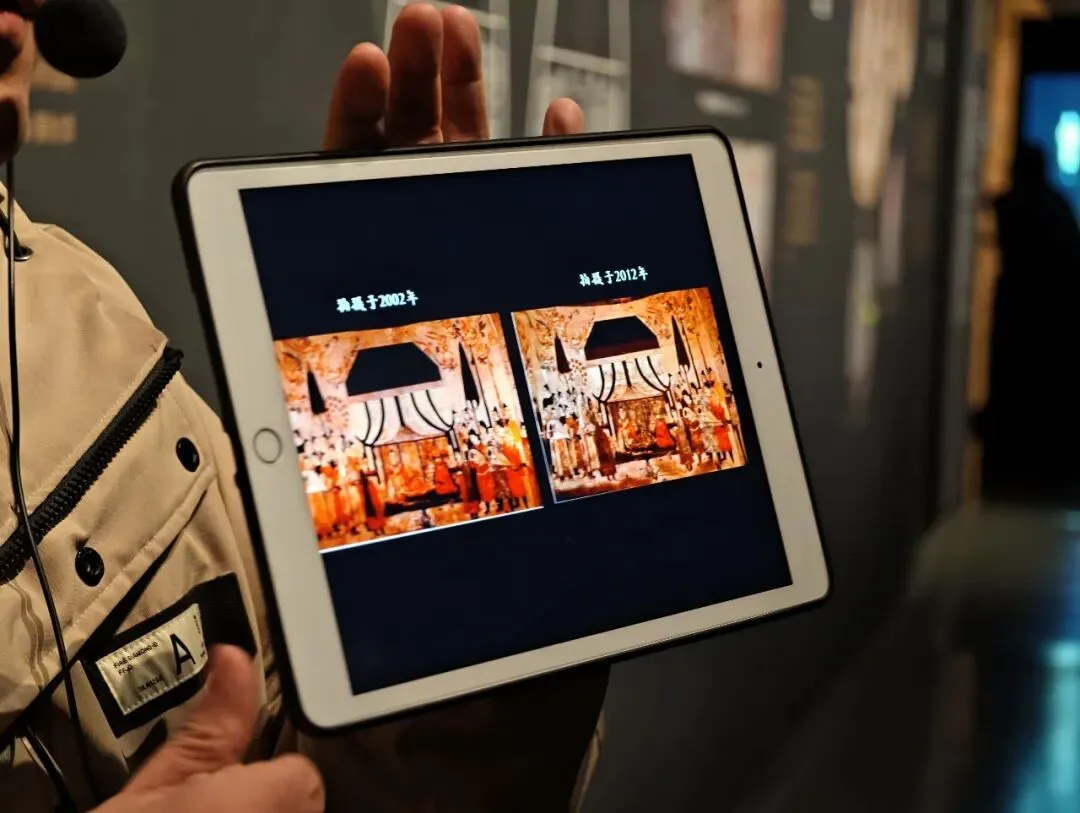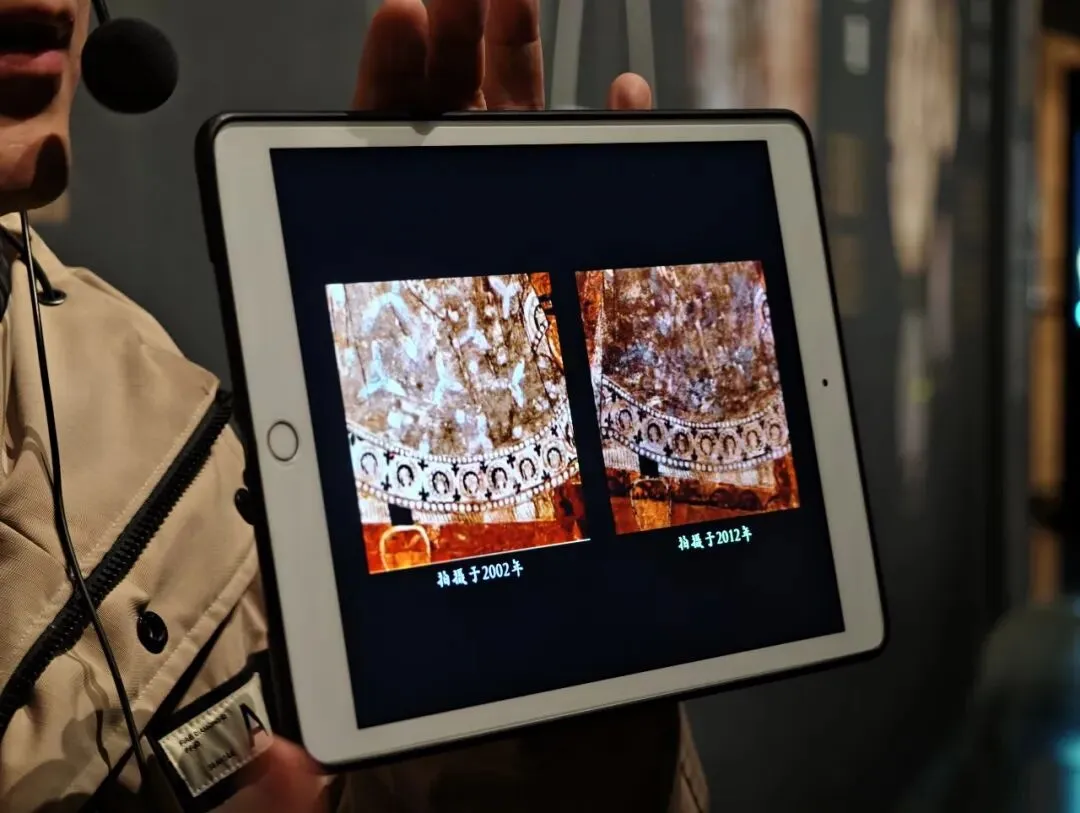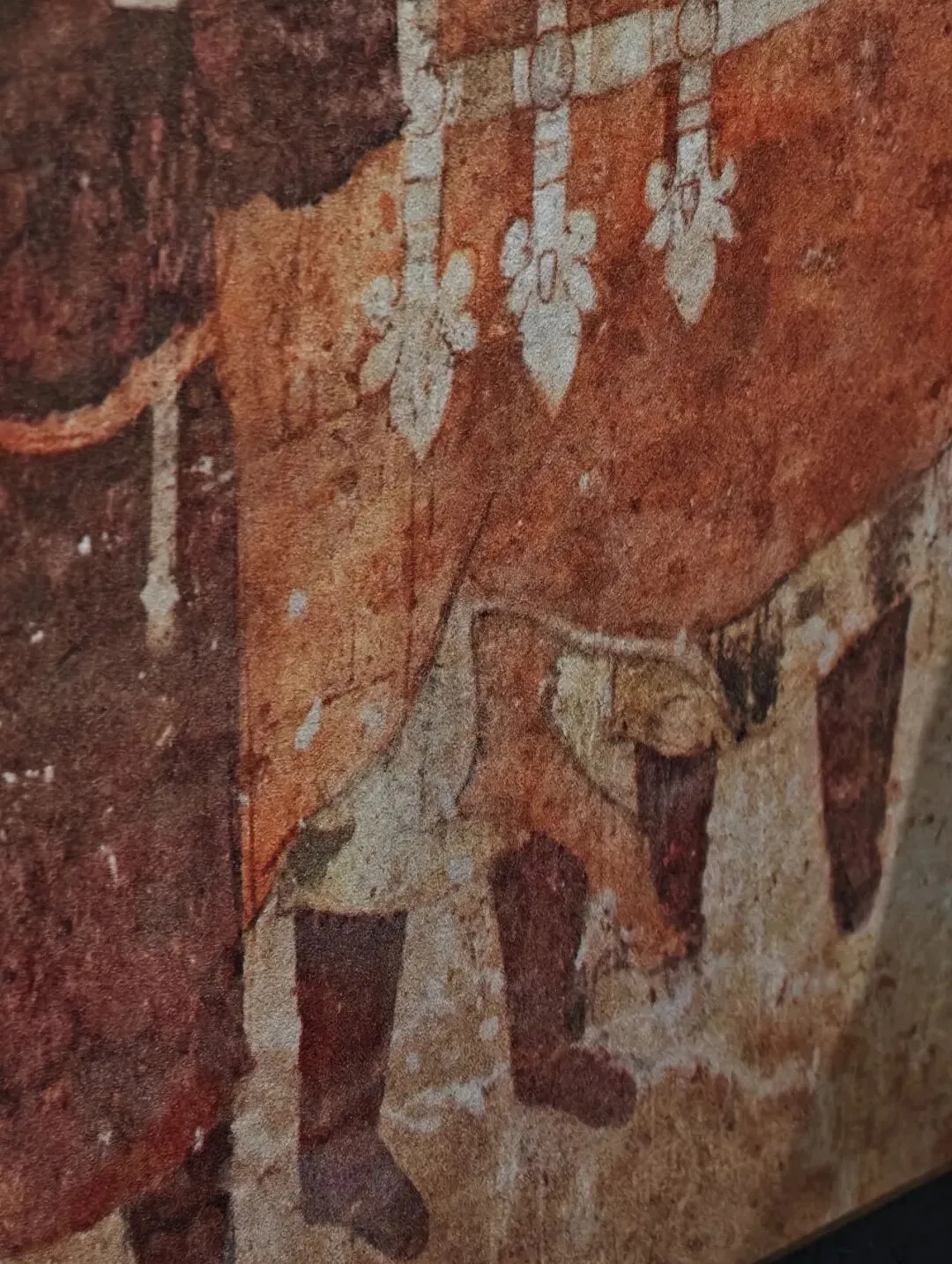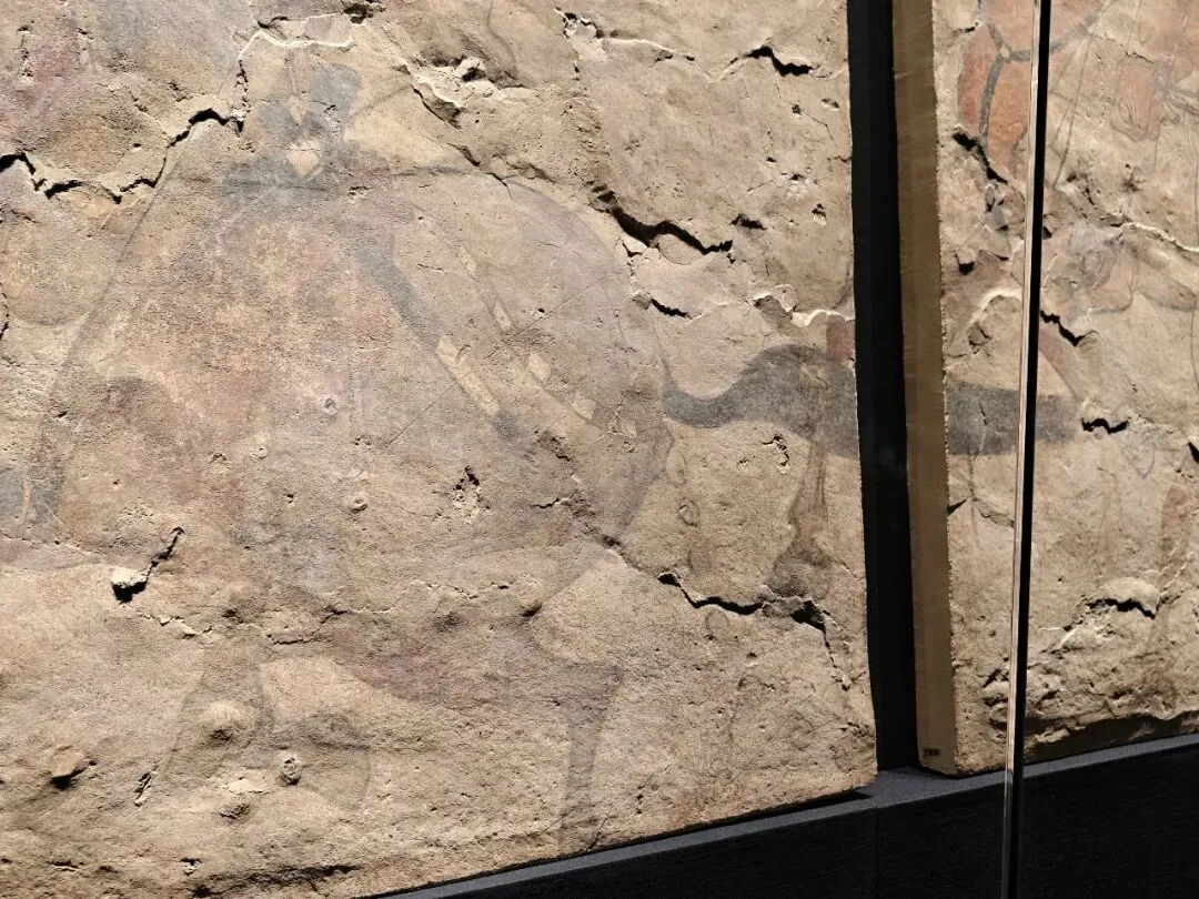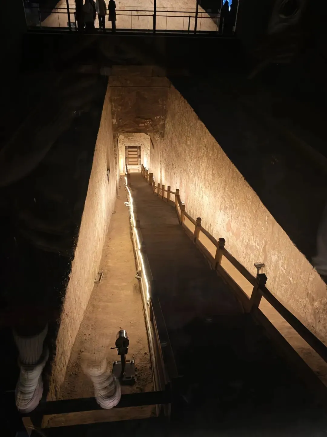 一进去就能看到这幅北齐太尉、武安王徐显秀墓门楼图,这是博物馆的唯一复制品,真品在山西博物院,在博物院的时候已经看到过这幅门楼图。总的来说这幅画还是有很多纰漏,技艺与现代相比也差别很大,比如门开的方向,透视比例不对,人物全部闭眼、手都在袖子里(眼睛、手不好画)。这只神鸟是《门楼图》的核心元素,它长着狮子的头、鸟的喙、龙的颈、白鹭的腿、鹰的爪和凤凰的尾羽,是多种瑞兽形象的融合体,昂首守护在门楼之上,象征着守护与祥瑞。上面这个网状的东西叫罘罳(fú sī),设在屋檐或窗上以防鸟雀的金属网或丝网。可见当时的画师是严格按照北齐建筑刻画出来的,这么细节的东西都画上了。娄睿是北齐东安王、鲜卑贵族,其姑母为北齐奠基人高欢的正妻,地位显赫。这幅画主体为鲜卑贵族骑队,具体位置是在墓道东西两壁,分上下两层,上层为骑队,下层为步行仪仗,展现贵族出行的盛大场面,分成了三块。特色之一:马拉粑粑,几个圆球从马屁股里掉下来,很少有人画图会把这么细节的地方画出来。特色之二:中间这幅图中间这匹马,双目炯炯,无论从哪个角度看都似在注视观者,被称为 “马娜丽莎”。这可是1450年前的画,比蒙娜丽莎早了不少。特色之三:这幅图马背上的披巾是不是挺像LV的花纹的。现场看已经有点不清楚了,也是因为娄睿墓1979年发现出土的,过去这么多年颜色都退化了很多。而后面展厅要看的徐显秀墓是2000年发现的,直接原址保护,我们只能看VR和图片,墓还在脚下,这座博物馆也是为它所建。娄睿墓《门吏图》,作为墓葬仪卫体系的重要组成,与另一幅对称门吏图成对出现,象征守护墓门、驱邪镇墓。北齐狩猎图,直观反映北齐贵族 “尚武狩猎” 的生活习俗,印证鲜卑民族的游牧传统与北齐的贵族娱乐制度。出现在壁画里的人物形象,最下面有胡人,那个时期胡汉融合也是文化的融合。出土于九原岗墓葬的《升天图》,穿丁字裤的 “风伯”,右手攥着一个口袋,即传说中的 “风袋”,打开袋口即可吹出飓风。形象源自《山海经》,风伯是中国古代神话中的风神,负责兴风作雨。畏兽,是北朝墓葬中驱邪镇墓、引导升仙的核心符号,形象融合了中国传统瑞兽与西域神兽特征,是胡汉文化交融在神话艺术中的具体呈现。风伯与雷公、畏兽、骑龙仙人等形象共同构成了引导墓主灵魂升仙的宏大场景,反映了北朝贵族对死后世界的想象。听累了的小朋友又开始了在博物馆找不挡人的角落边休息边听的模式。在真实的徐显秀墓中,石门下部原本雕刻着青龙、白虎,后来被用颜料改绘成祆教神鸟,这扇铜门就将这一 “改绘” 的历史细节以浮雕的形式凝固下来,成为解读北齐文化交融的绝佳入口。2000年被盗墓贼发现,后来原址保护在这里建起了博物馆。墓主徐显秀,这一生还是跟随了高家几代君主,60多岁迁太尉,执掌全国军事大权,70岁就去世了。墓道边上看到有个像窗户的东西,问老师才知道这是后面其他人的坟墓,看来这一块地方风水确实好。他的墓志,详细记录了他的家族世系、完整的官职迁转与重大战功。镇墓武士陶俑,呈现出鲜明的胡族特征,是北朝民族融合的生动体现。墓葬就在这下面。他的墓比娄睿墓晚了很多年,技术更先进了,所以直接原址保护,恒温恒湿,最大限度保护千年前的墓葬壁画。所以这个展厅温度会比其他两个低一点,而且公益讲解不会进来,避免大量人群集中在这里,影响整体的空气。其他就只能看图画了,还有个VR眼镜可以戴着体验一下,还能看到当时的盗墓洞。壁画中的场景,反映徐显秀出行前备马场景,中间这个人拿着的是胡床,相当于我们现在的马扎。墓主夫妇宴饮图。他身上这个皮衣一看就是当年的喜好,才会画在墓葬里。北齐画风好写实,跟前面画了马粑粑一样,这里还画出了牛的生殖器。比如上面男主人在右边,但是马在左边,而应该乘牛车的女主人在左边,对应的确实马。这里右边红色衣服的男子应该是在吹笛子,笛子忘了画。出现这些原因大概率是因为徐显秀封王较晚,还没来得及好好修自己的陵墓就死了,画师得赶工赶紧画完才能下葬,所以才有这么多问题。再加上那时候的画师也不知道多年后会考古打开,既然是墓葬里面的壁画,那随意画画就好了,反正也没人会看。如果真要看古代的各种精美艺术,应该是看各种书法真迹、寺庙建筑这些,墓葬里面的水平是最低的。而娄睿墓的水平要比徐显秀墓的水平高,是因为他早就是贵族了,早就开始修自己的陵墓,不像徐显秀这样匆匆忙忙。而且正常的墓道有四层,徐显秀墓也少了一层,也说明了当时修建的时候太过于匆忙,因为一层一层等干都要等很久,他已经死了急着下葬。出土的龙柄鸡首壶。这边的文物不多,很多都在太原市博物馆里能看到。第三个展厅叫“简易标美”,这是北齐绘画的典型风格,线条简练流畅,人物面部刻画生动,衣纹褶皱一笔带过,没有多余修饰,具有强烈的写实感和现代速写的韵味。这个展厅主要展示了娄叡墓壁画、九原岗墓壁画、水泉梁墓壁画。运用了从西域传入的凹凸晕染法,通过淡红晕染人物面部和衣袍,塑造出立体感,这种技法直接影响了唐代绘画的发展。忻州九原岗北朝墓《升天图》,雷公这种画法在中国古代大同小异。仙人乘龙。里面的很多元素需要读读《山海经》才知道。看下图这壁画上有一些笔直的蓝色线条,是盗墓贼进去