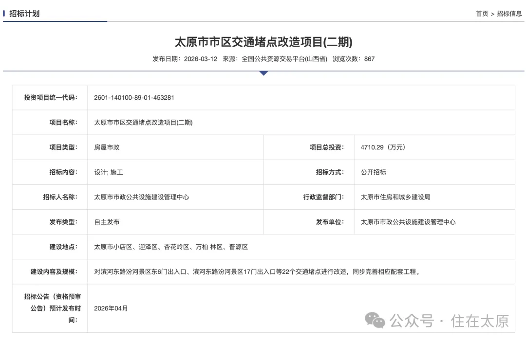 3月12日,官方发布了太原市市区交通堵点改造项目(二期)的招标计划。太原市市区交通堵点改造项目(二期)总投资4710.29万元,招标内容包含设计; 施工。