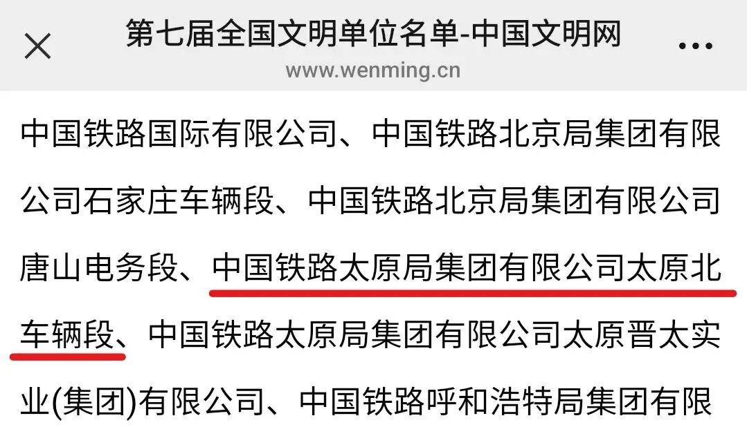 5月23日,中央宣传思想文化工作领导小组发布《关于认定命名第七届全国文明城市、文明村镇、文明单位和第三届全国文明家庭、文明校园的决定》,中国铁路太原局集团有限公司太原北车辆段被授予全国文明单位称号。