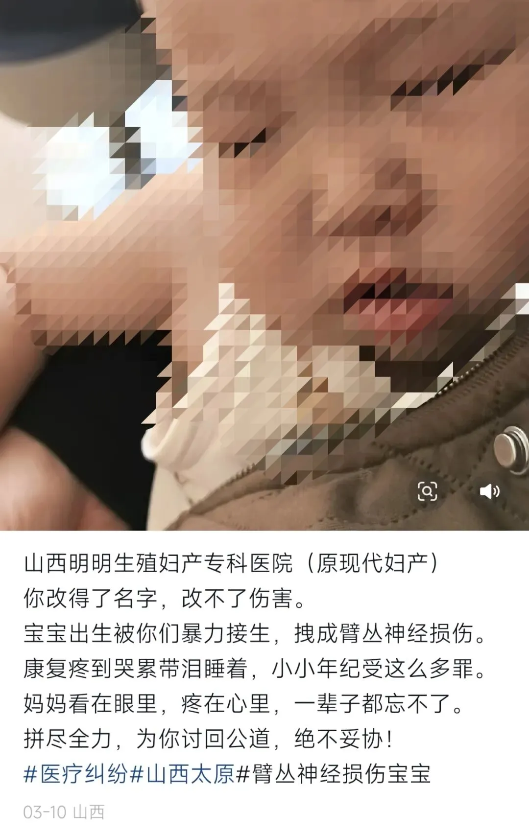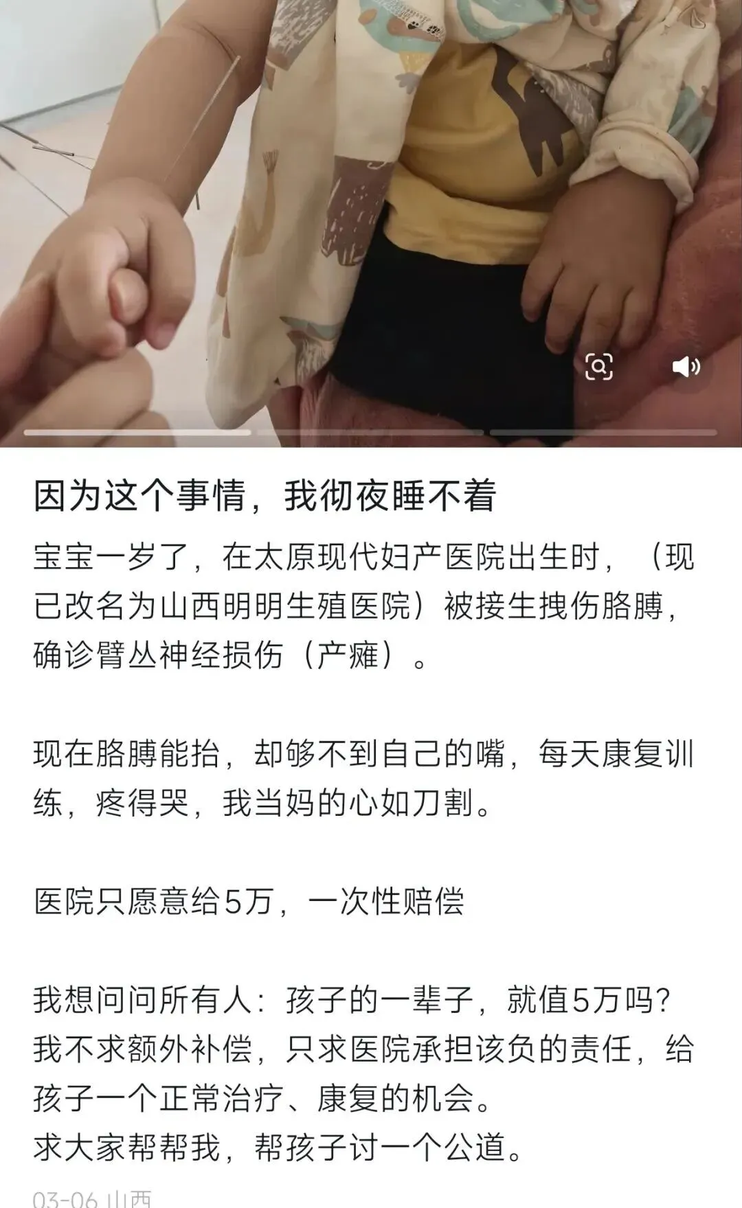 据山西一位宝妈在网络爆料:2024年12月23日在山西现代妇产医院顺产造成新生儿臂丛神经损伤(产瘫),医调委责任认定后医院只愿意赔付五万,现已起诉维权。