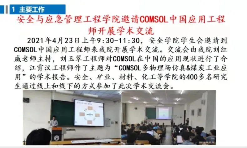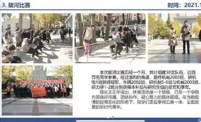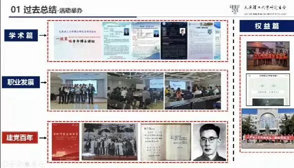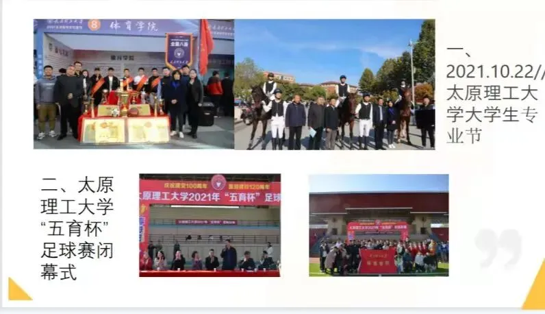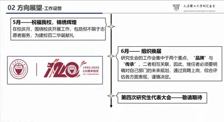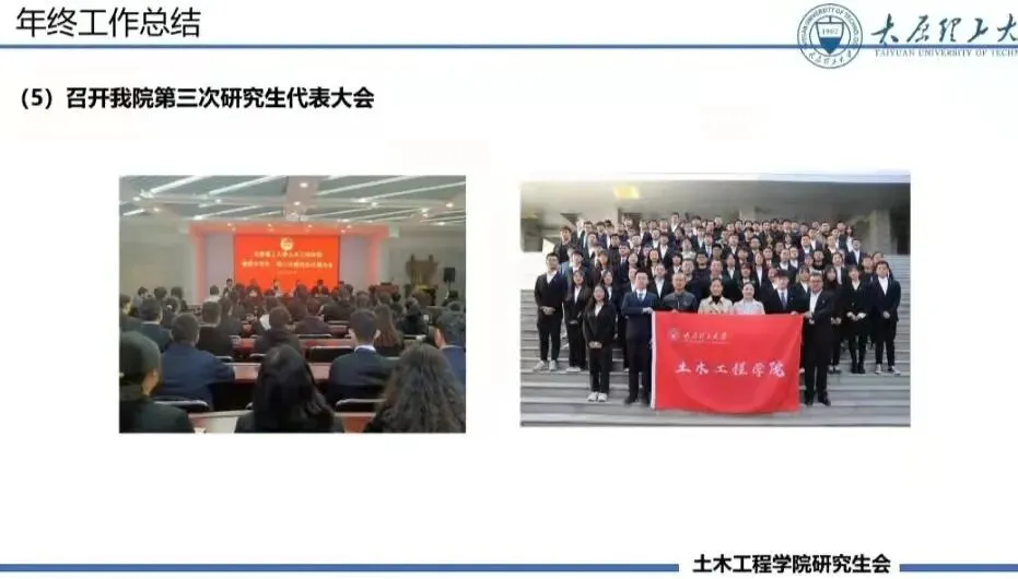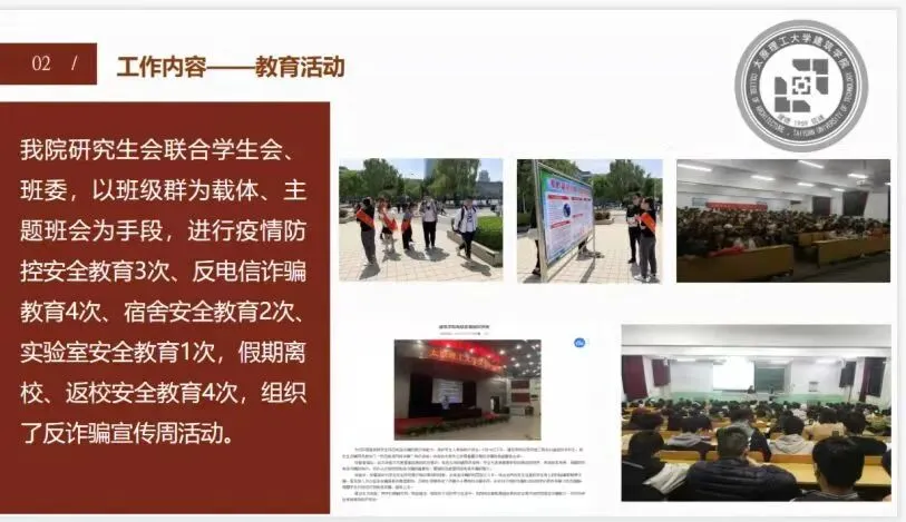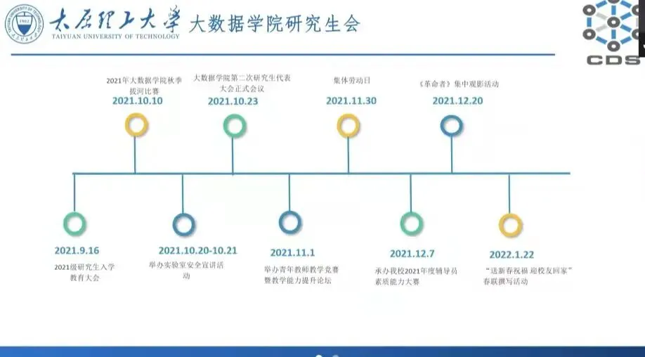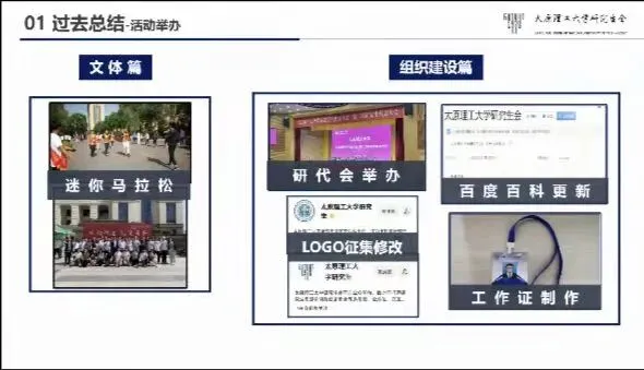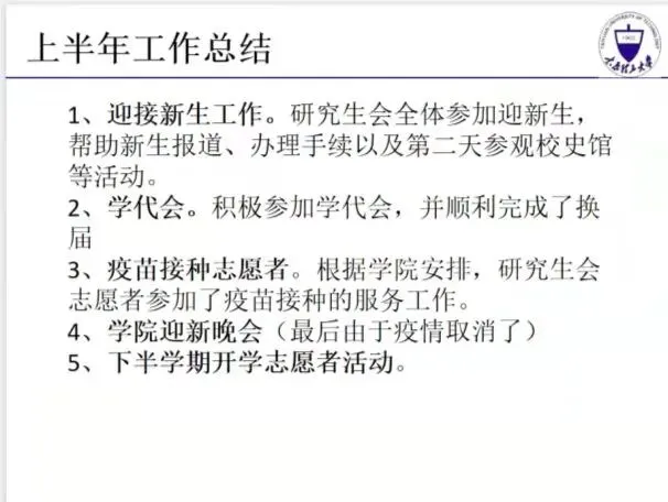本院研究生会参与了返校研究生防疫志愿活动和迎新志愿活动,举办了各类文体活动如庆祝建党百年大合唱、运动会、迷你马拉松、研究生集体劳动日活动等,也召开了多次学术海报展、国奖事迹交流会,参加华为杯数学建模竞赛并获得优异成绩。同时,注重对研会干部的培养工作,开展专项技能培训,完善研会制度管理。本院研究生针对学院师生情况、为加强师生之间联系,邀请导师一同参加开展了趣味运动会。信息与计算机学院研究生会负责人分析了研会内部还存在的问题,并同时对研会的未来发展做出规划。本院研究生会在过去的一年中,开展了各类讲座如:“行为规范与办事流程“、”谈心论道——如何与情绪相处“等讲座。同时,为深入推进党史学习教育、提升我校审美教育水平,”艺术之光“大讲堂美育系列讲座正式开讲。在学术氛围建设中,开展“阅读经典 以文化人“读书专项活动、各类论坛与学术讲座、考研经验分享会,同时积极参加各类竞赛并取得优异成绩。最后艺术学院负责人指出,在即将到来的百廿校庆中,艺术学院同艺术学院研究生会将更加积极的去主动参与校庆活动中去。本院研究生会以红色教育为主题,强化思想引领,组织党史学习教育专题党课、八路军太行山纪念馆实践活动等,开展系列团课培训,并通过举办研究生优秀学术海报评选活动加强学术学风建设。未来将结合马院实际情况,充分发挥研会在学生与学院中的桥梁作用,力争为同学们争取甚至创造更多学习资源和锻炼平台。 本院研究生会配合学院开展迎新生、参观校史馆活动,并组织志愿者参与新冠疫苗接种服务工作;未来将协助学校做好防疫工作,并积极主动的参与所有校庆工作安排,为校庆工作活动做一切准备。 本院研究生会召开了第一次研究生代表大会,开展党史教育学习以及党的十九届六中全会精神主题团日活动,以“服务同学”为宗旨,不断强化自我管理,通过组织学习反间谍法,使学生提高国家安全意识。未来将在稳步建设研究生会结构体系的同时,努力做到为学生服务,尽可能多的为同学们带来优秀的、活泼的、有意义的课余学习活动和娱乐活动。本院研究生会开展“五育杯”篮球赛,冬季拔河比赛,营造积极校园文化,创办水利专业学术交流平台,举办“博士论坛”活动,加强学术氛围。未来将紧密围绕学校的奋斗目标和主要任务,开展形式多样内容丰富的活动,不断探索新的工作体制和工作方法,提高研究生的综合能力素质。本院研究生会结合自身学科特点,积极协助“栋梁·山西站——纪念梁思成先生诞辰120周年展览”活动,宣传文化遗产保护理念,通过线上问卷链接方式收集学生问题反馈,保护学生权益,并通过论文写作指导、举办竞赛分享会、模拟面试等活动致力于学院的学术提升及职业发展。未来将以“无私、奉献、高效、创新”的工作精神,积极完成各项任务,弥补不足,发扬长处。本院研究生会组织研究生们参与学院组织的双周论坛学术交流,研究生国家奖学金获奖事迹宣讲会,实验室安全教育,研究生防诈骗知识竞赛等活动,并成功召开第三次研究生代表大会。未来将继续认真完成学院与校研会安排的工作,更好地服务研究生团体。 本院研究生会邀请COMSOL中国应用工程师开展学术交流、为青年教师举办集体婚礼、举办研究生师生运动会、开展学术交流分享会和创新创业系列讲座。未来将拓宽工作思路,建立有效机制,探寻研究生会工作的新思路,新方法,提高研究生会的工作效率。