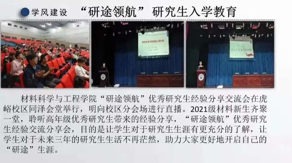 本院研究生会举办了第三次研究生代表大会,开展了“研途领航” 研究生入学教育,通过优秀学长寄语的方式对新生给予了肯定和鼓舞,举办了院内篮球赛活动、防艾知识竞赛活动,进行了扫雪除冰活动以及研究生安全教育,对各方面工作做出了反思与展望。材料学院院研会将继续在校、院各级党政的领导下,继续秉承“求实•创新”的校训,紧紧抓住机遇,勇敢接受挑战,知难而进,负重自强,研究新情况,把握新特点,适应新形势,创造新成绩。