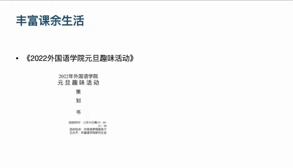 本院研究生会本年完善了研会组织,举办了“我为群众办实事”活动,在加强政治引领的同时,通过举办“元旦趣味活动”丰富了课余生活,最后外国语学院研究生会对新学期的工作做出了展望,分别在协助学校、学院圆满完成校庆工作及日常工作,经验分享交流会转为定期活动,重要时间节点活动提前策划,继续拓宽意见反映渠道,开辟工作新方法。