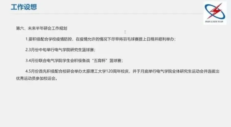 本院研究生会本年度成功举办了招新大会、五育杯篮球赛、研究生国奖事迹报告会、青年博士生讲坛、羽毛球赛、“强体魄、迎新生”拔河比赛,召开了第四期一流博士策略讲坛,对本年工作做出了反思并对新学期工作做出了设想。新学期、新起点、新希望,电气学院研会将继承和发扬过去工作中存在的优点,汲取经验,摒弃不足,满怀信心,以更清醒的头脑、更旺盛的斗志、更奋发的姿态和更充沛的干劲,向既定目标进发!