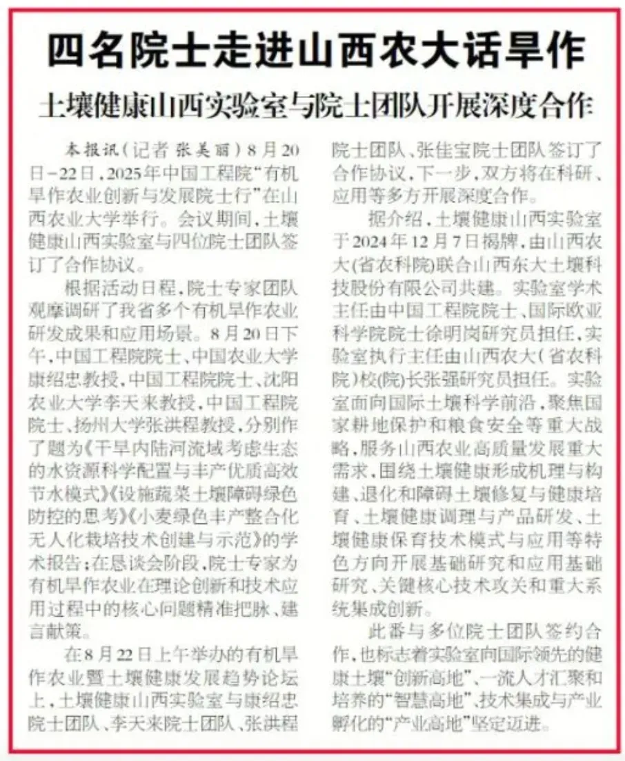 1、基础研究:解析土壤健康形成机理、退化过程与障碍因子作用机制,构建健康土壤评价指标体系。2、技术攻关:针对山西土壤肥力瘠薄、盐碱化、污染等问题,研发退化土壤修复、健康培育与调理产品,集成保育技术模式。3、平台支撑:提供土壤理化/生物/生态指标检测、污染溯源、修复效果评估等技术能力,形成从实验室到田间的全流程研发链条。(二)教学实训:培养高素质农业人才
