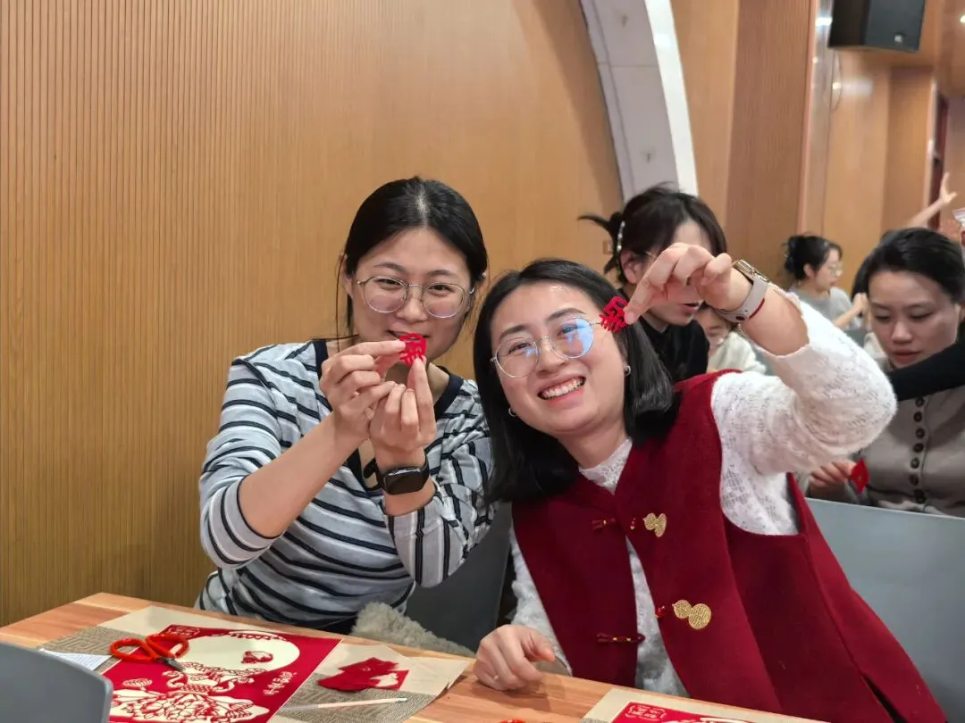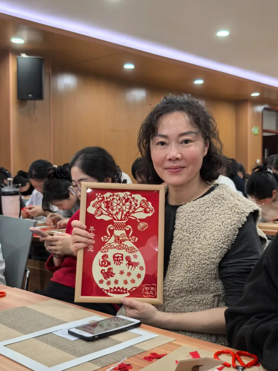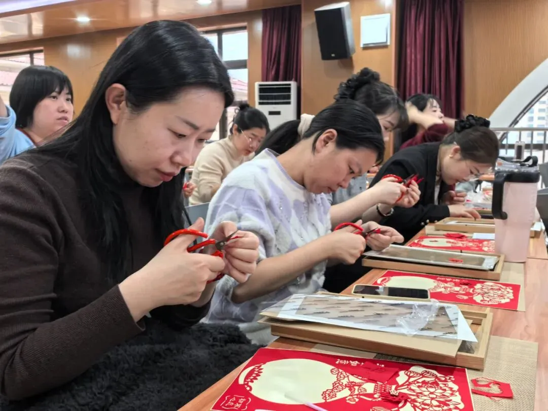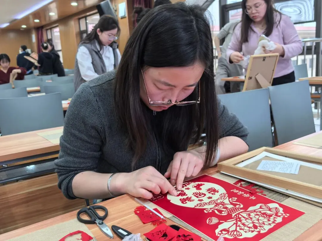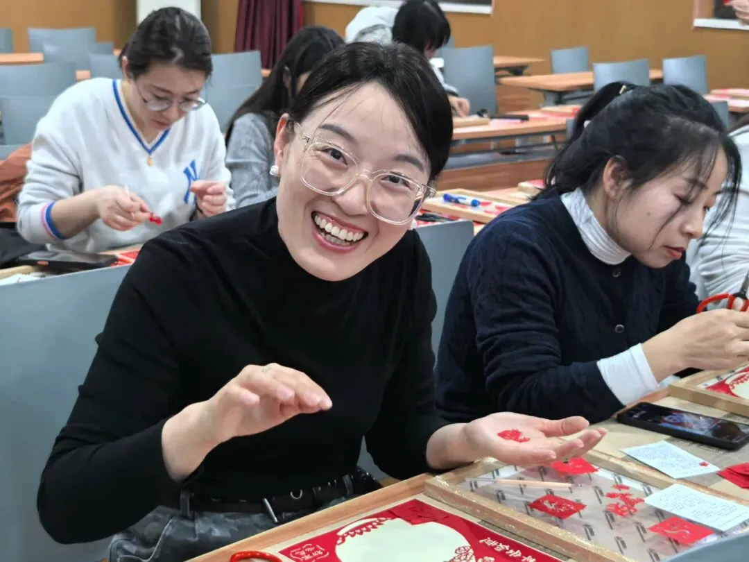 非遗剪纸传承老师现场授课,系统讲解剪纸文化与技艺,展示生肖、肖像等精美作品。在老师指导下,老师们以家人属相为灵感,潜心学习、精心创作,在折纸、勾勒、裁剪间感受传统技艺的魅力。一把剪刀、一张红纸,妙剪生花、寓意吉祥,现场气氛温馨热烈、其乐融融。