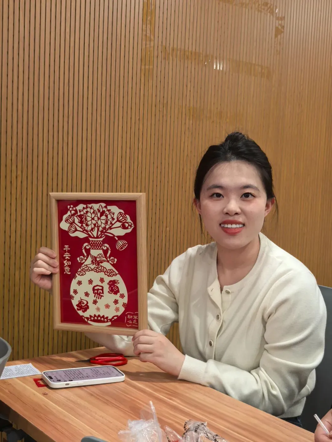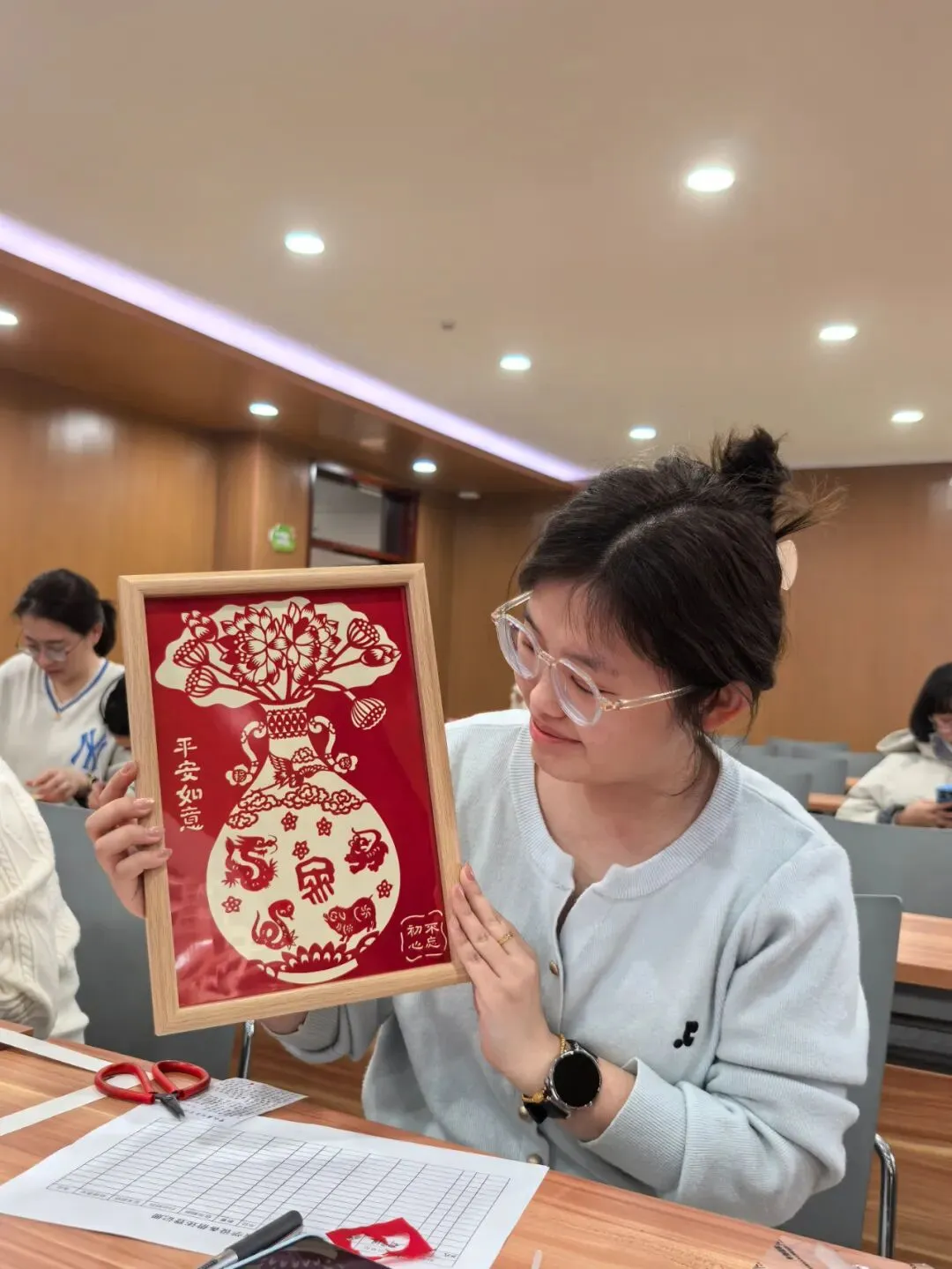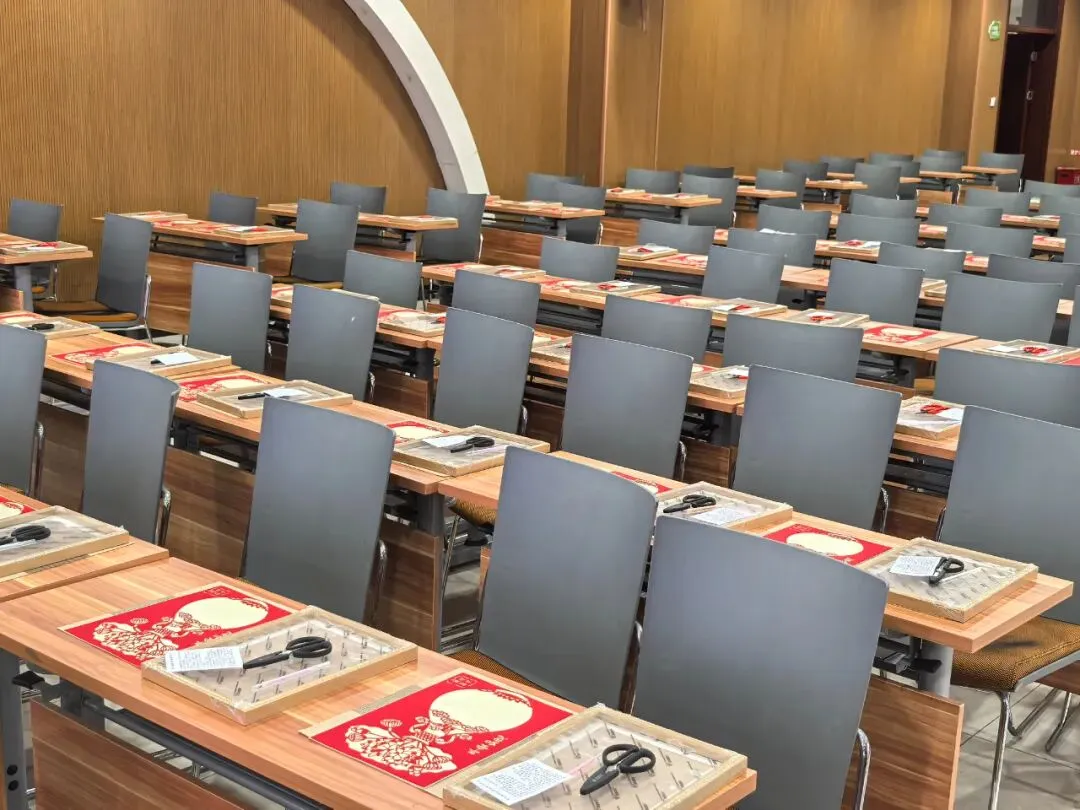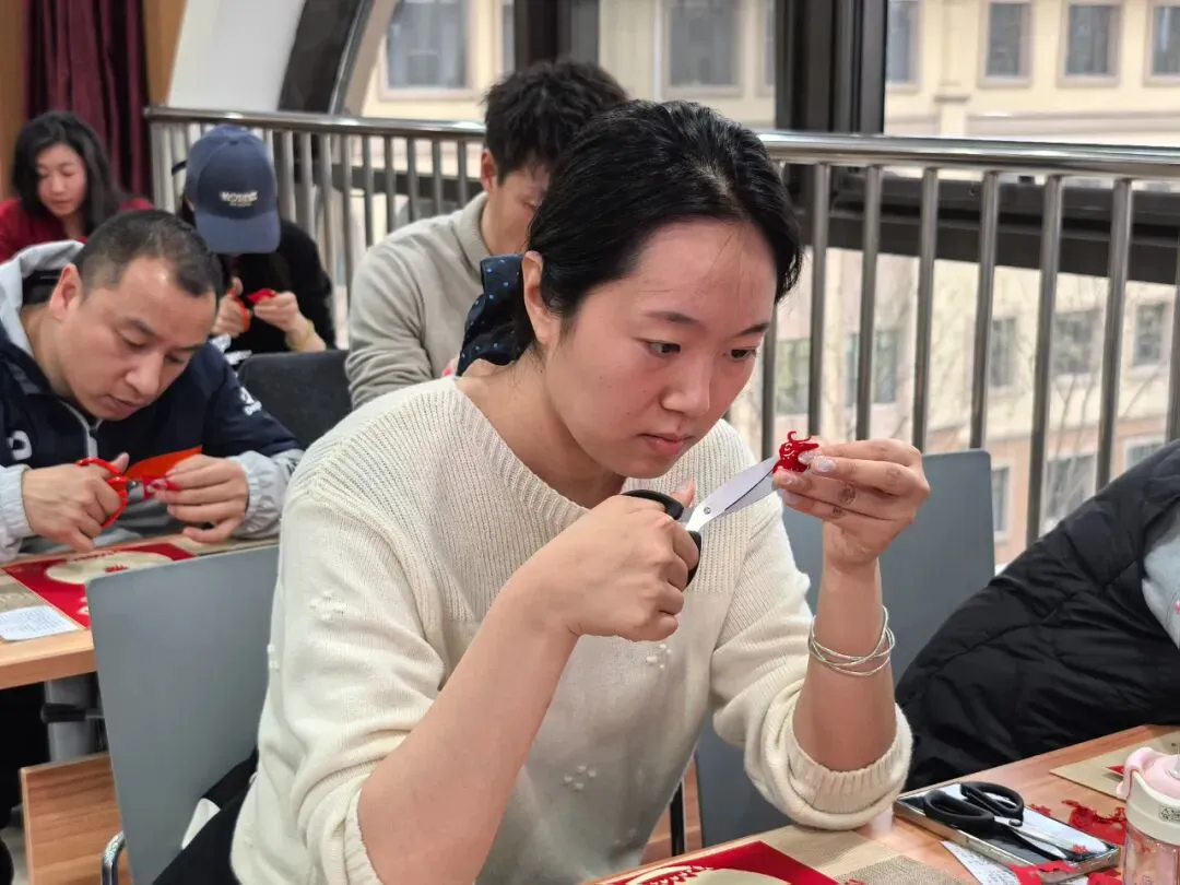 非遗剪纸传承老师现场授课,系统讲解剪纸文化与技艺,展示生肖、肖像等精美作品。在老师指导下,老师们以家人属相为灵感,潜心学习、精心创作,在折纸、勾勒、裁剪间感受传统技艺的魅力。一把剪刀、一张红纸,妙剪生花、寓意吉祥,现场气氛温馨热烈、其乐融融。