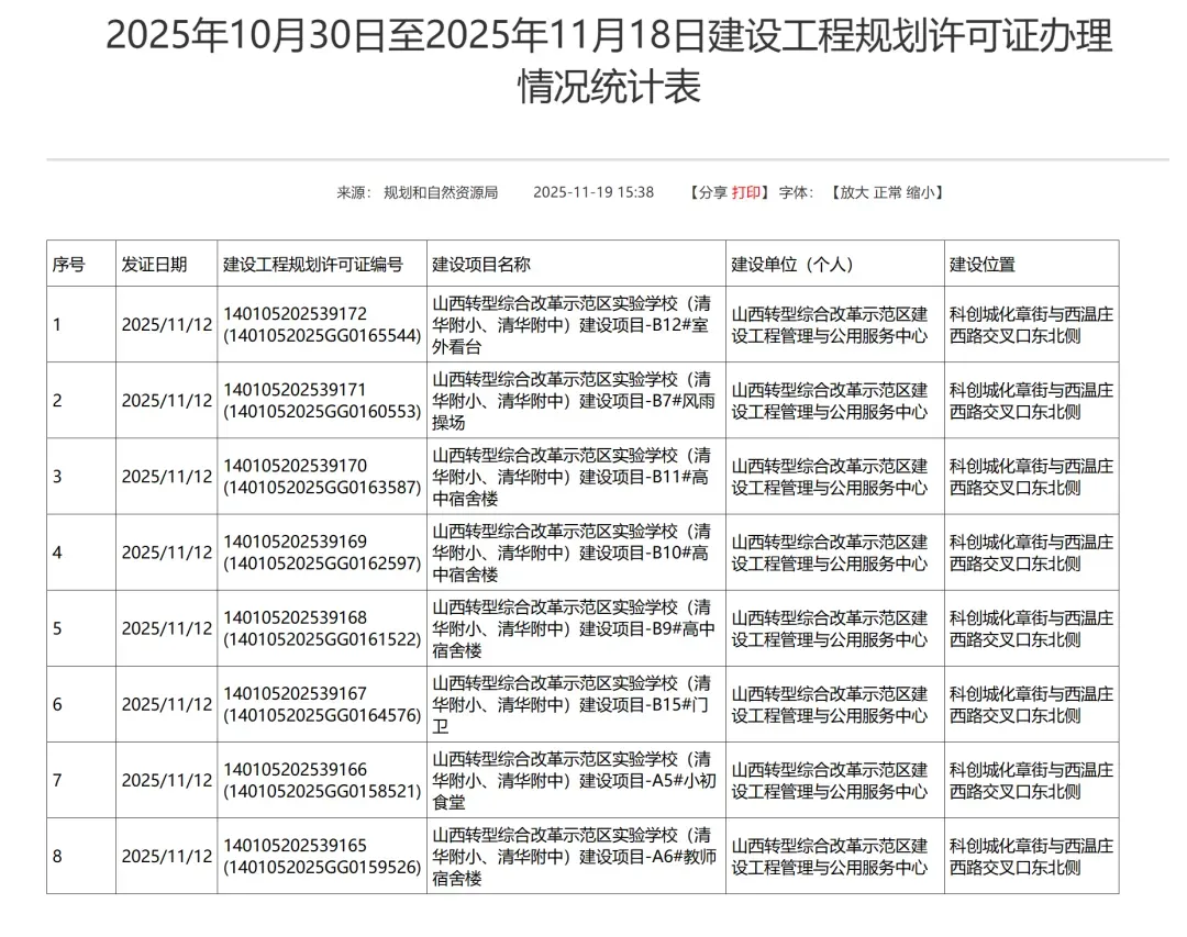 在2025年11月,山西综改区官网公示了清华附小、附中的最新实质性进展:8张建设工程规划许可证,包含:室外看台、风雨操场、宿舍楼、食堂等。上图来源:规划和自然资源局