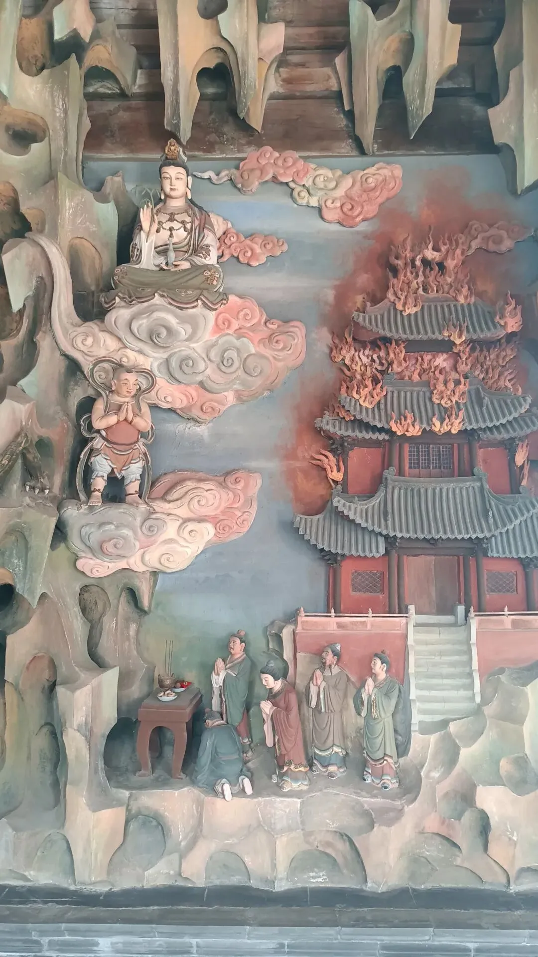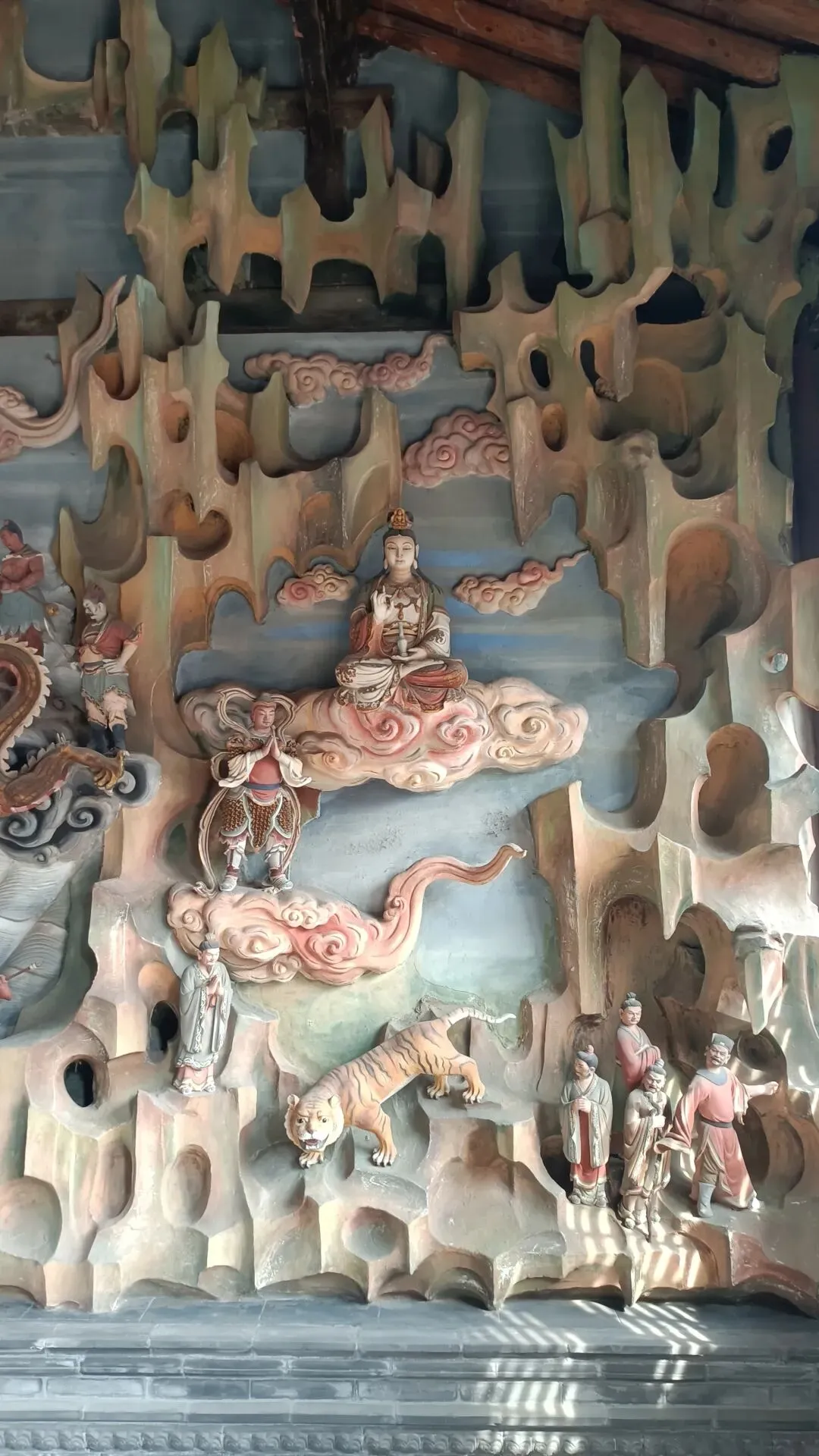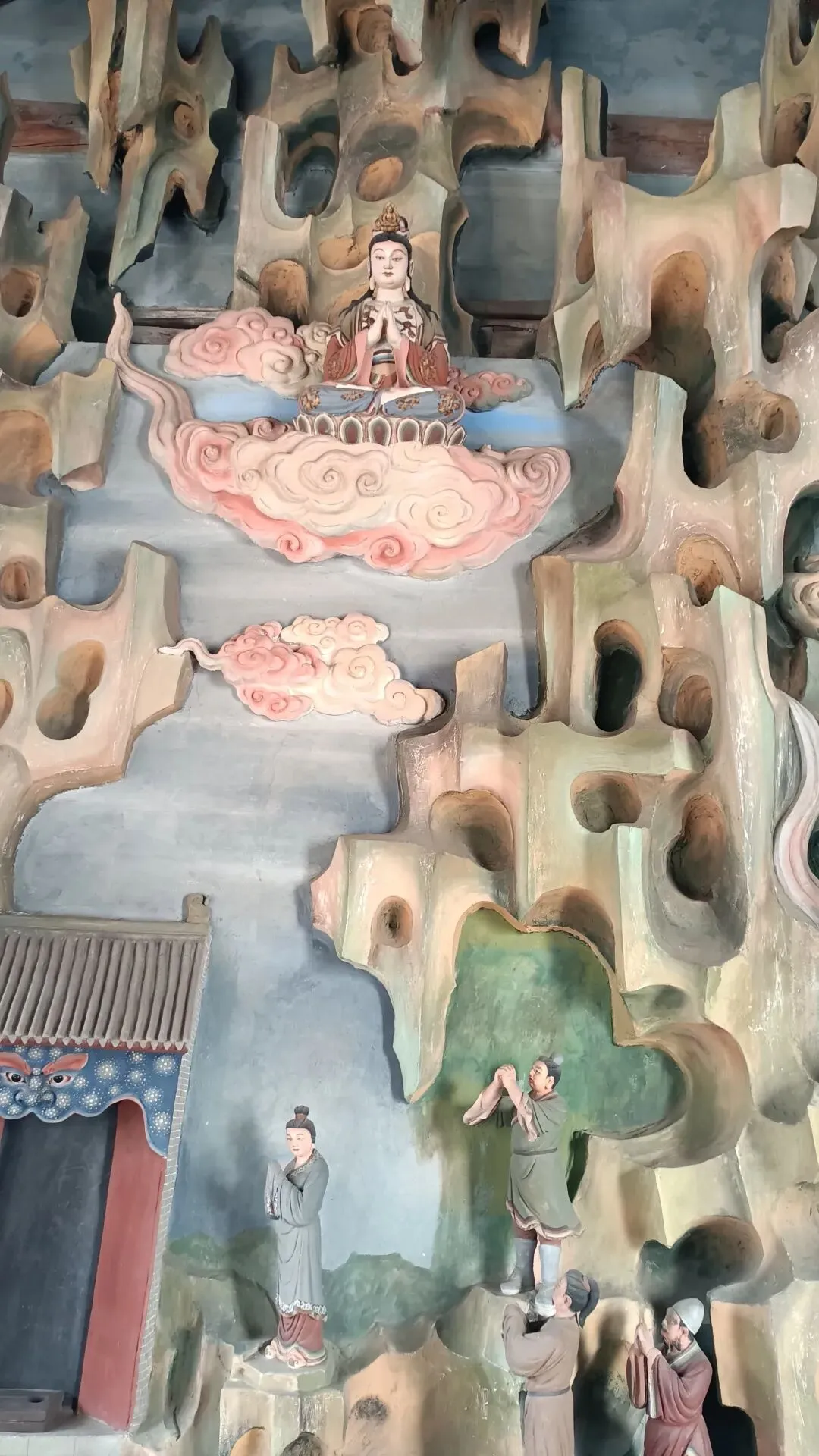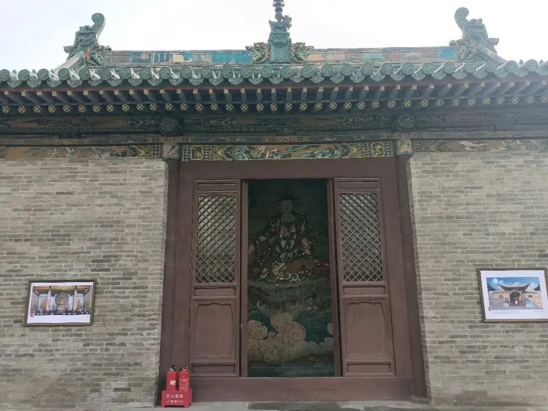 走进院内,山门与天王殿合体,简单朴素。门厅内两侧安放四大天王塑像。院内中心是大殿,也称“观音大士殿”。殿内神台上供观音菩萨说法塑像,塑像背后是自在观音壁画。两侧是观世音受难的八组悬塑。大殿前东西两侧是配殿,塑观音三十二应身悬塑,东配殿十六尊,西配殿十六尊。