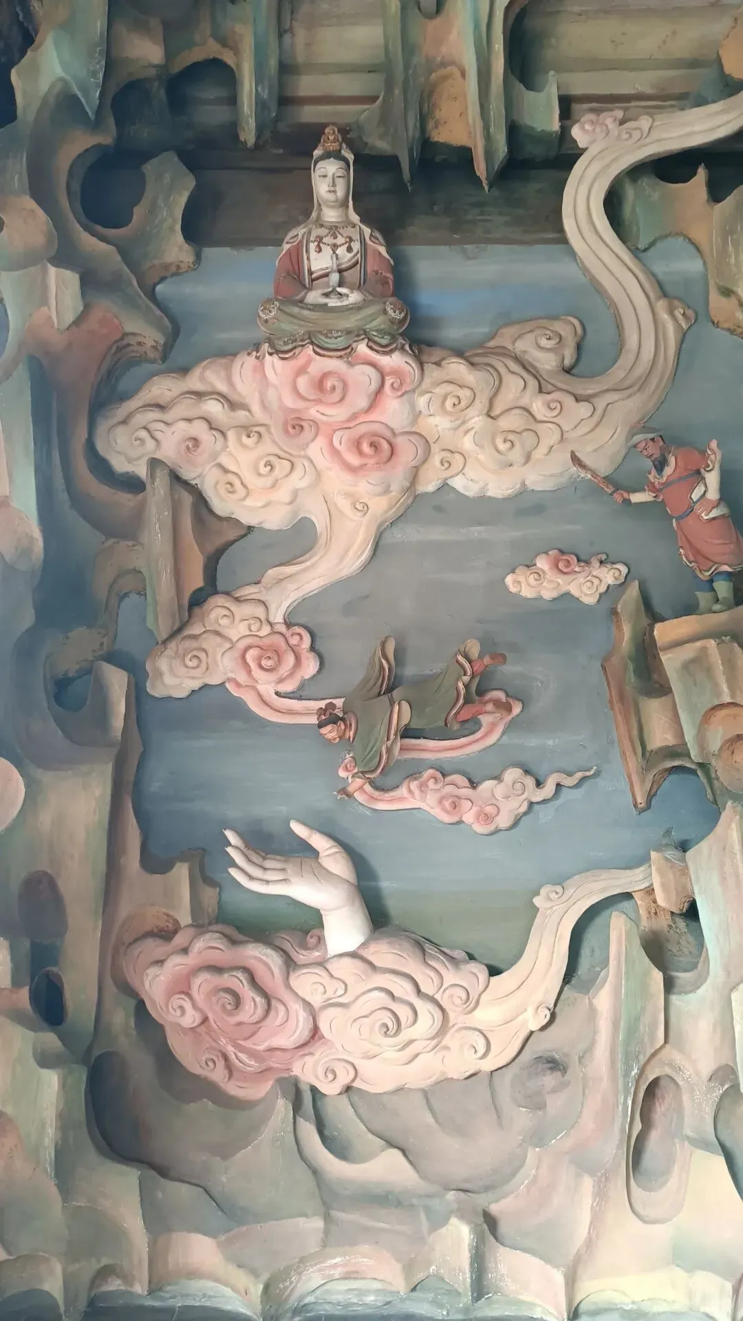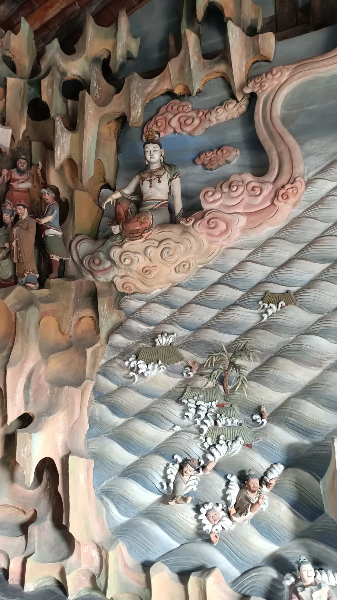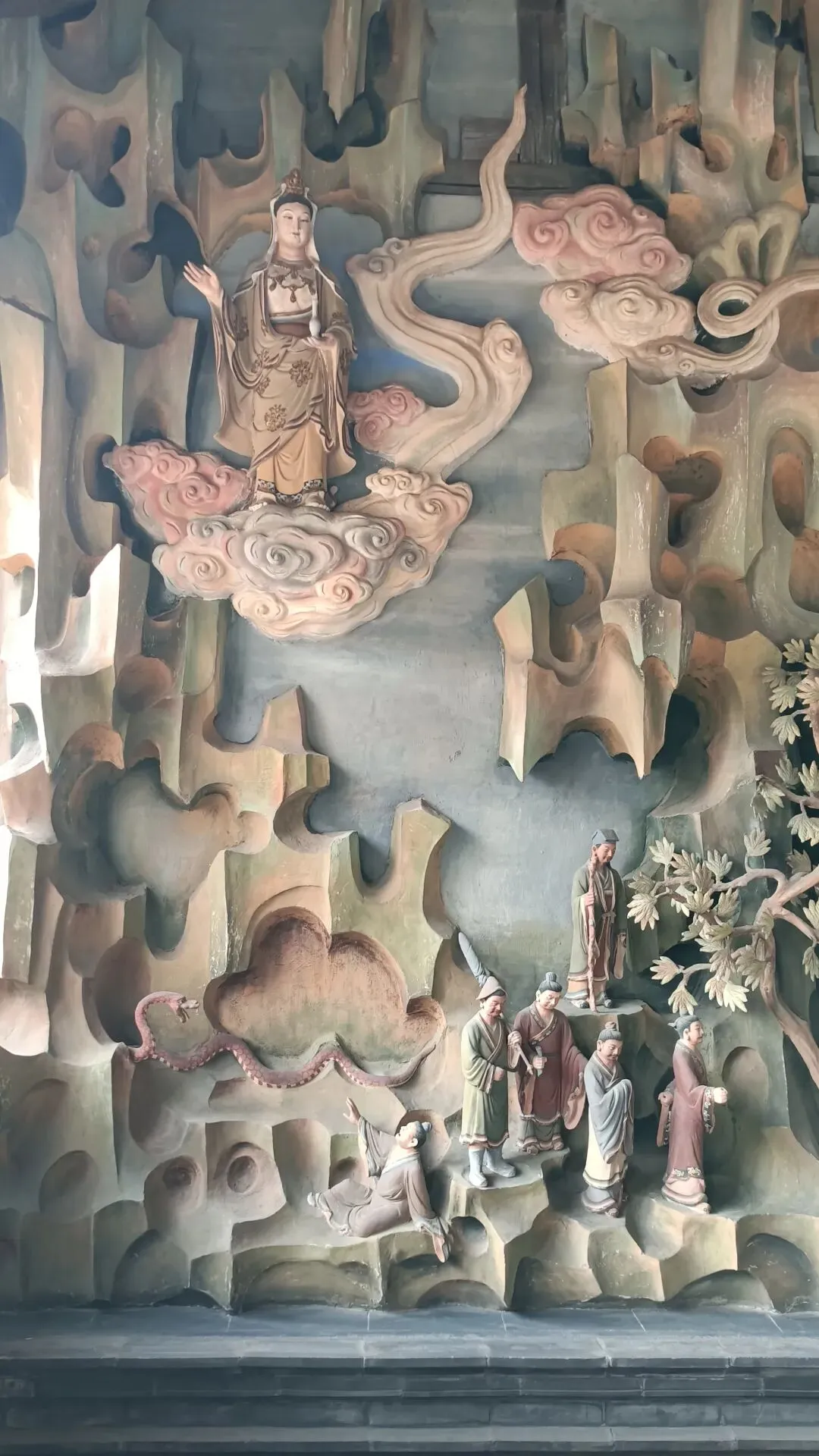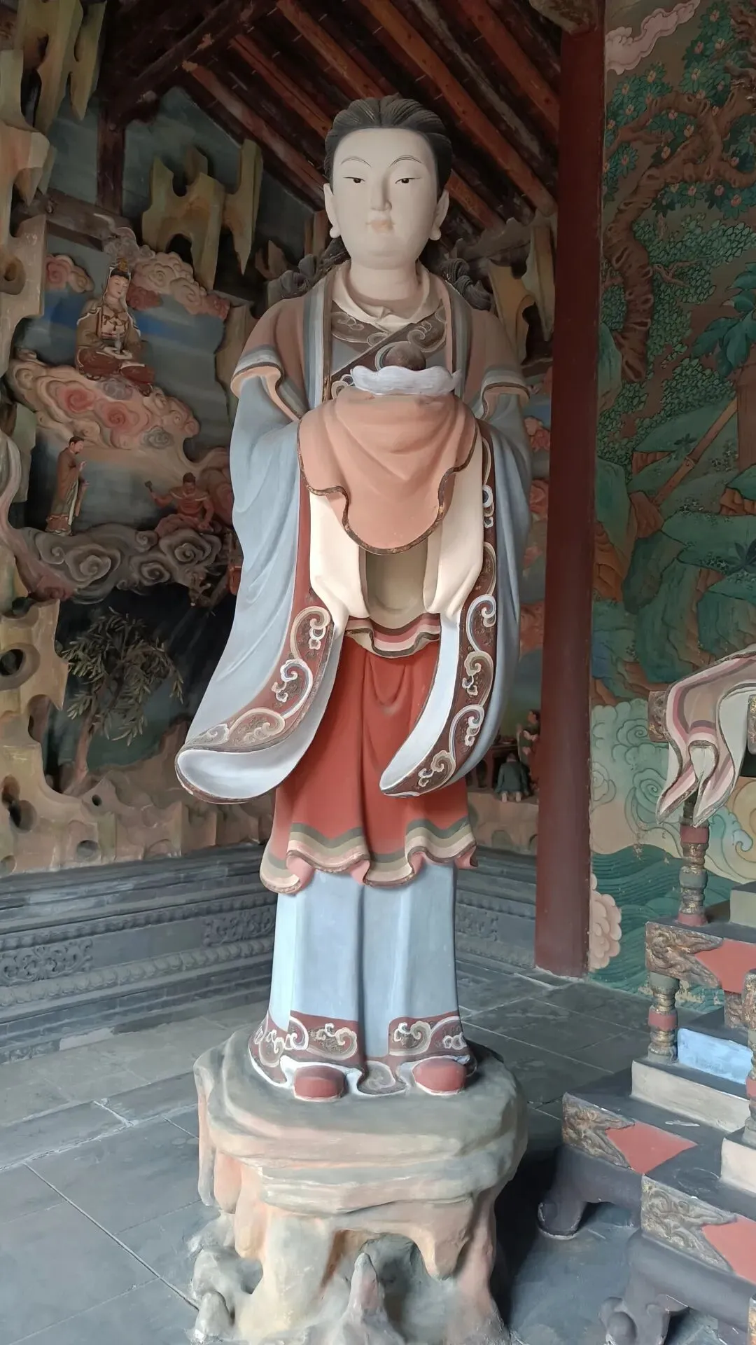 走进院内,山门与天王殿合体,简单朴素。门厅内两侧安放四大天王塑像。院内中心是大殿,也称“观音大士殿”。殿内神台上供观音菩萨说法塑像,塑像背后是自在观音壁画。两侧是观世音受难的八组悬塑。大殿前东西两侧是配殿,塑观音三十二应身悬塑,东配殿十六尊,西配殿十六尊。