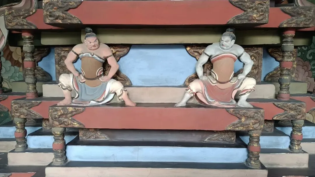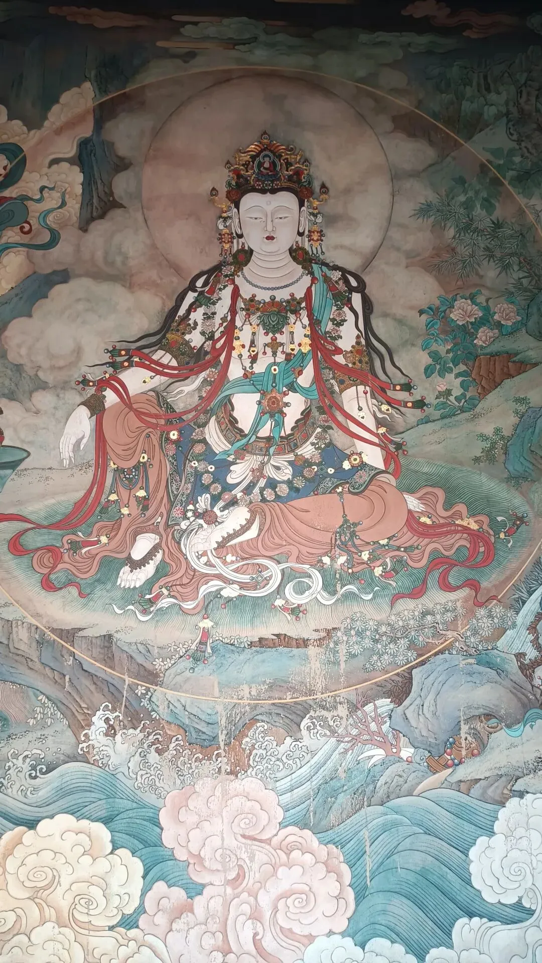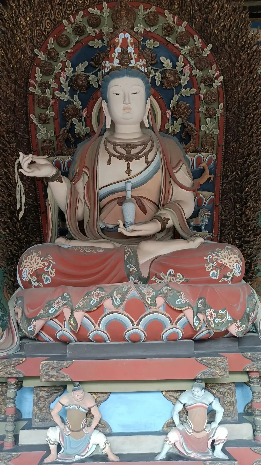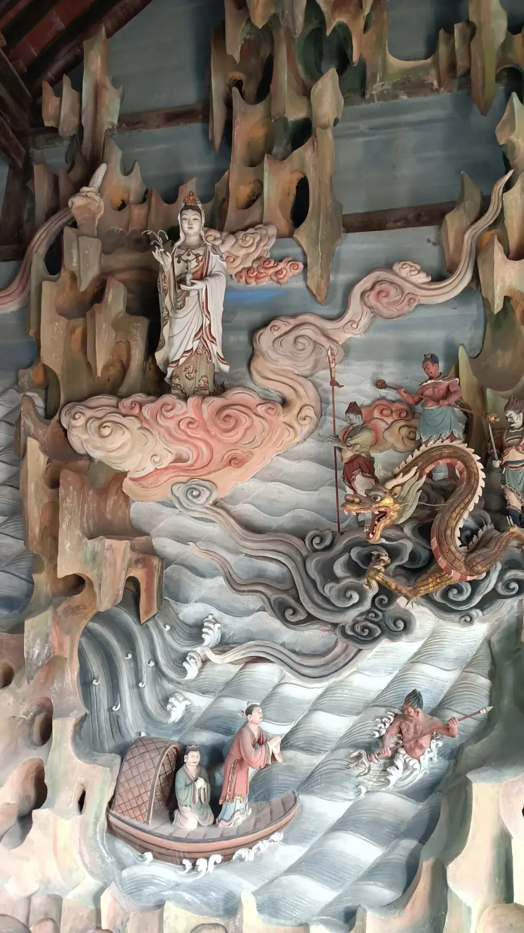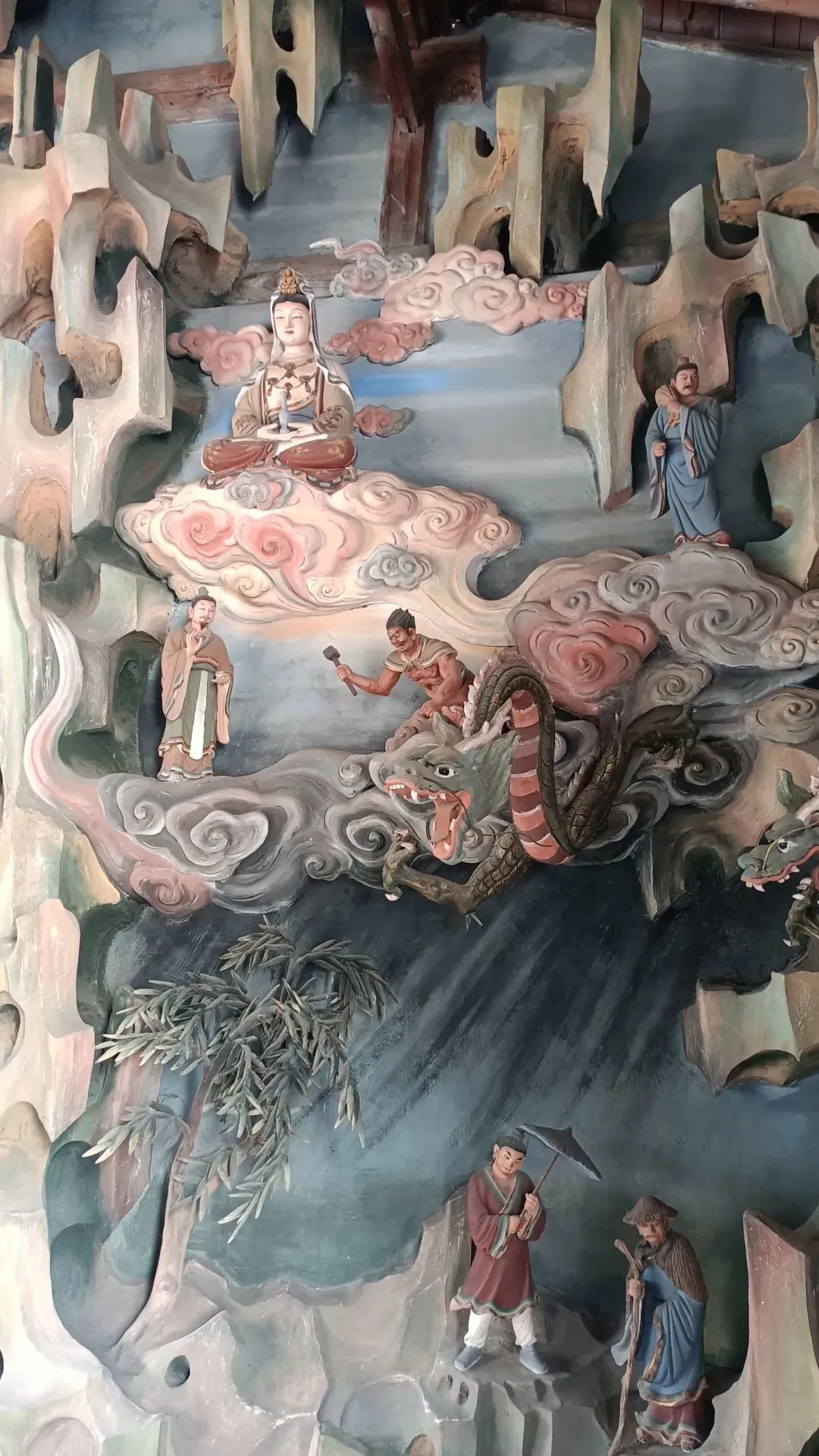 走进院内,山门与天王殿合体,简单朴素。门厅内两侧安放四大天王塑像。院内中心是大殿,也称“观音大士殿”。殿内神台上供观音菩萨说法塑像,塑像背后是自在观音壁画。两侧是观世音受难的八组悬塑。大殿前东西两侧是配殿,塑观音三十二应身悬塑,东配殿十六尊,西配殿十六尊。